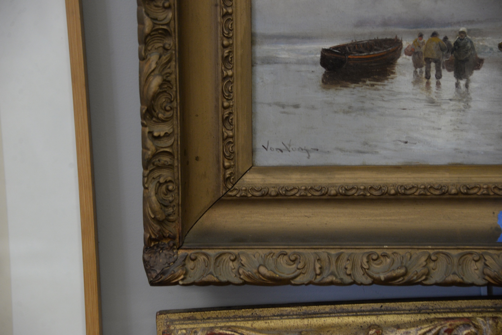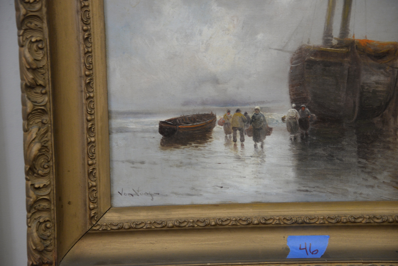 Lot 448: Von Voos (Dutch, 19th/20th century), Docked, oil on canvas, signed lower right “Von Voos”, 16 1/4″ x 20 1/4″.