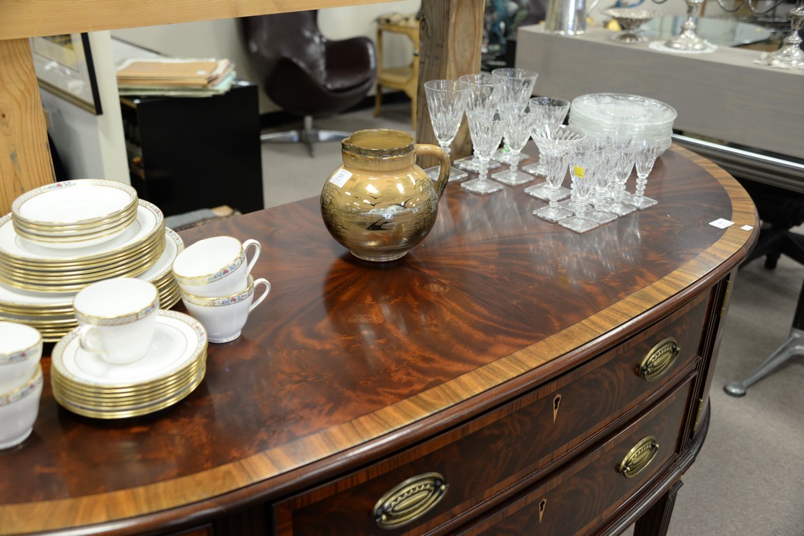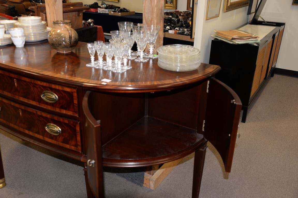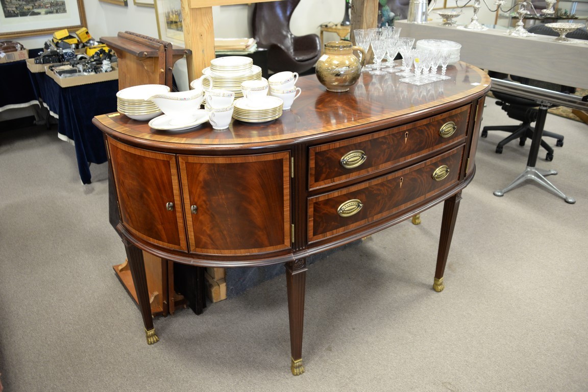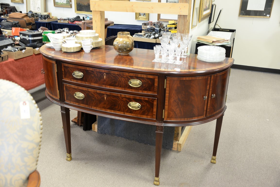 Lot 449: Councill mahogany sideboard with banded inlaid top and front. ht. 38in., wd. 67in., dp. 24in.