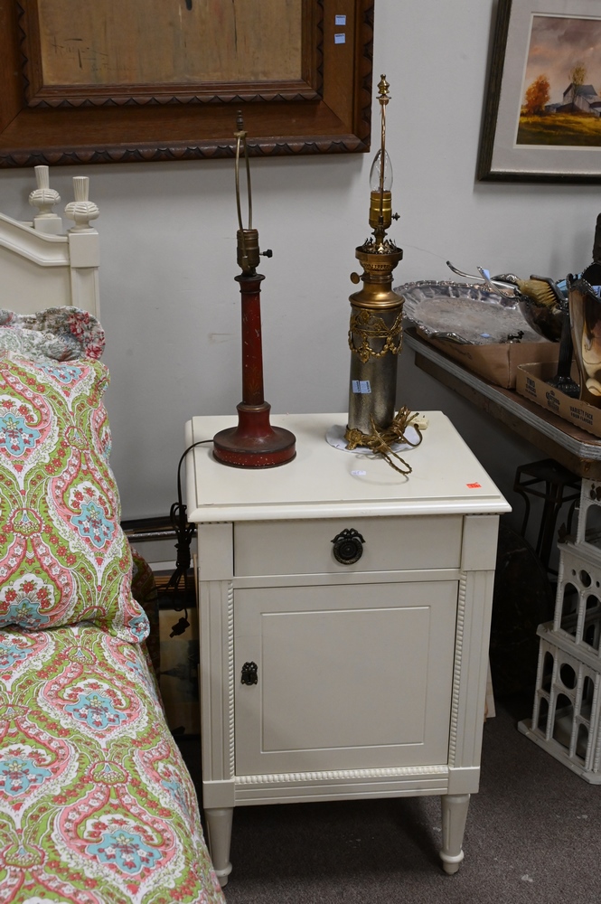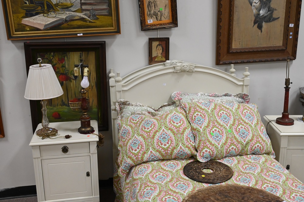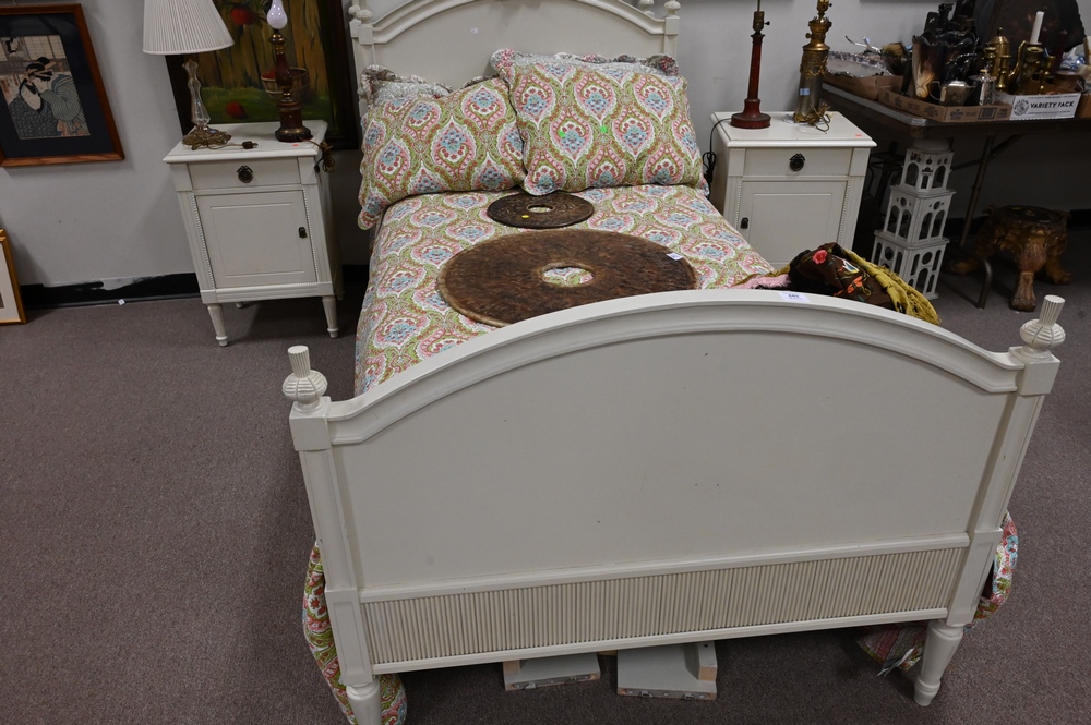 Lot 449: Four Piece Lot, to include a pair of custom twin beds with bedding along with a pair of custom night stands in cream paint, nightsta…