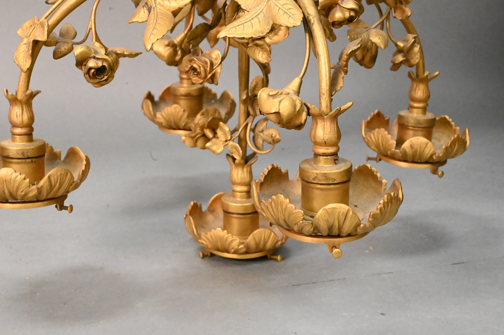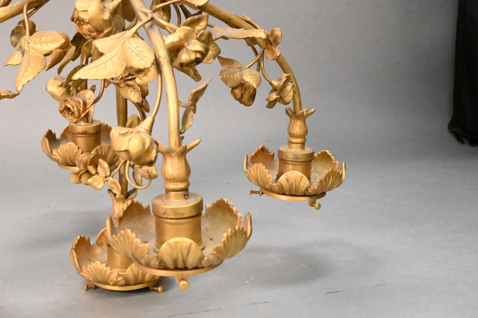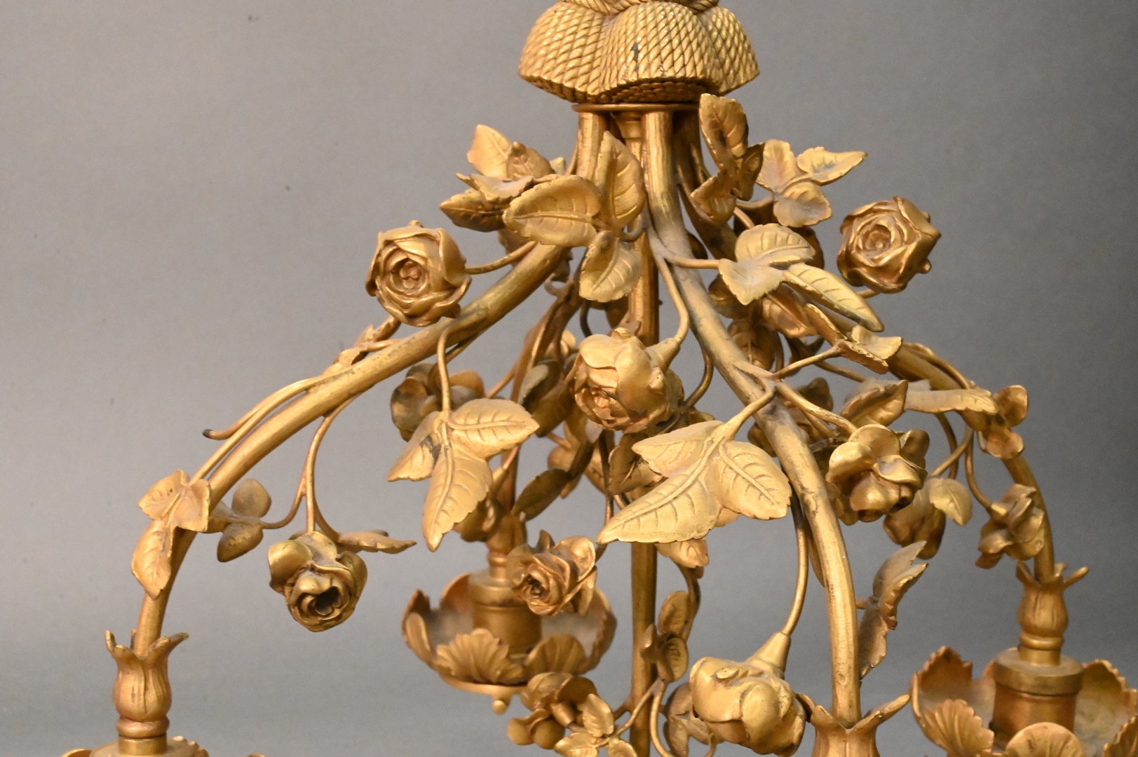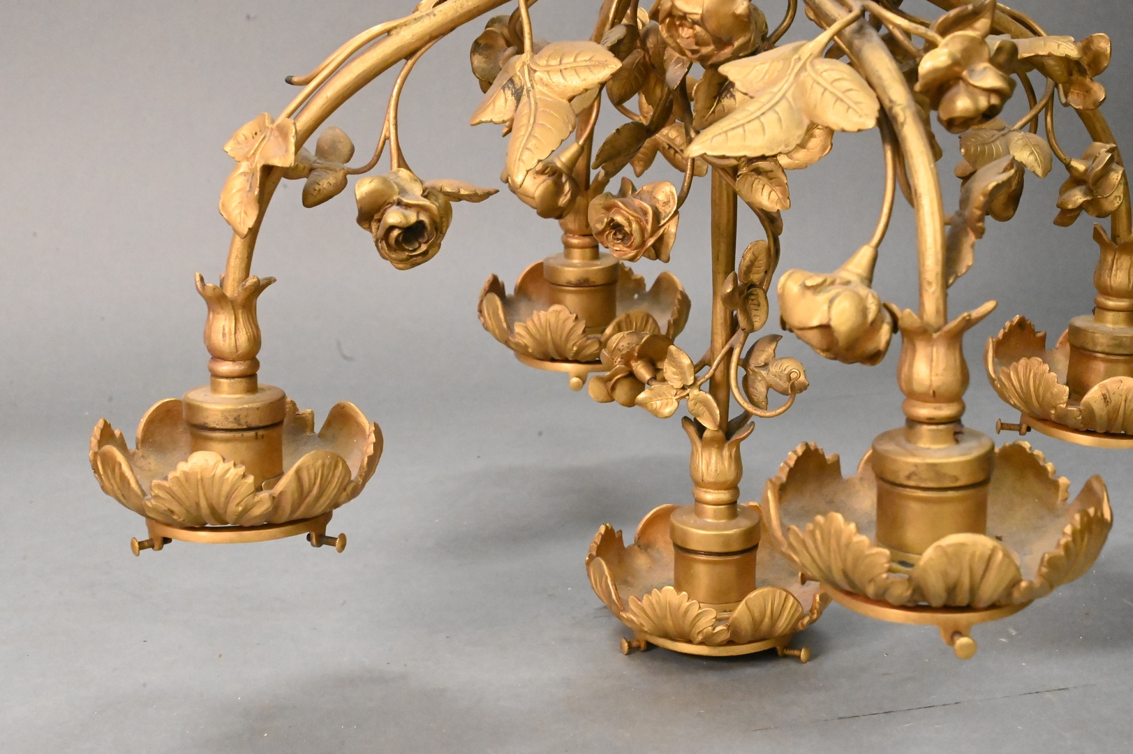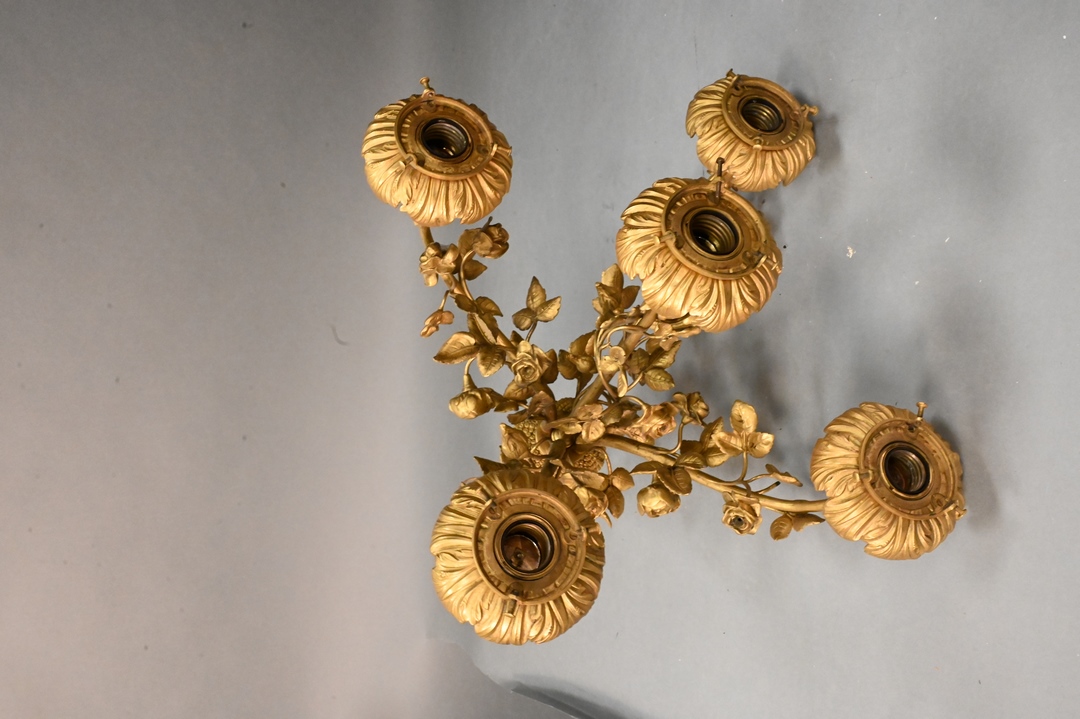 Gilt Bronze Five Light Chandelier having tassel form extension of four arms with blossoming rose and leaf decoration, no shades height 26 inches, diameter 18 inches
