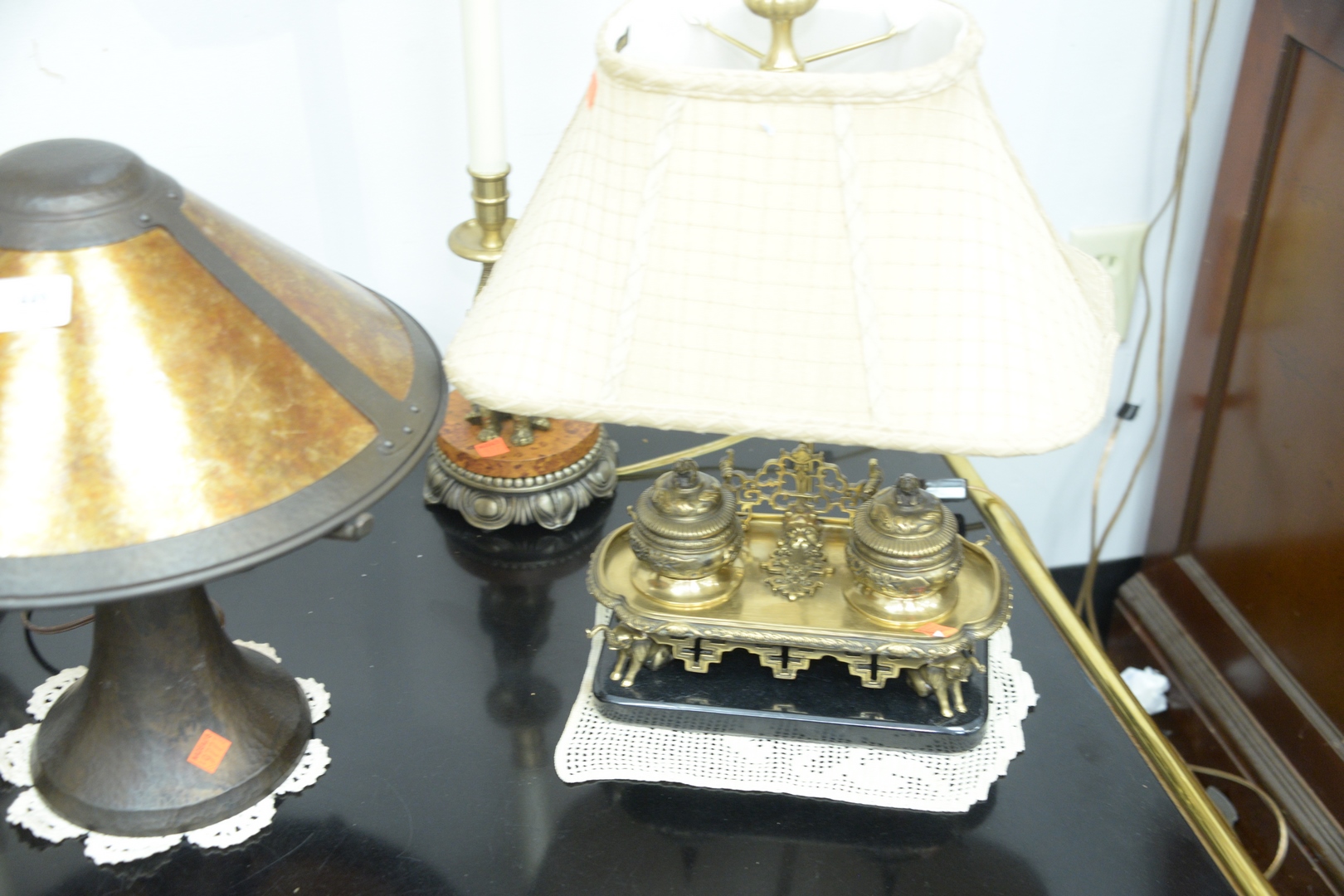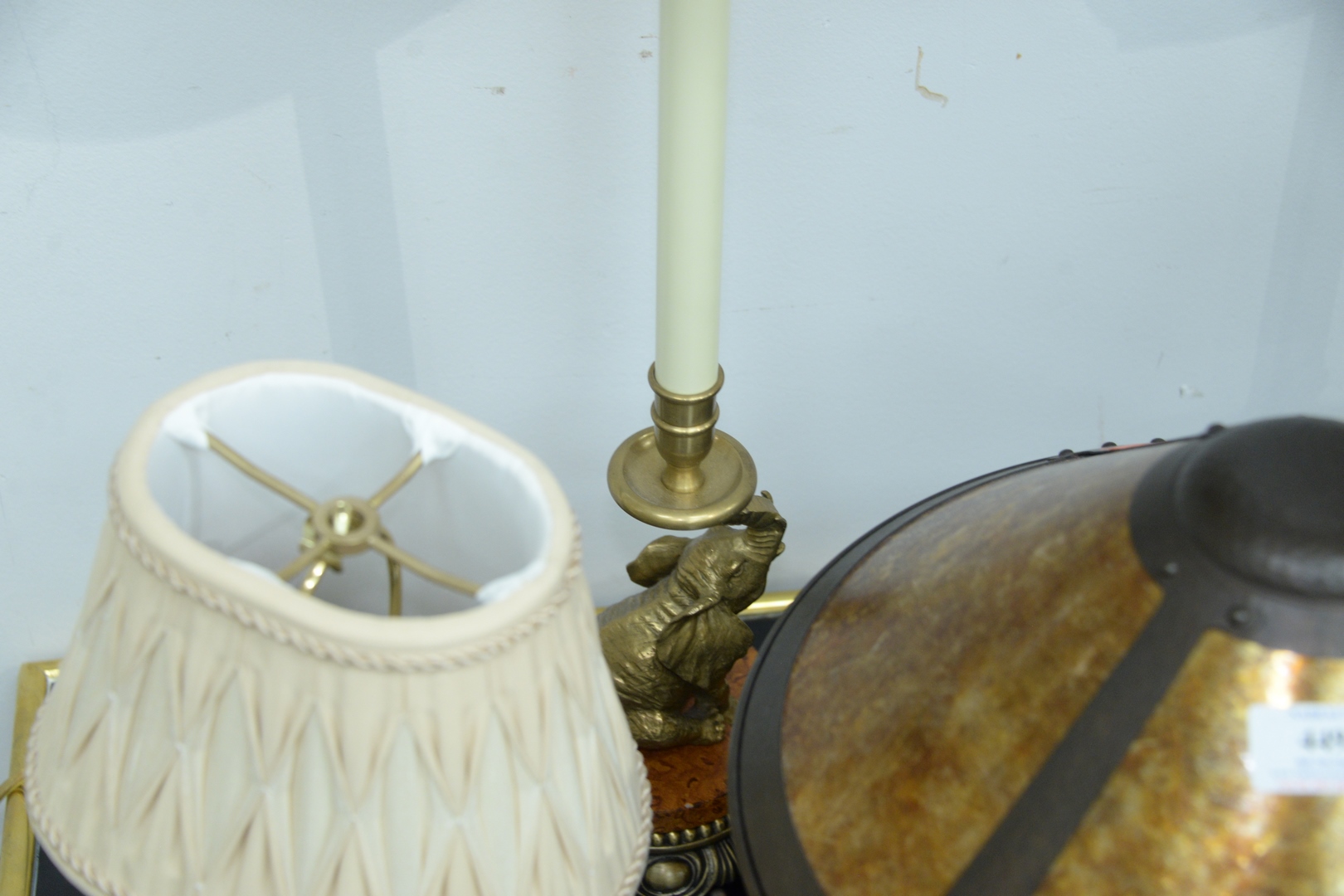 Lot 449: Group of Five Contemporary Table Lamps, to include two candlestick form with elephant figures; one in the form of inkwell; one copper Mission style; along with one in the form of a scale; tallest 18 inches.