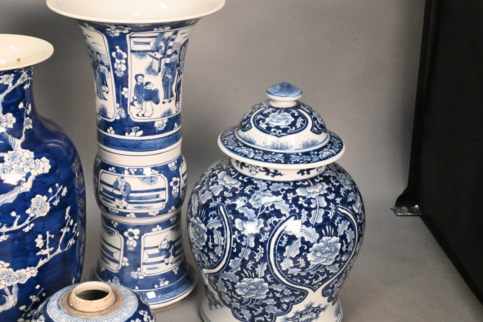 Group of Seven Chinese Blue and White Porcelain Pieces, to include two blue and white prunus vases, each decorated with white flowers on blue ground, one of plum shape (mei ping), height 13 inches; along with a lantern shape, height 15 inches, both with underglaze double blue rings on base, three blue and white Jars, comprised of two small jars with prunus decoration (no covers), height 6 inches, along with a larger covered baluster jar decorated in Kangxi style with formalized scrolling foliage, height 12 inches, a pair of blue and white beaker vases, decorated with reserves of boys on a prunus background, height 14 inches.