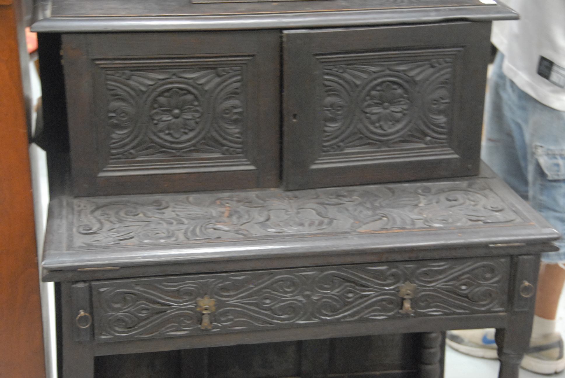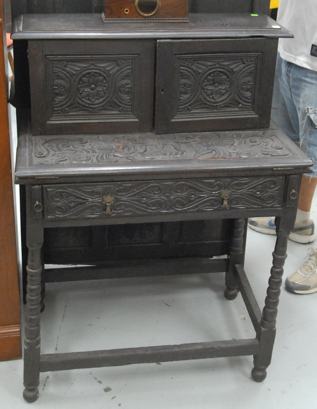 Jacobean style desk with two doors over one drawer, ht. 41, wd. 31. Being sold to benefit a Connecticut museum.