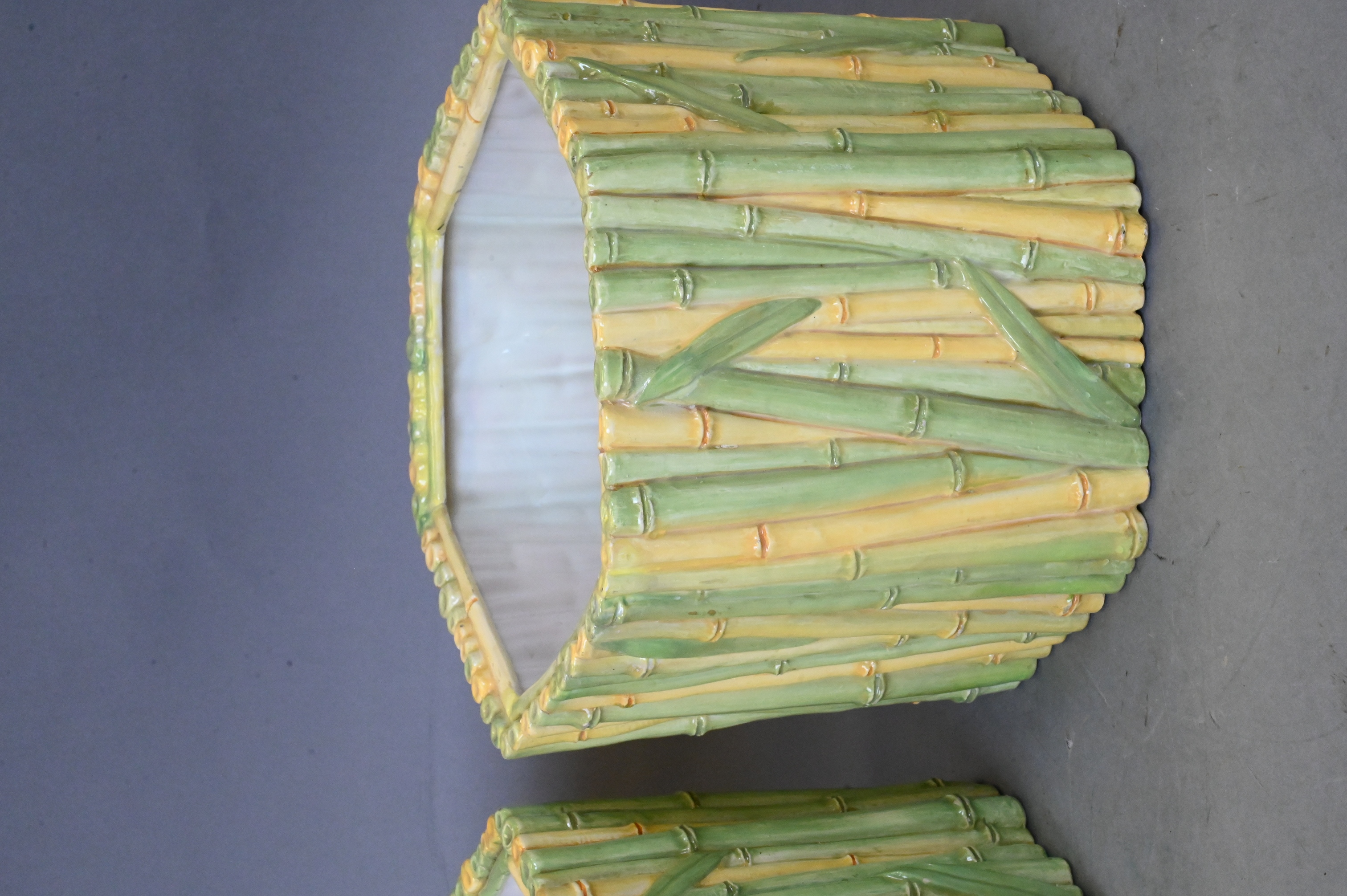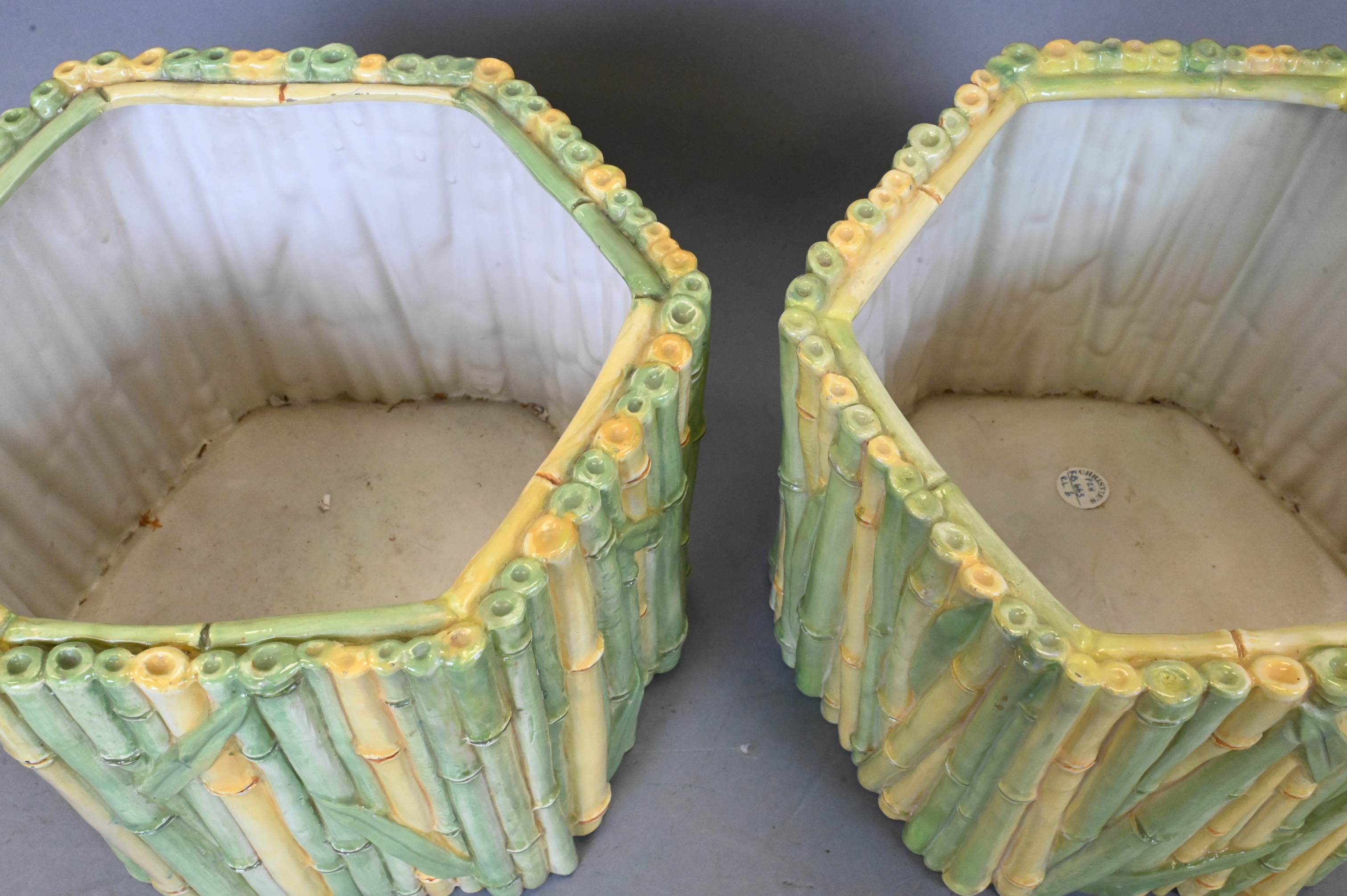 each hexagonal planter molded in high relief as clustered bamboo stalks in shaded yellow and green glazes, the interiors glazed cream,unmarked