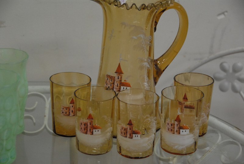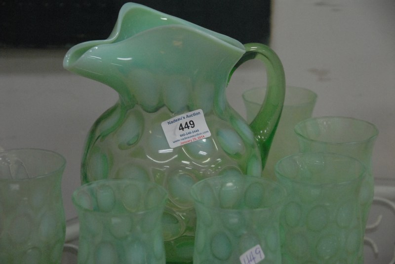 Lot 449: Thirteen piece lot to include green Fenton coin spot pitcher and six tumblers along with painted pitcher and five tumblers.