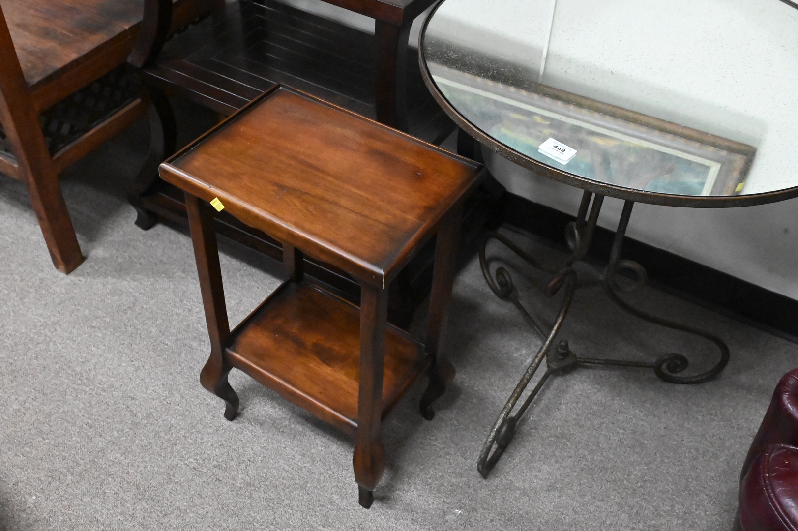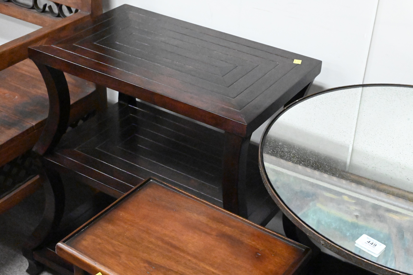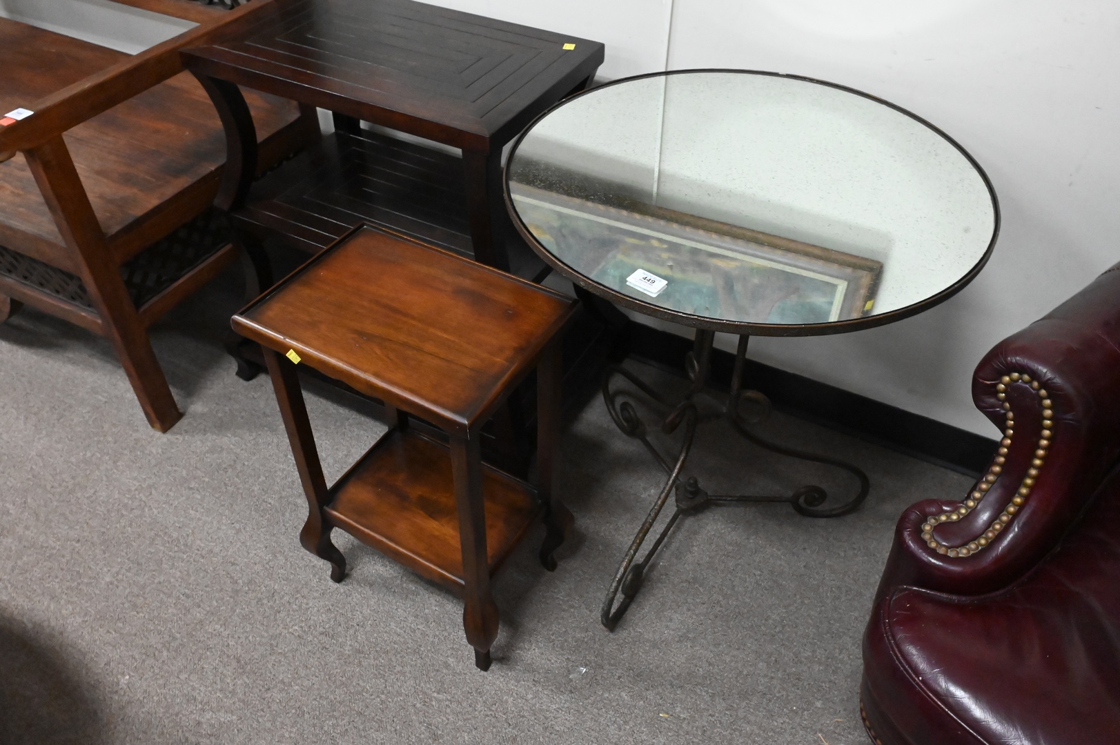 Three End Tables, to include one having mirrored top and scroll base, height 27 1/2 inches, diameter 24 inches; a three tier contemporary stand; along with a two-tier stand.