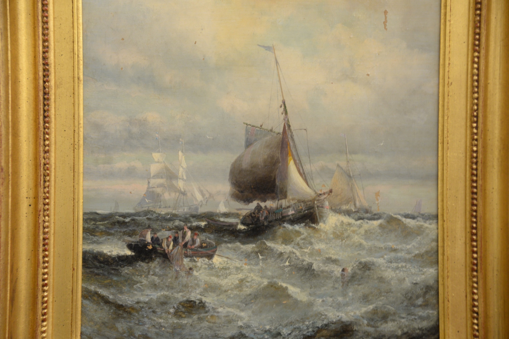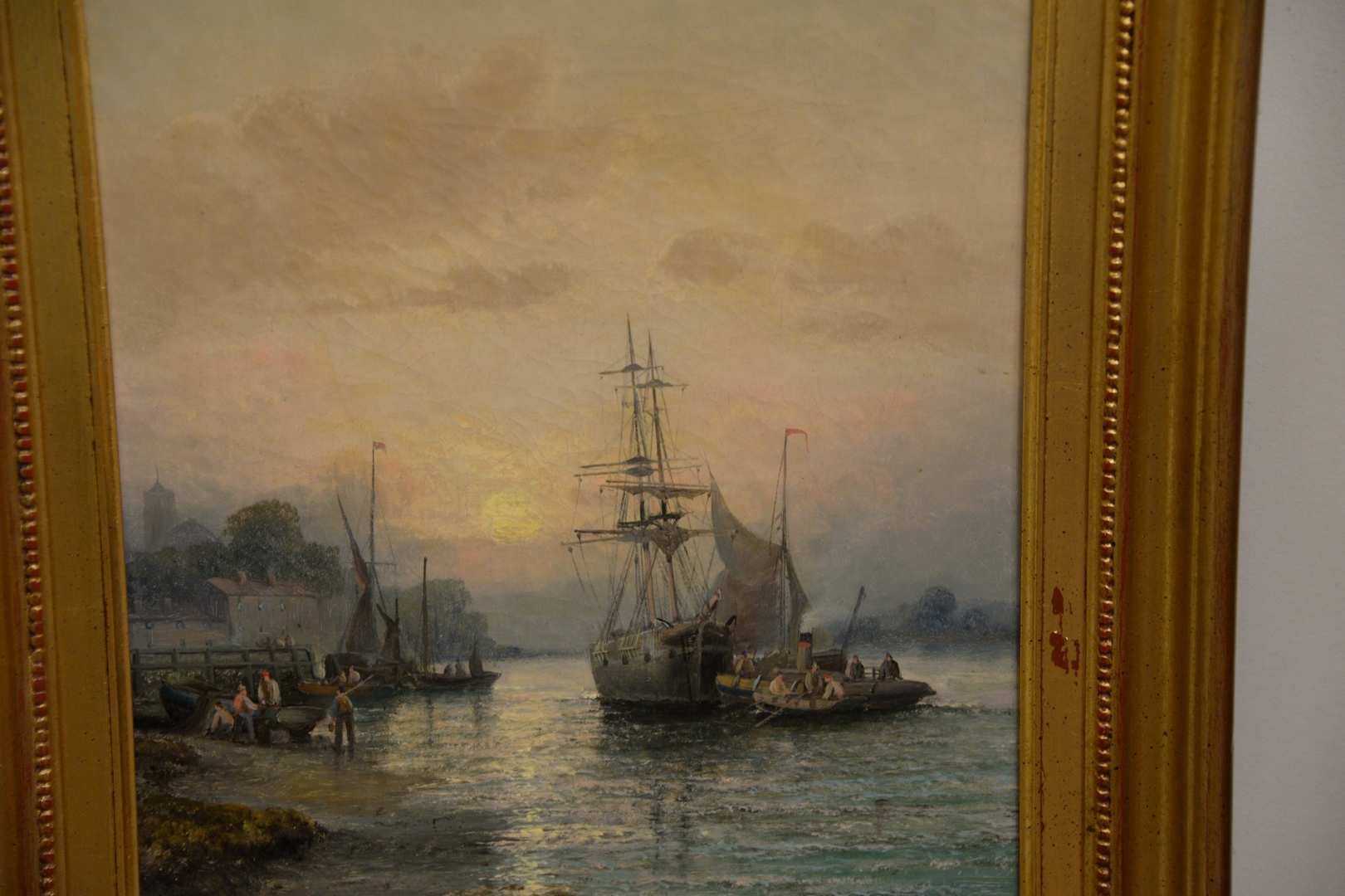 Lot 449: Two Georges William Thornley French/British, 1857 – 1935 Evening, the Thames Near Ben Fleet along with Fishing Smack … Up to Wind, oil on canvas, one signed faintly lower left, both titled on the stretcher bars, each 14 x 12.