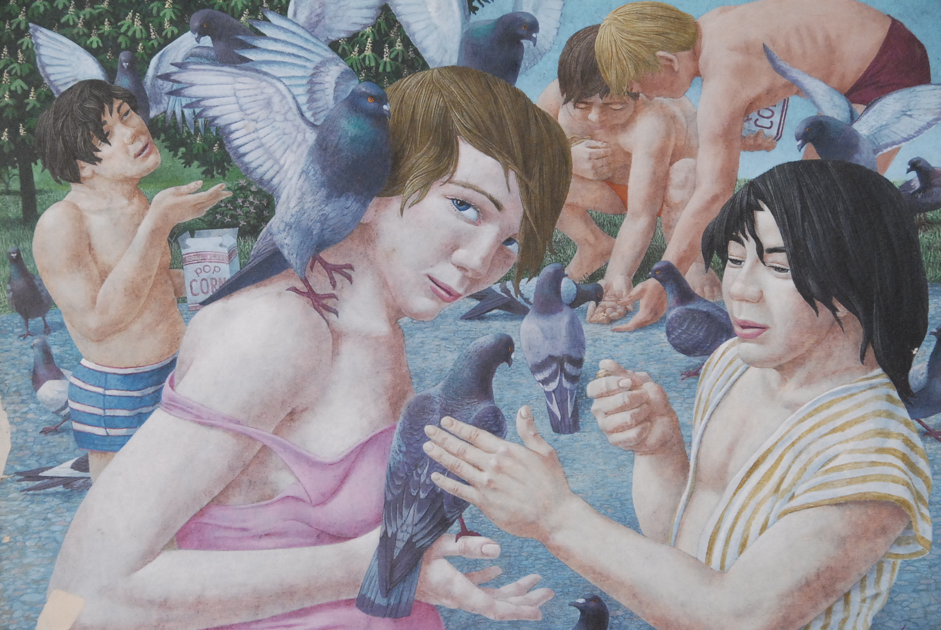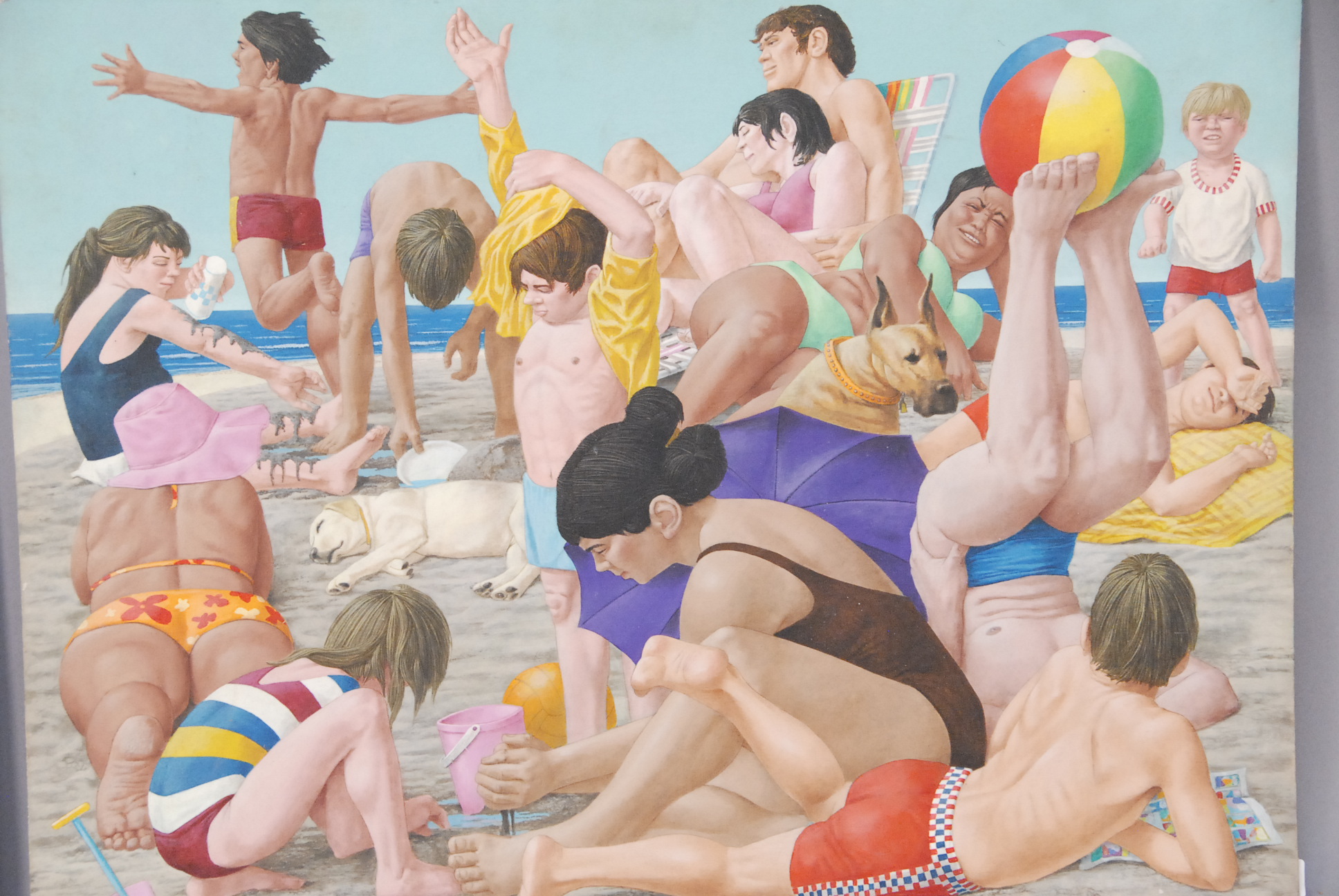 Vincent T. Smarkusz 1919-1974 two paintings Beach oil on board signed lower left Smarkusz 24 x 32 and People with Birds oil on board signed lower right 24 x 32