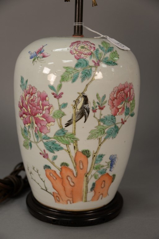 Lot 45: Famille Rose porcelain covered ginger jar with enameled ducks amongst blossoming lotus, made into a table lamp repair to top. va…