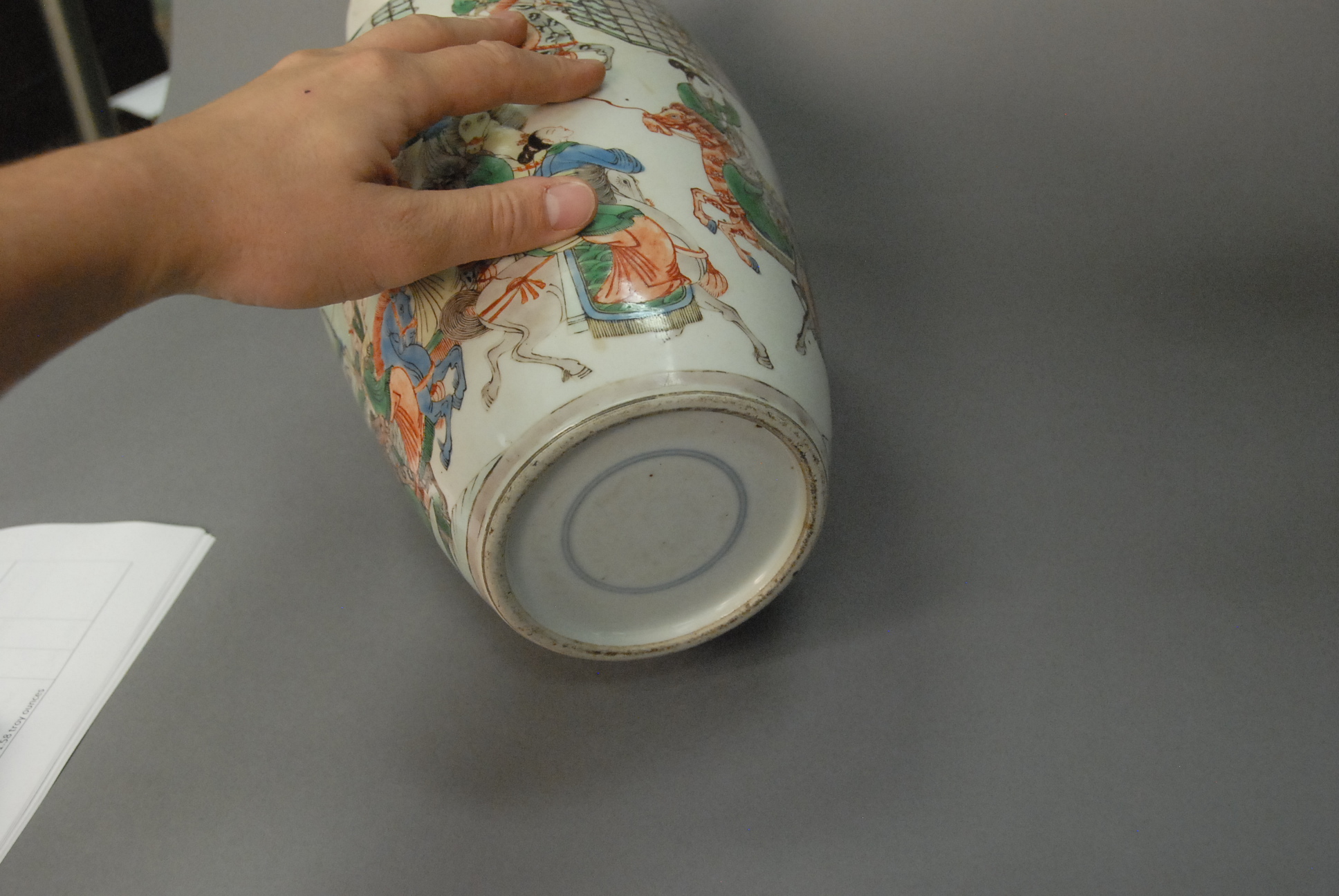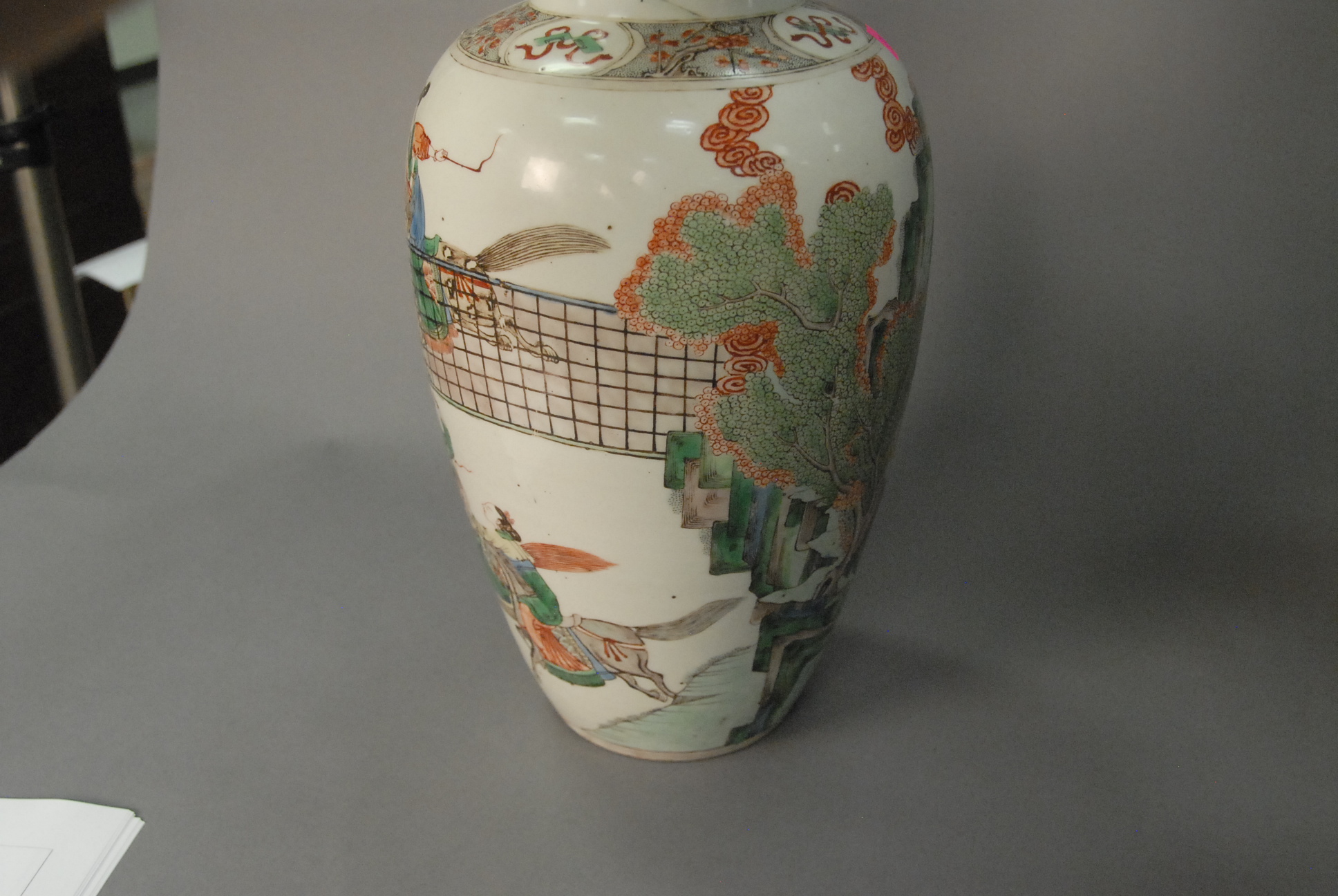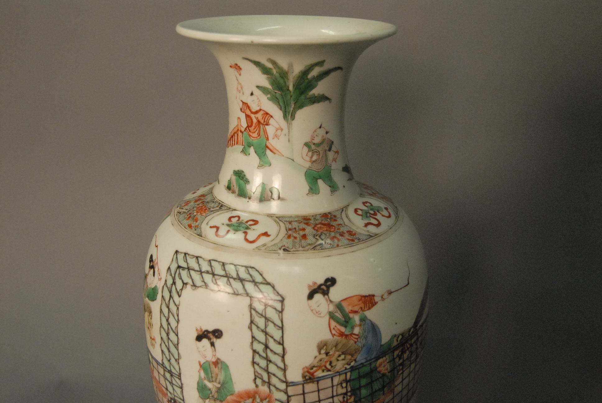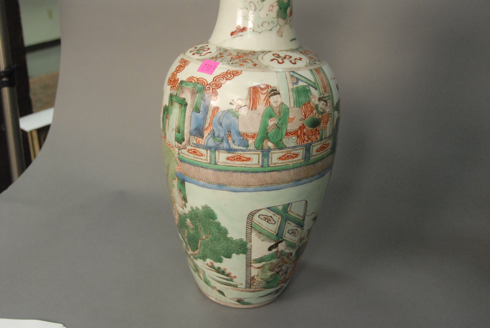 Lot 45: Famille Verte baluster form vase, painted with Scholars and Guanyin figures on horseback, having double blue circle on base, probably 18th to 19th century. ht. 17 1/2 in.