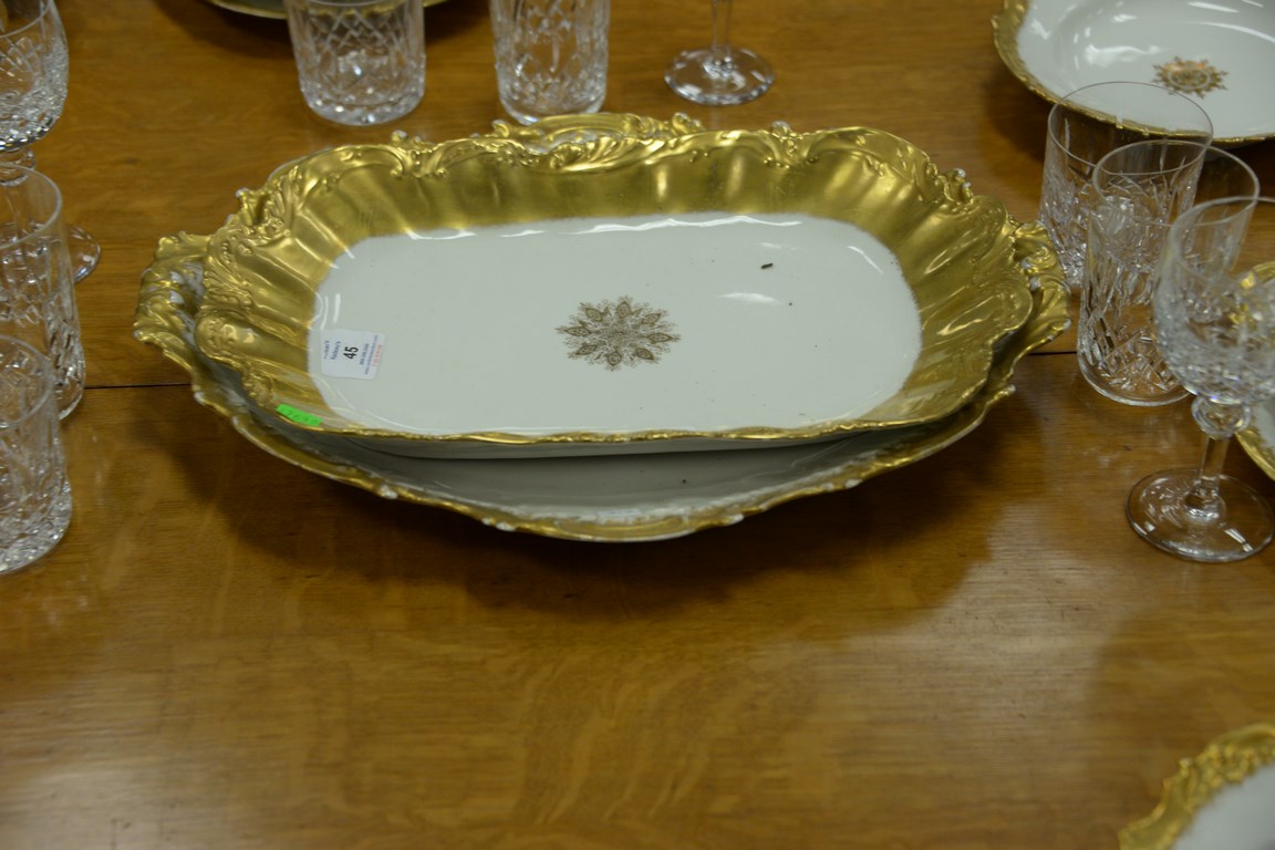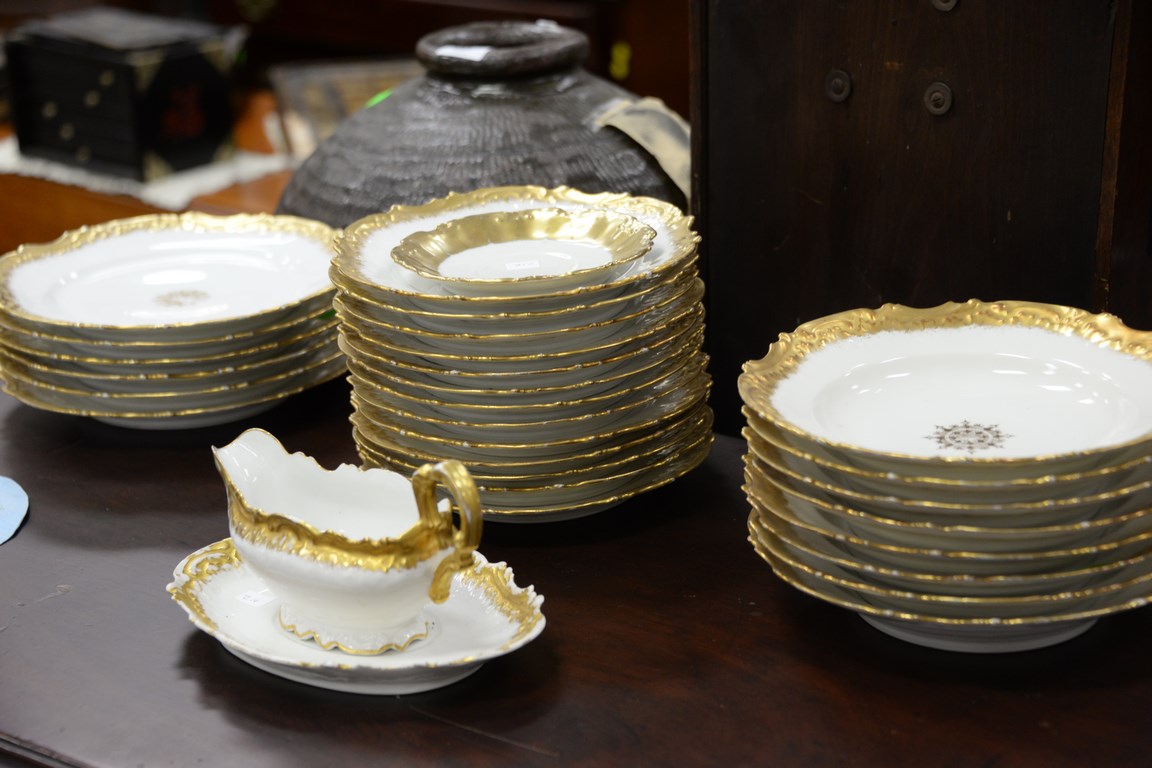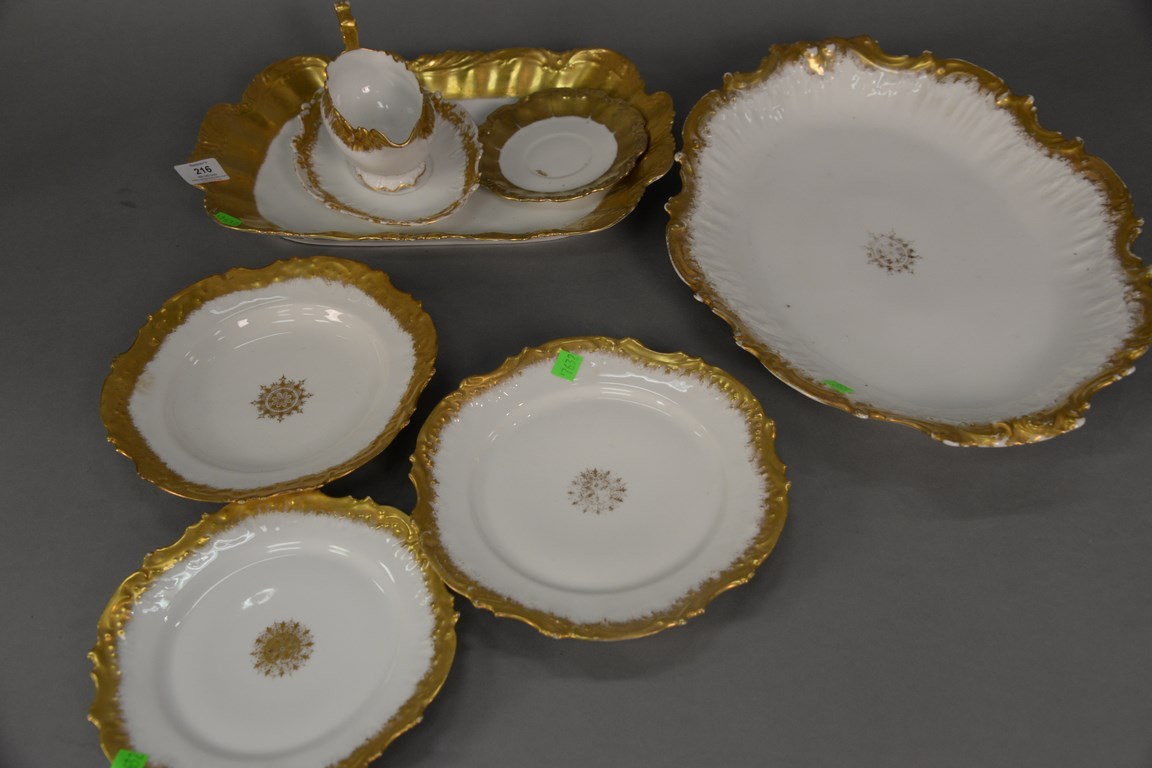Lot 45: Fourteen gold trimmed Limoges china platters, bowls, plates, etc. plate: dia. 6 in. platter: lg. 16 in. and 18 in.