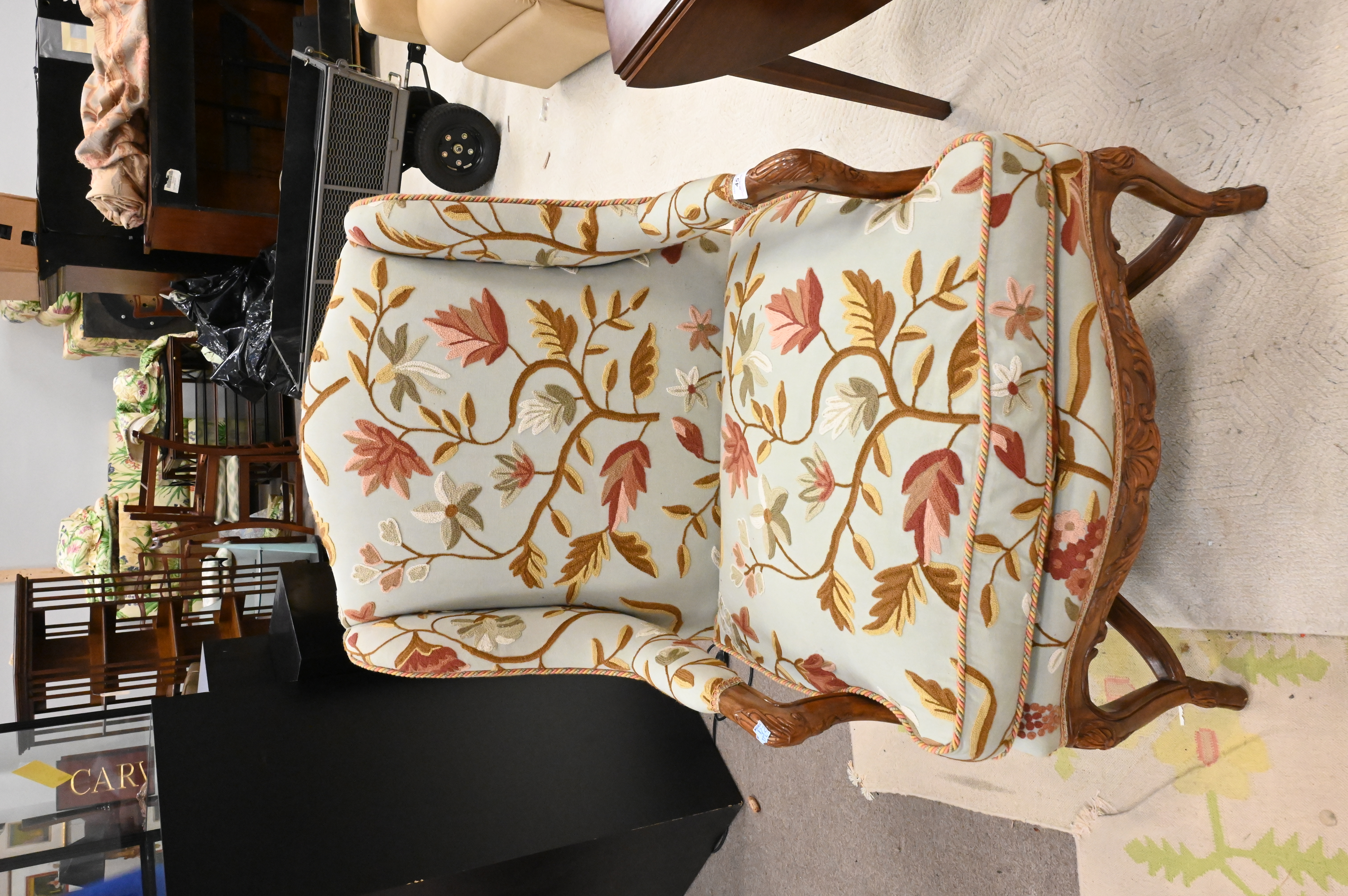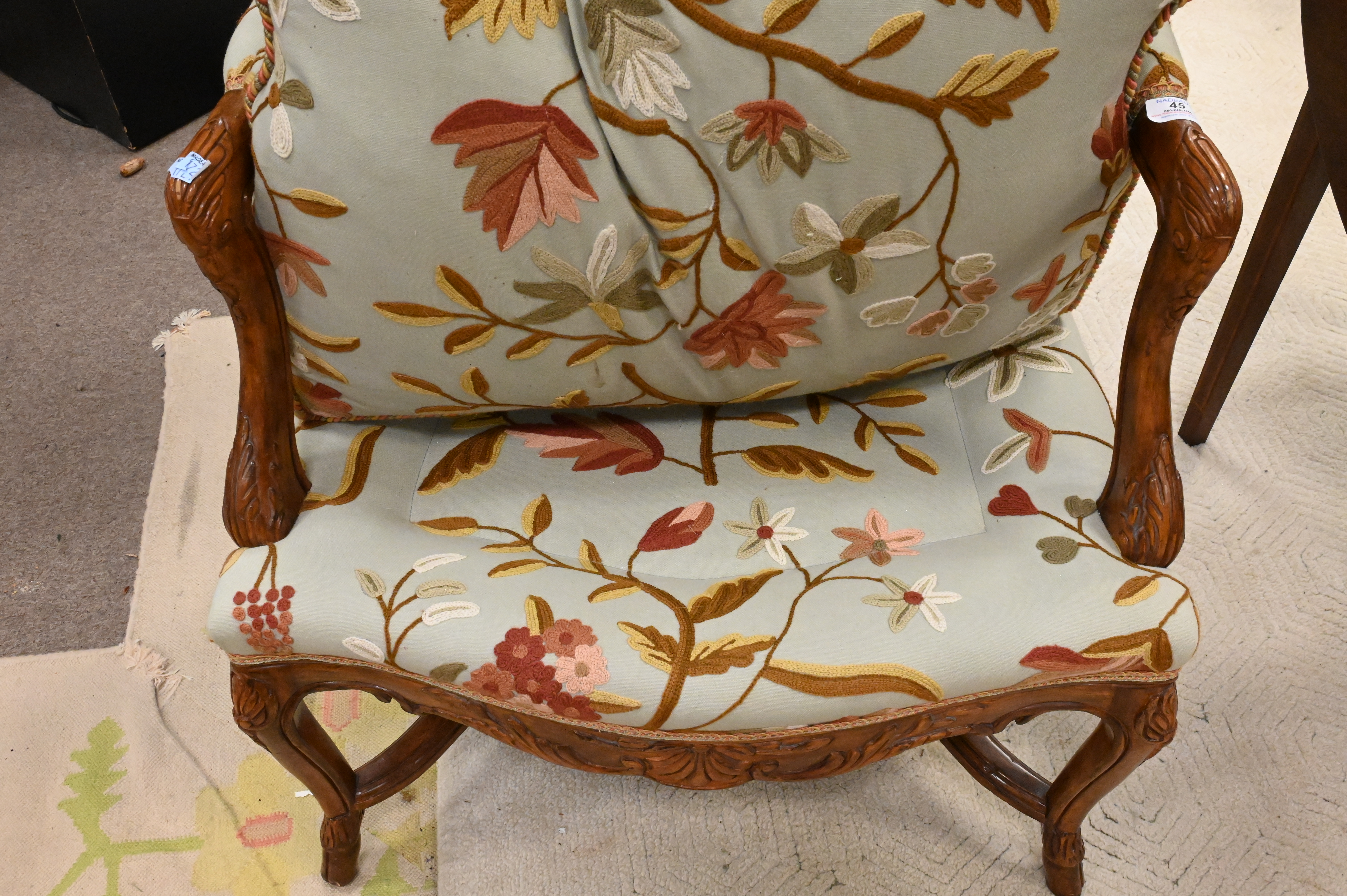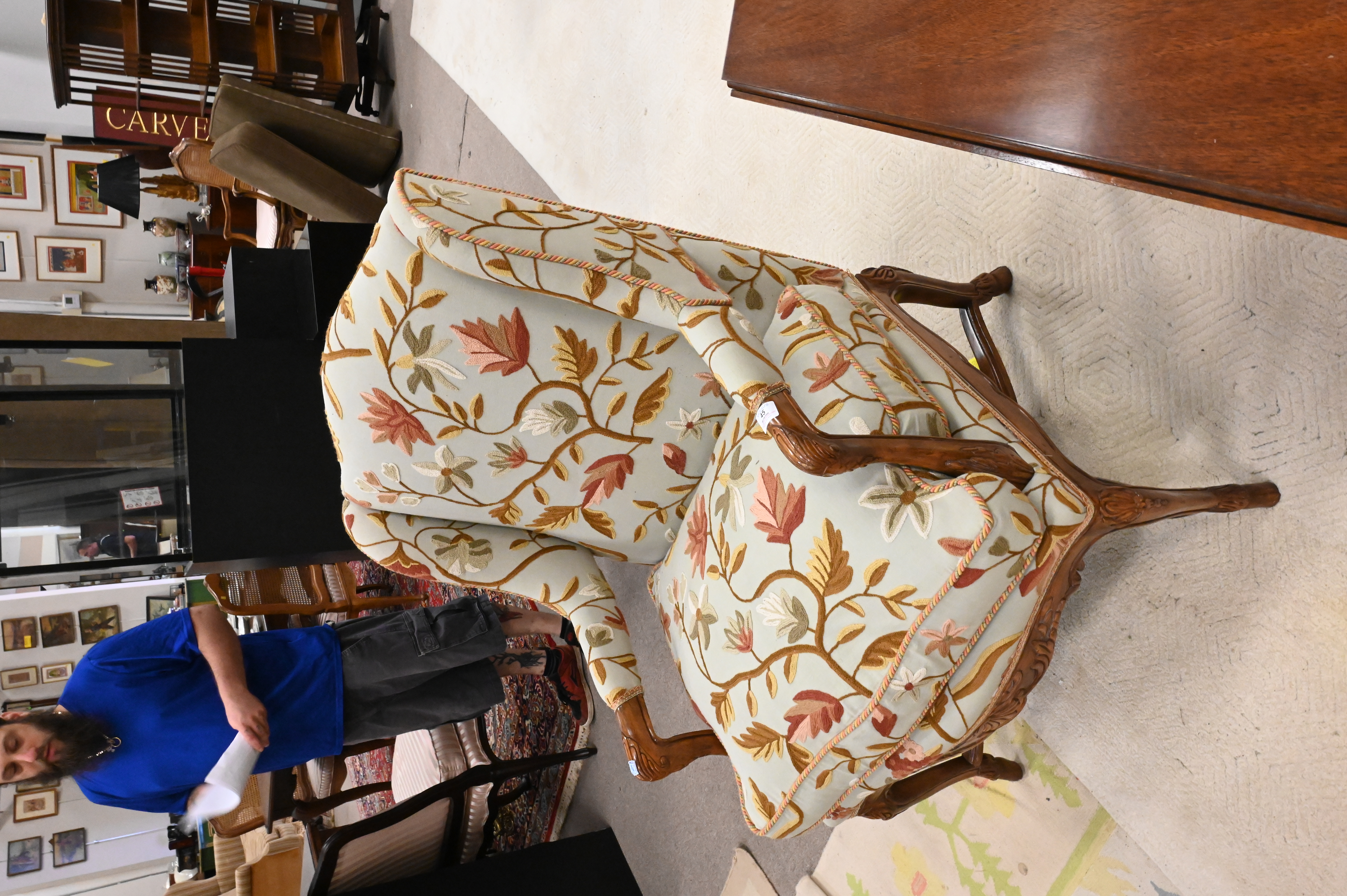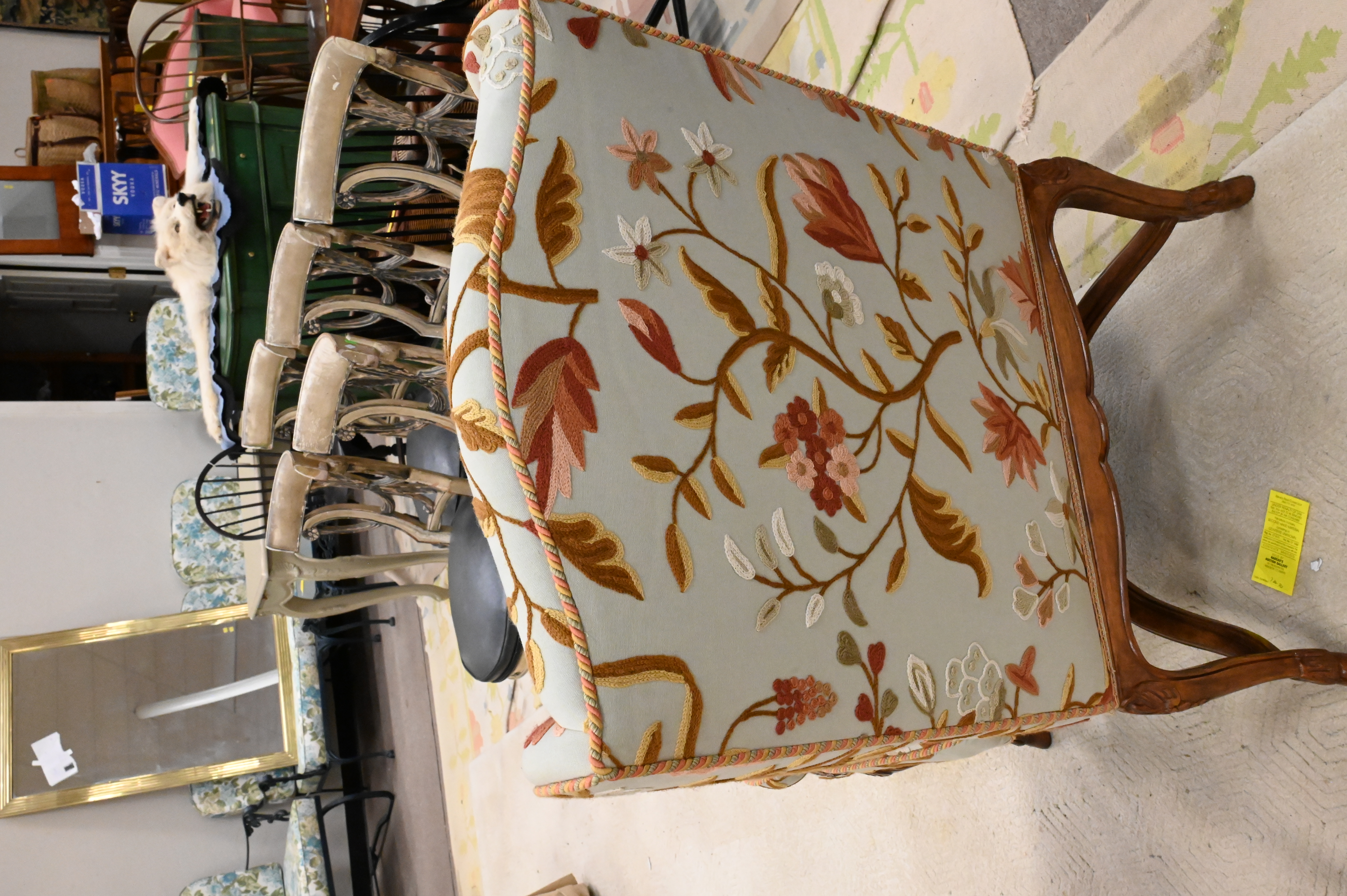 Minton Spidell Cruel Work Upholstered Arm Chair, having carved frame and X stretcher with cabriole legs ending in hoof feet, height 41 inches, width 28 inches.