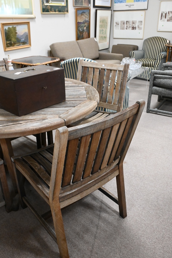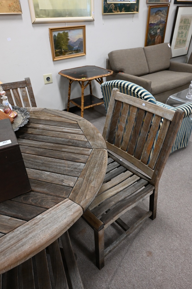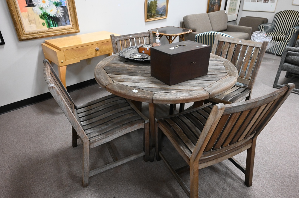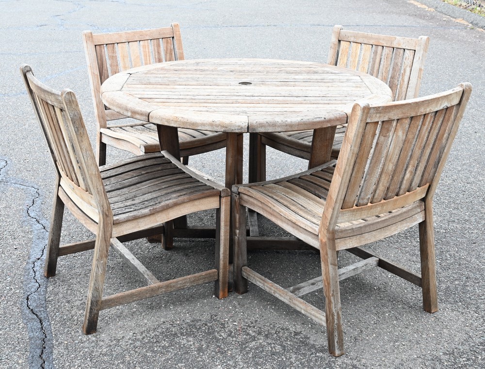 Lot 45: New River Brazilian Cherry Outdoor Patio Set, having table, four chairs, similar to teak, height 30 inches, diameter 48 inches.