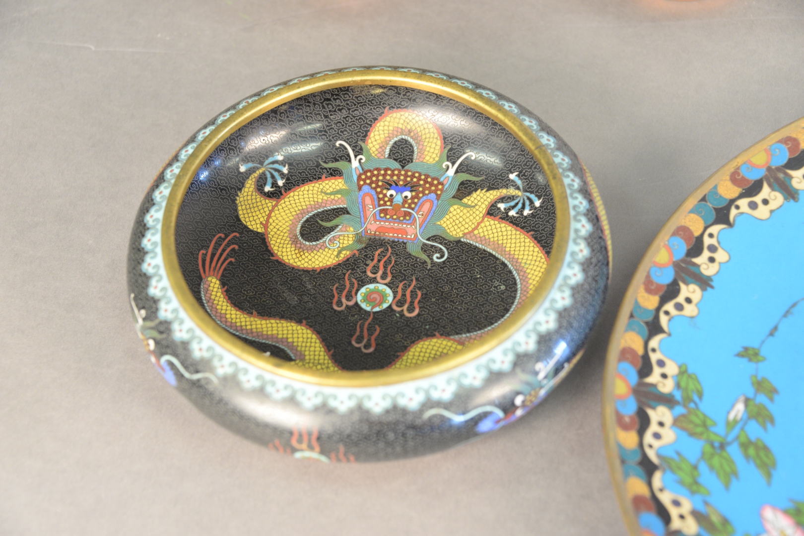 Lot 45: Six Piece Cloisonne Group, to include a turquoise charger having a flying white bird, diameter 14 1/2 inches; a black and yellow bowl having a dragon with five claws; a covered bowl having yellow flowers throughout; Chinese cloisonne lidded ginger jars to include a yellow pair having five clawed dragon details; along with a smaller white ginger jar having foliate decoration, marked “China” to the underside, height 8 1/4 inches. Provenance: Estate of James Wadhams.