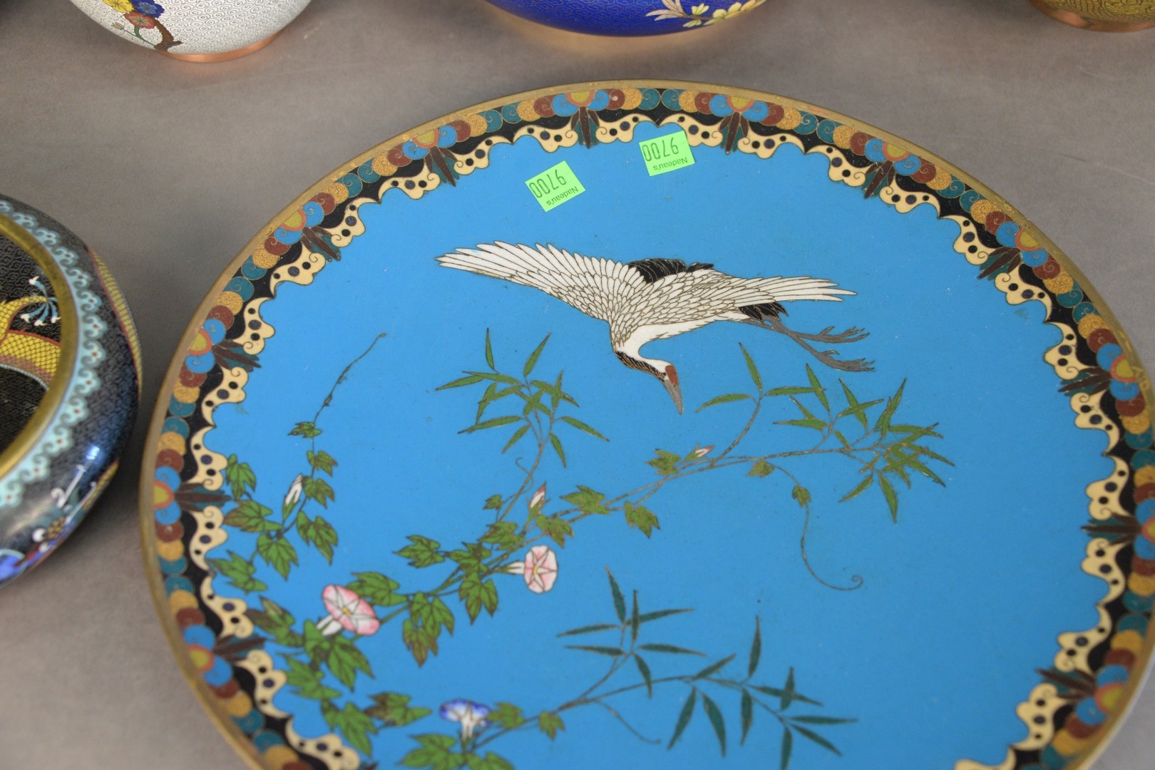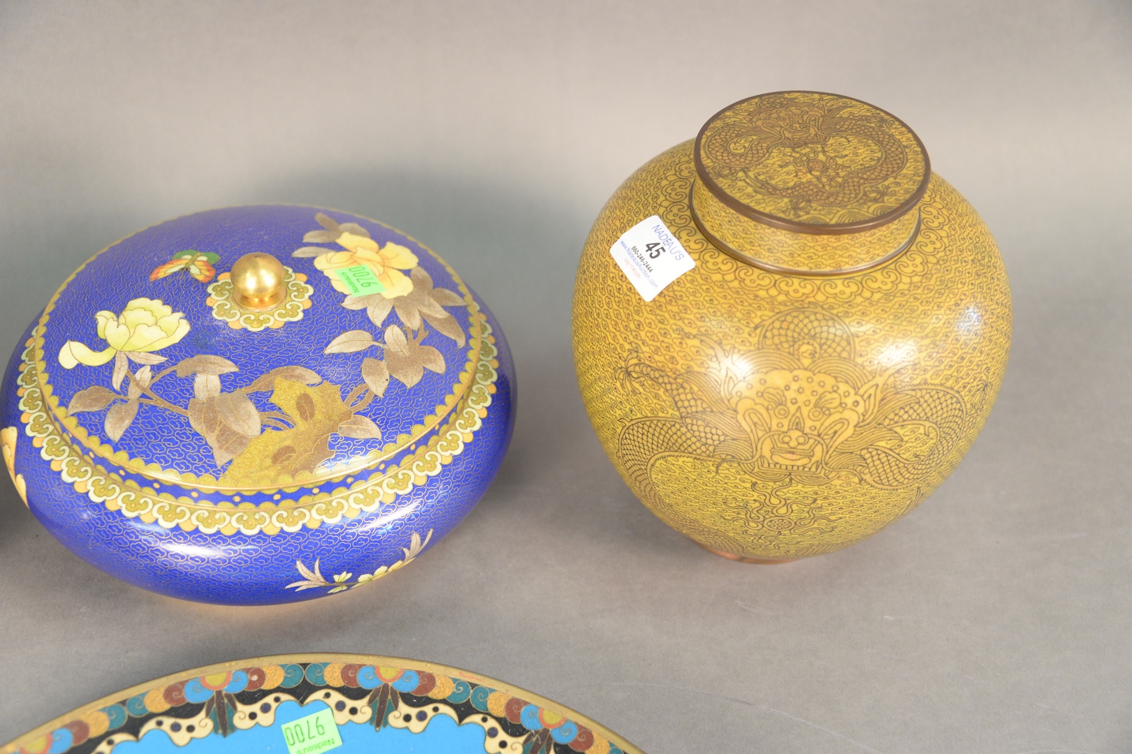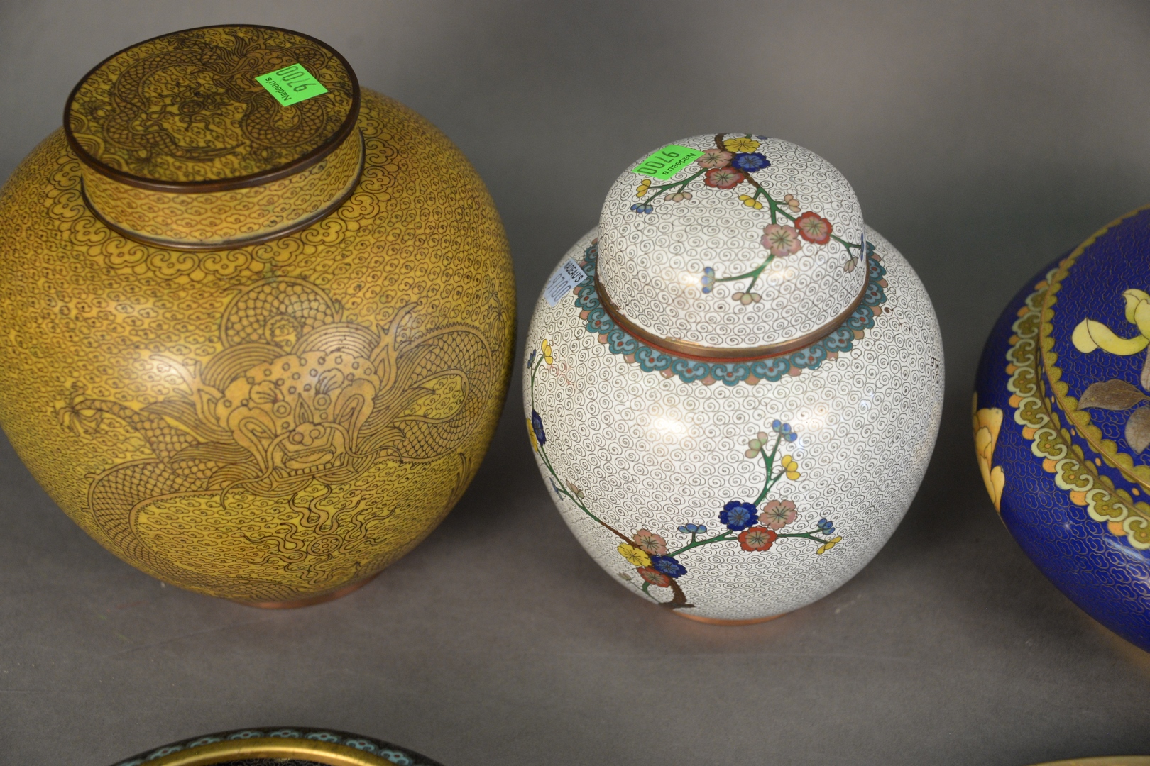 Six Piece Cloisonne Group, to include a turquoise charger having a flying white bird, diameter 14 1/2 inches; a black and yellow bowl having a dragon with five claws; a covered bowl having yellow flowers throughout; Chinese cloisonne lidded ginger jars to include a yellow pair having five clawed dragon details; along with a smaller white ginger jar having foliate decoration, marked “China” to the underside, height 8 1/4 inches. Provenance: Estate of James Wadhams.