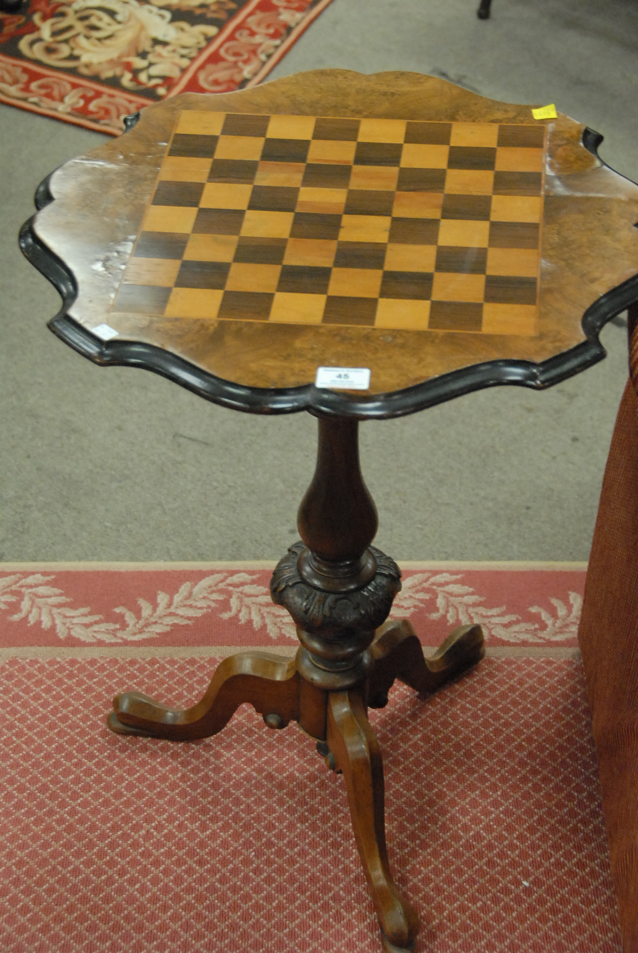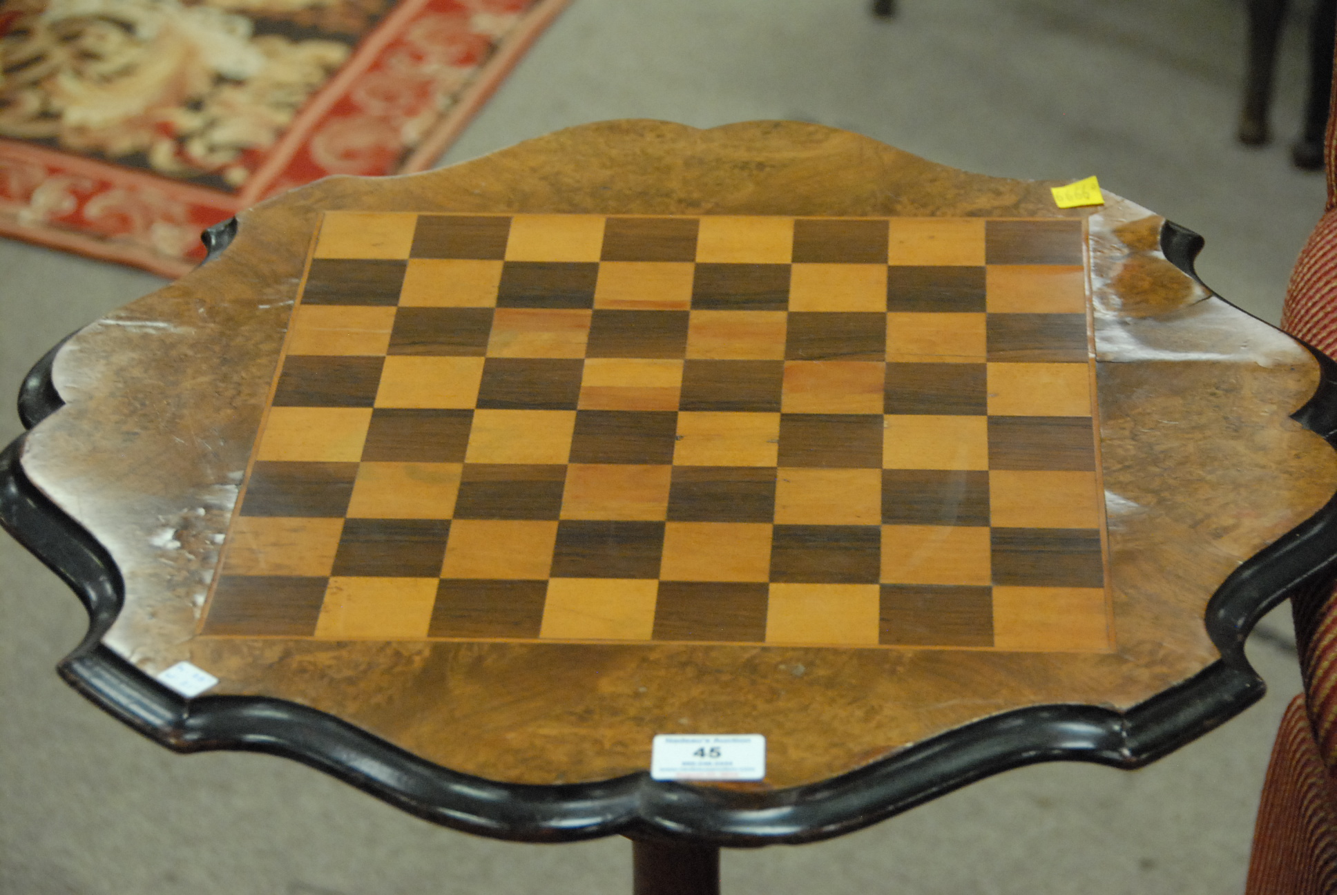 Small Victorian game table with inlaid checker board top, ht. 27 in. top: 21 1/2 x 21 1/2.