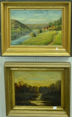Lot 45: Three small oil paintings including oil on board, Mountainous River Landscape, signed lower right: L. Biegi 11 x 8 19th centur…