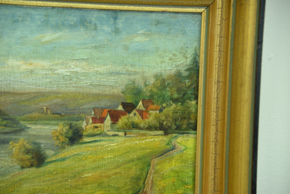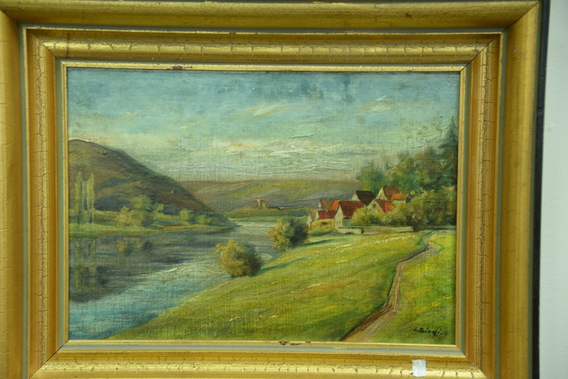 Lot 45: Three small oil paintings including oil on board, Mountainous River Landscape, signed lower right: L. Biegi 11 x 8 19th centur…