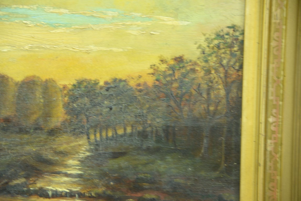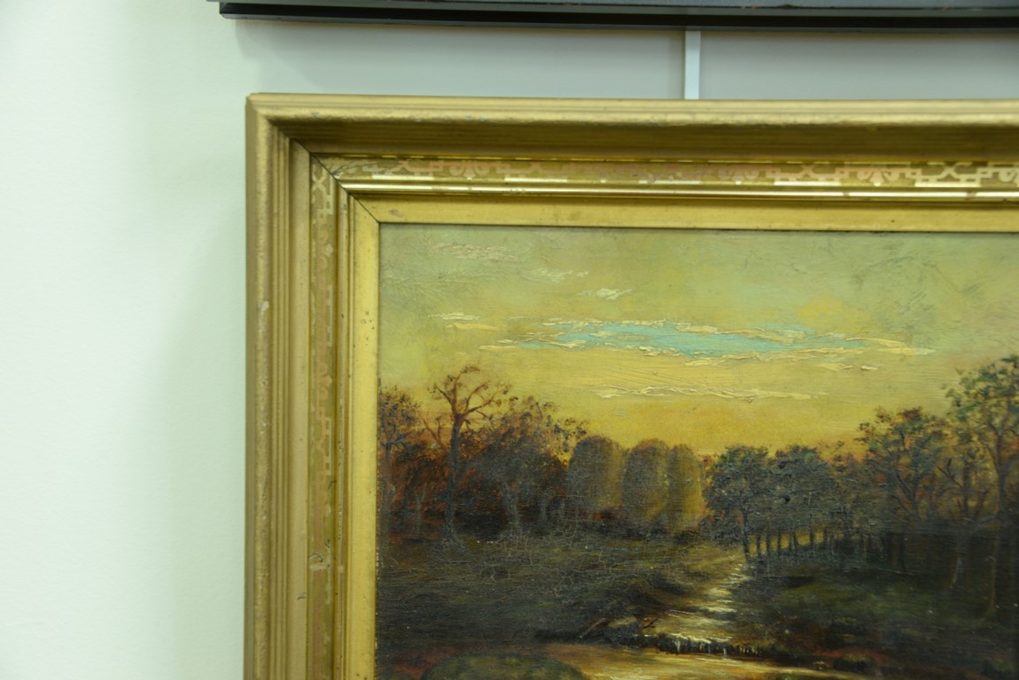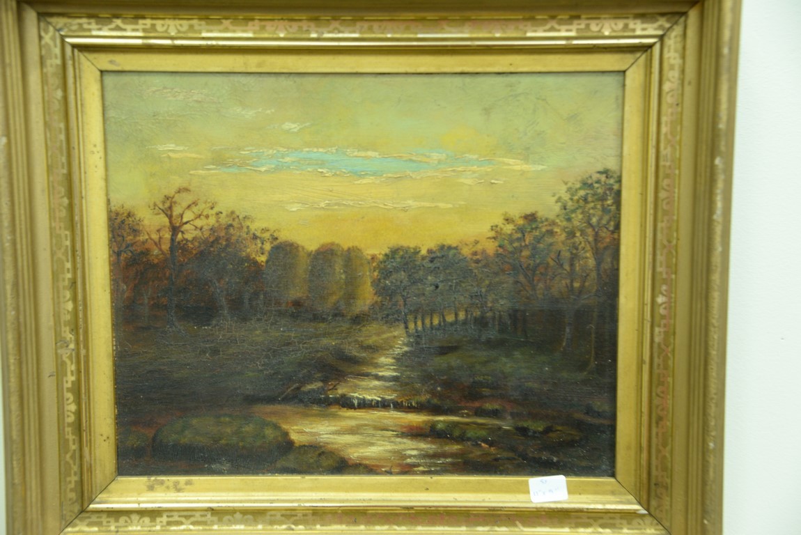 Three small oil paintings including oil on board, Mountainous River Landscape, signed lower right: L. Biegi 11 x 8 19th century oil on board, Sunset Evening 11 x 9 and oil on canvas, Winter Landscape with Red Barn 10 x 5.
