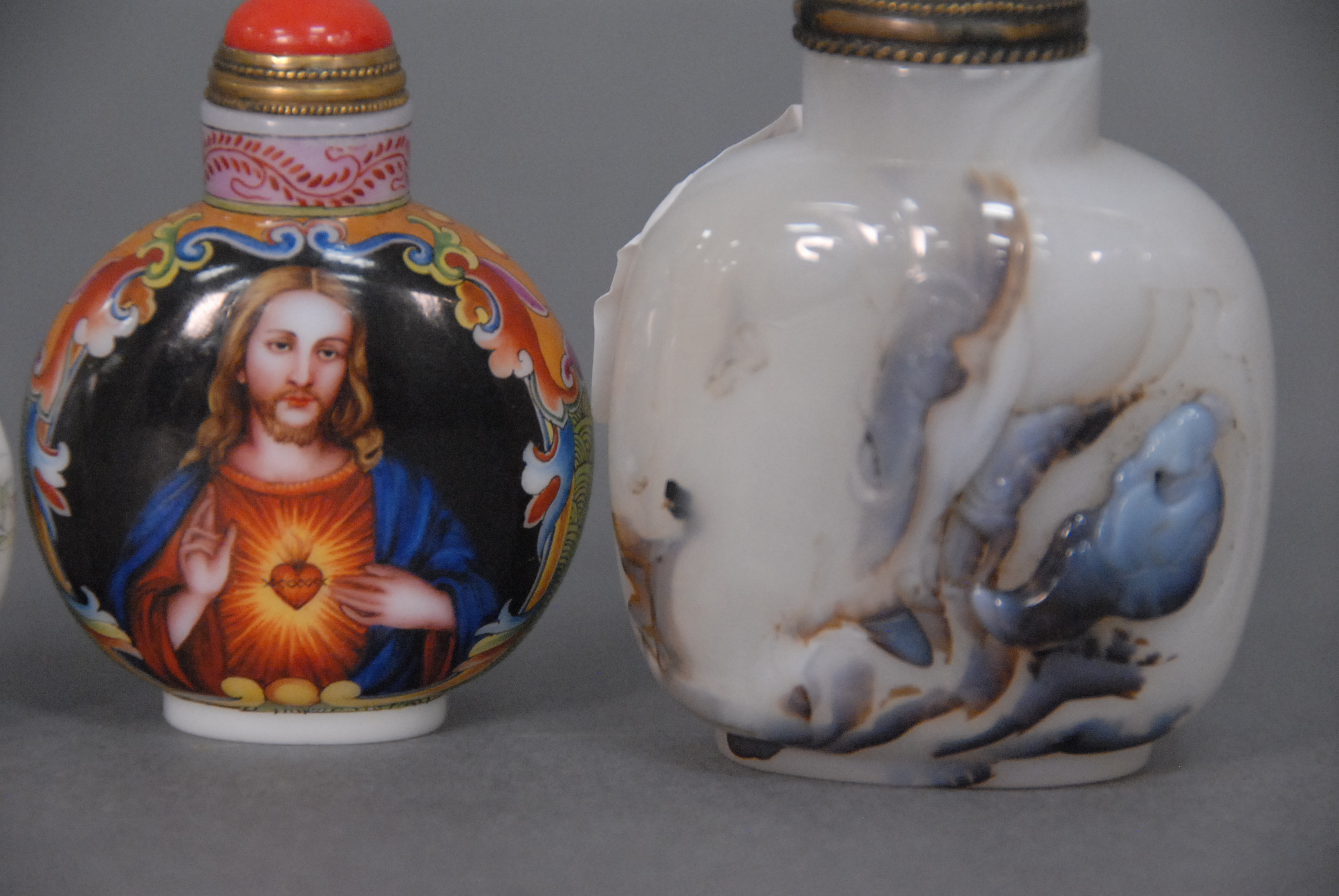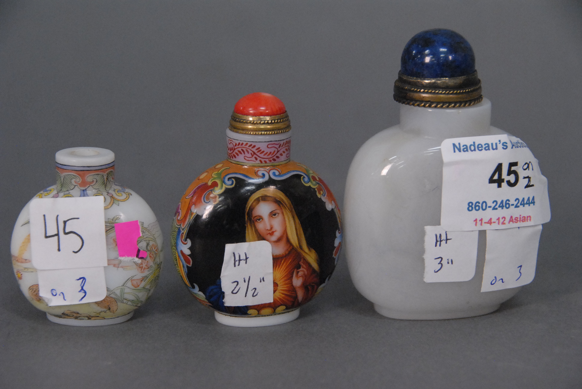 Lot 45: Three snuff bottles one agate with carved bats and seated figure and two glass painted snuff bottles missing stoppers, 2in. – 3in.
