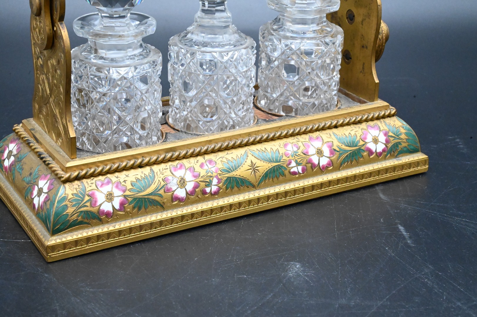 Tiffany & Company Bronze and Enameled Tantalus, having three glass decanter bottles with stoppers, marked Tiffany & Company, Union Square, on plaque, Betjemann’s patent, London, “The Tantalus”, height 7 1/2 inches, width 9 1/2 inches.