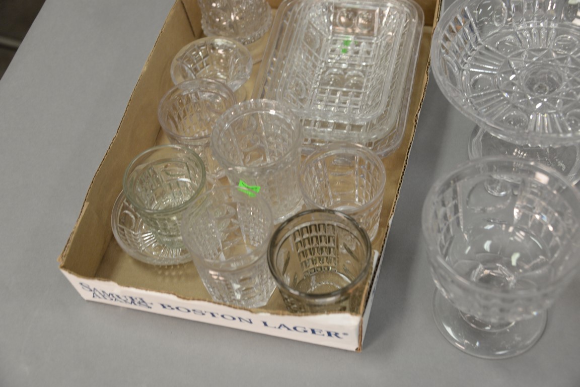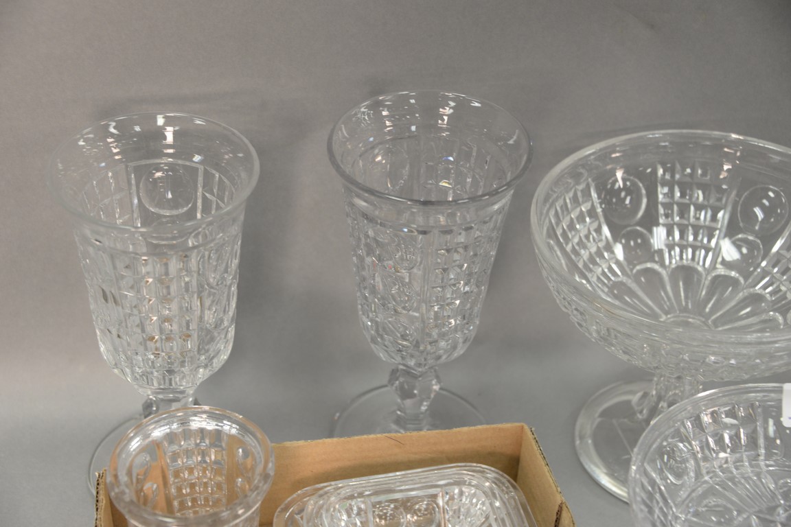 Twenty-one piece Waffle pattern flint glass lot including six stemmed bowls, nest of three rectangular dishes, glassware and pair of Waffle pattern flint glass footed vases. ht. 9 1/4in.