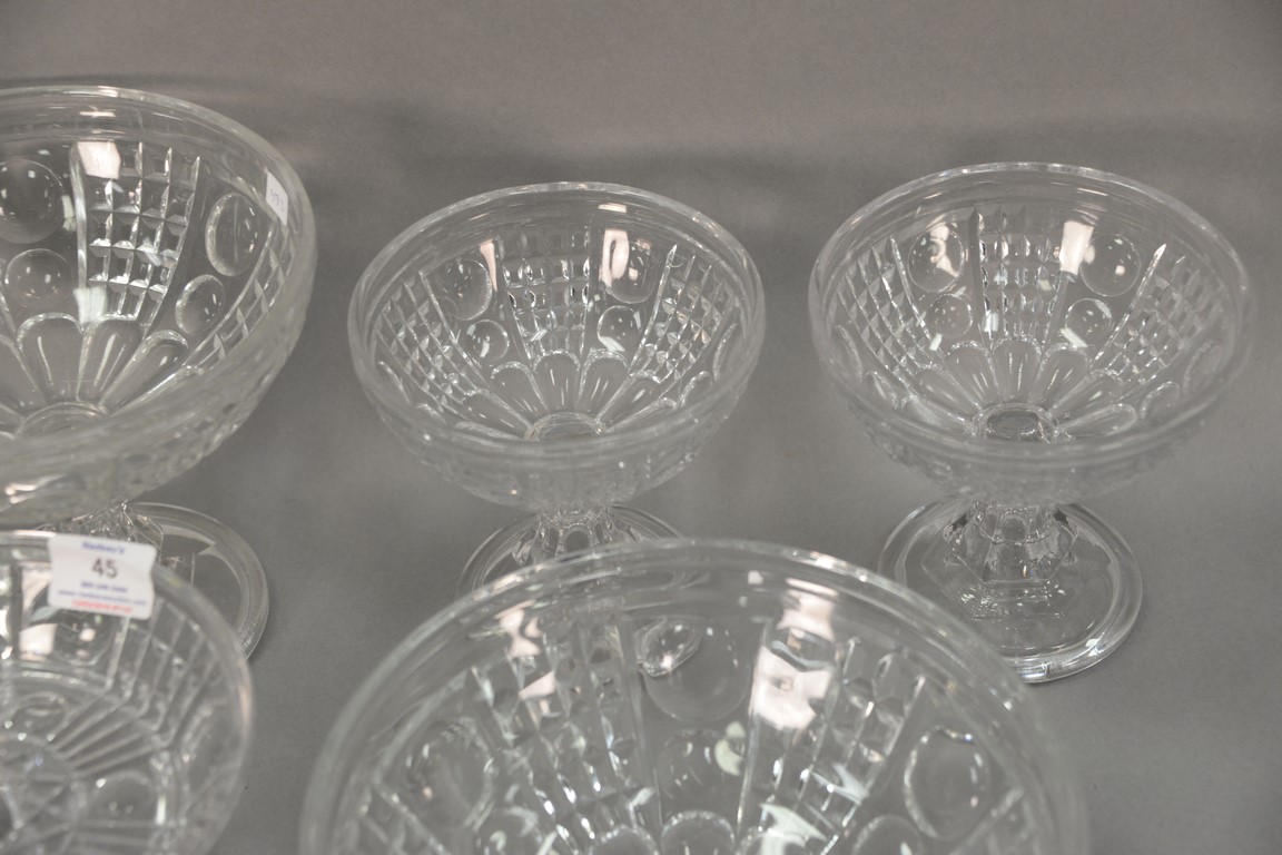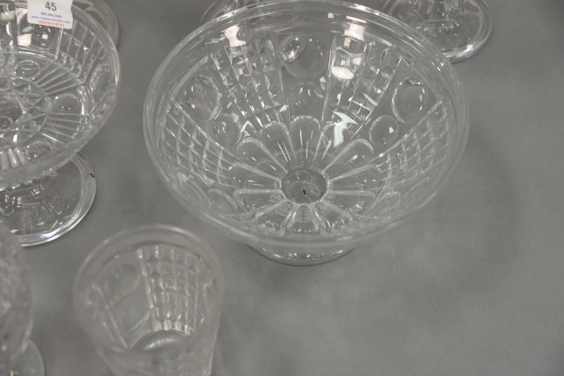 Lot 45: Twenty-one piece Waffle pattern flint glass lot including six stemmed bowls, nest of three rectangular dishes, glassware and pair of…