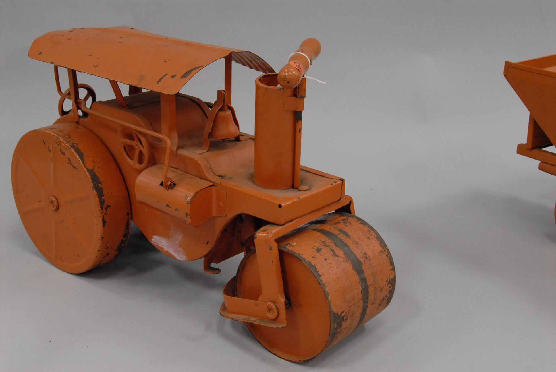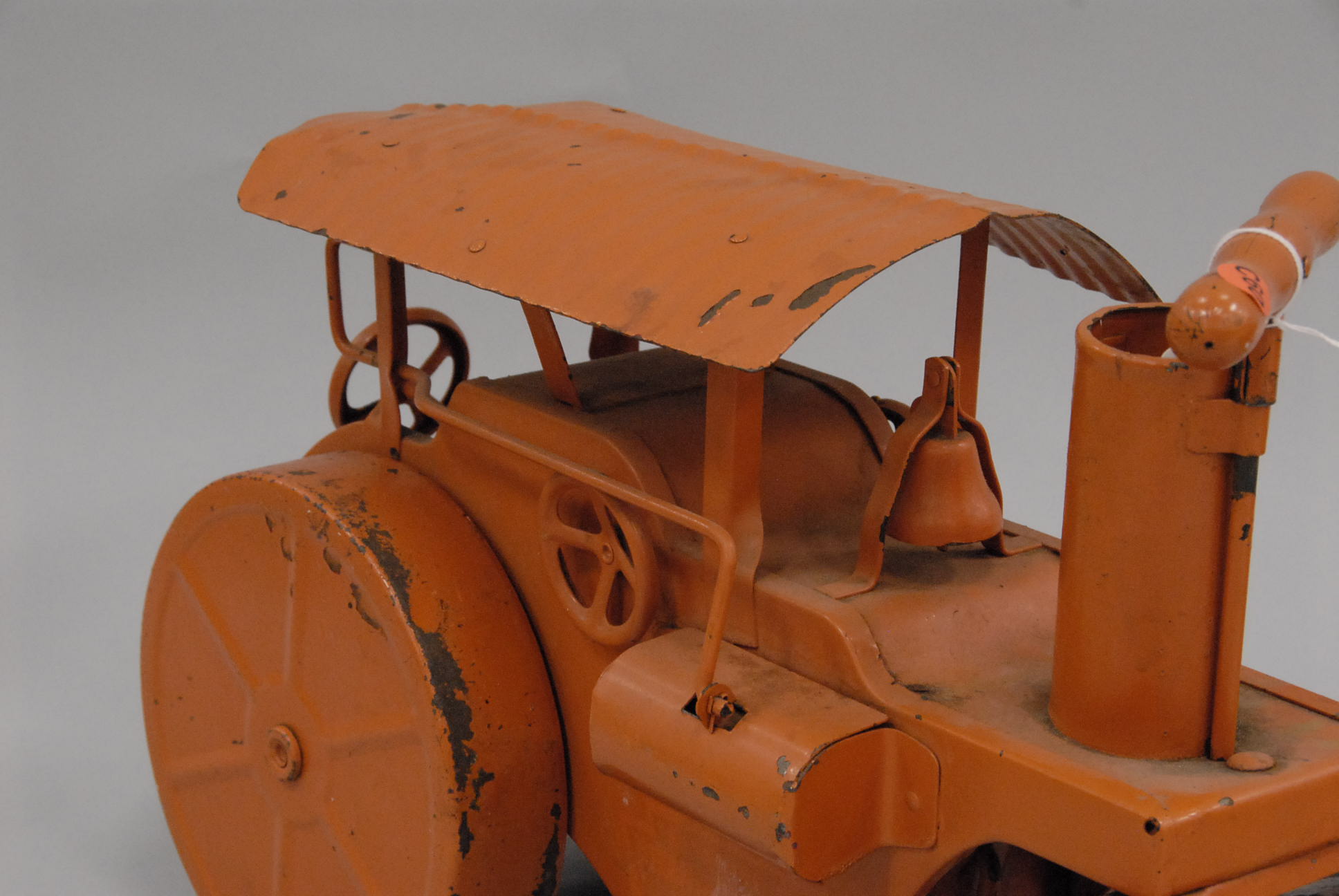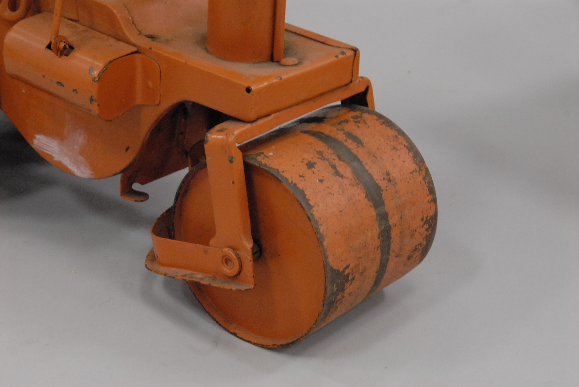 Vintage child’s toy Keystone ride on pressed metal steam roller painted orange