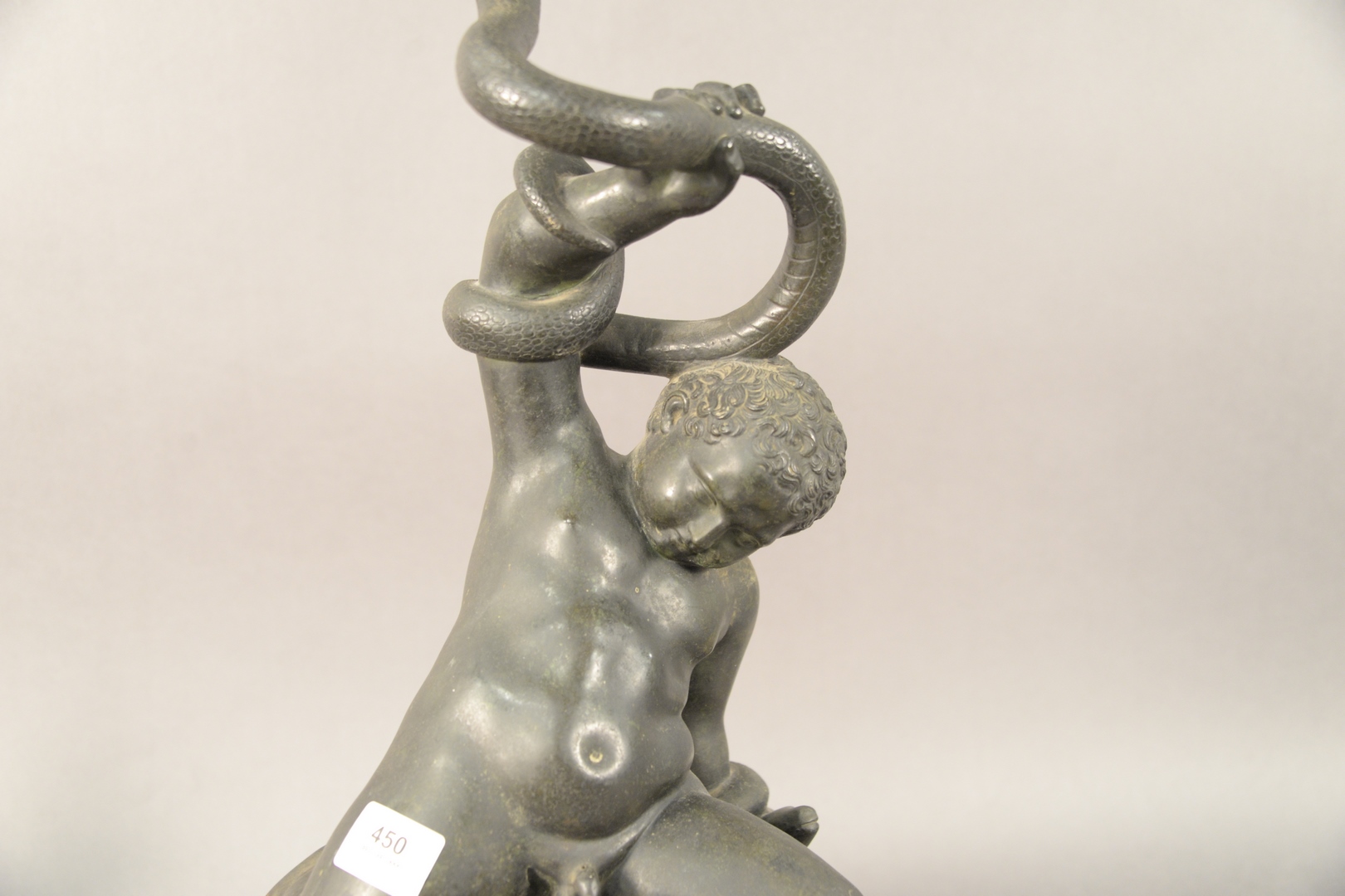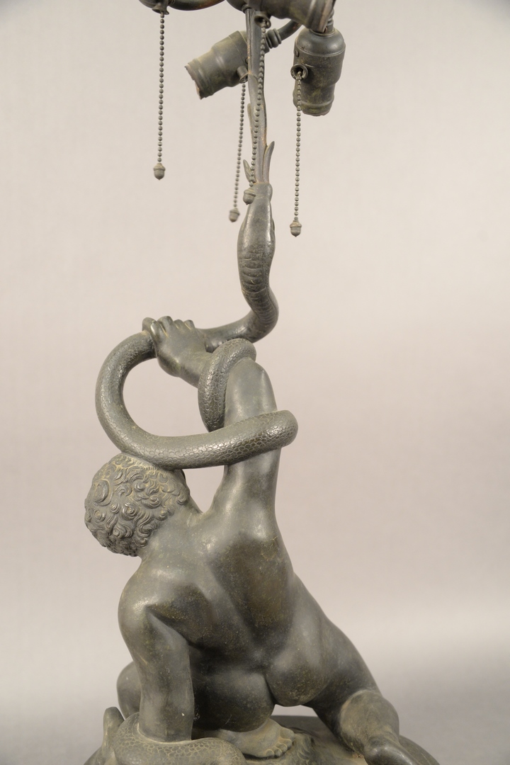 Lot 450: E.F. Caldwell Figural Bronze, male figure holding two serpents, mounted on a green marble base, made into a table lamp having four lights, overall height 34 1/2 inches, width 13 inches.
