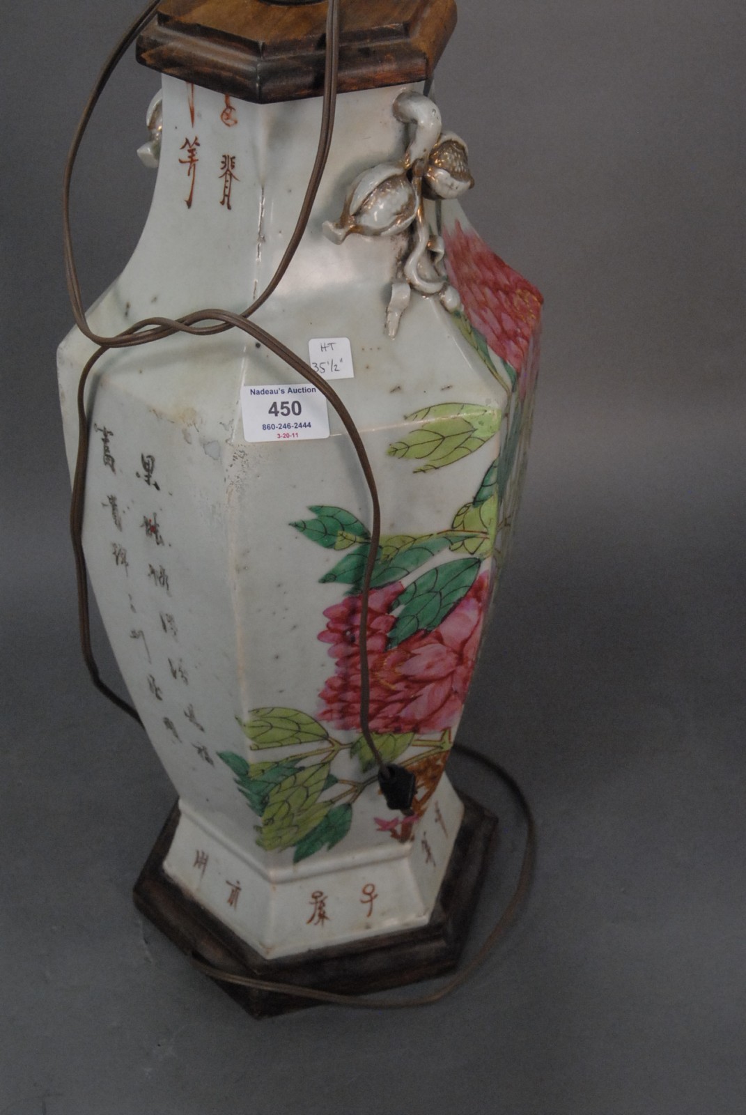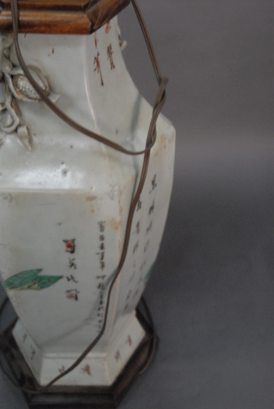 Famille Rose hexagon palace vase having large blossoming flowers and birds.