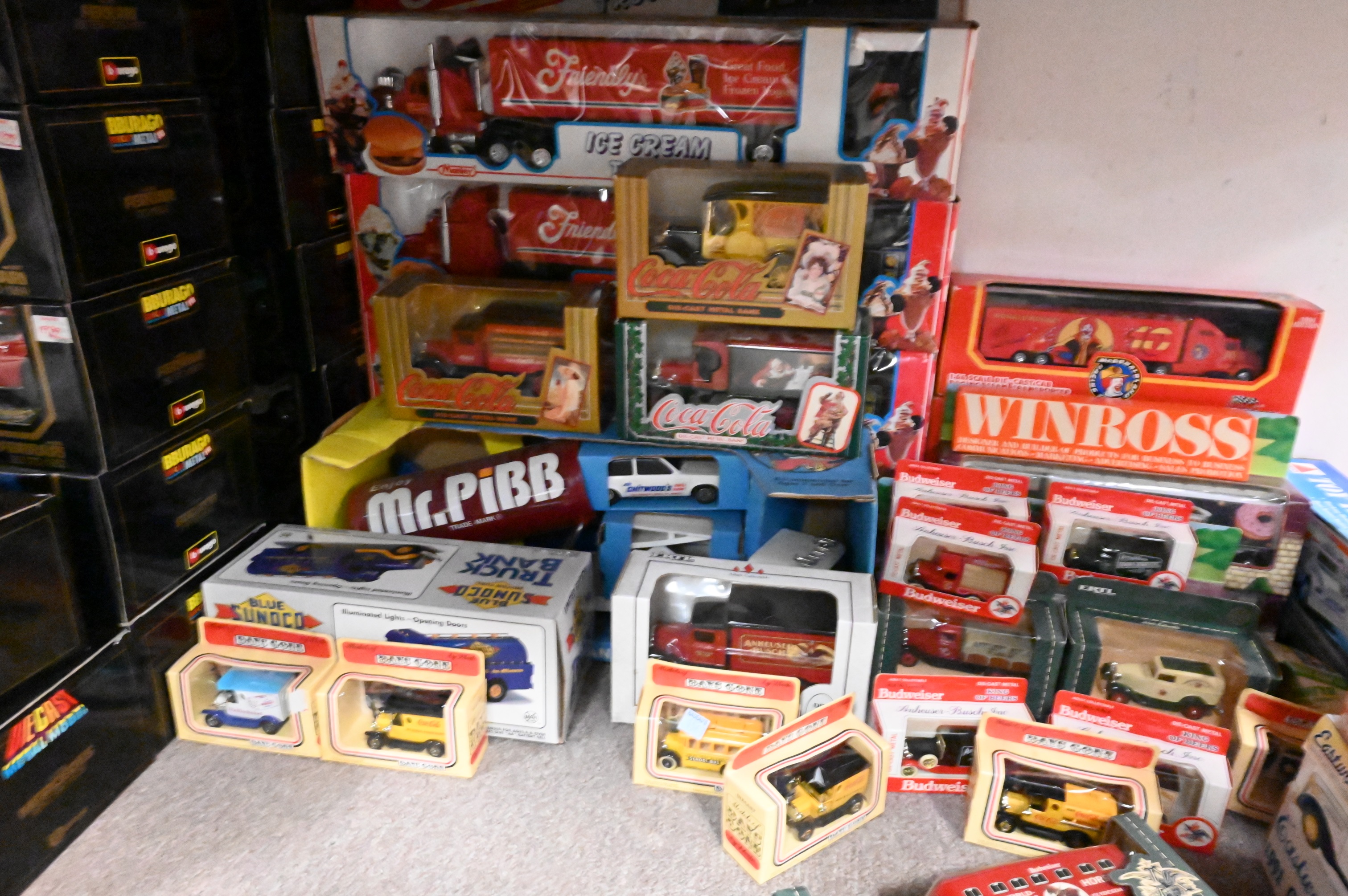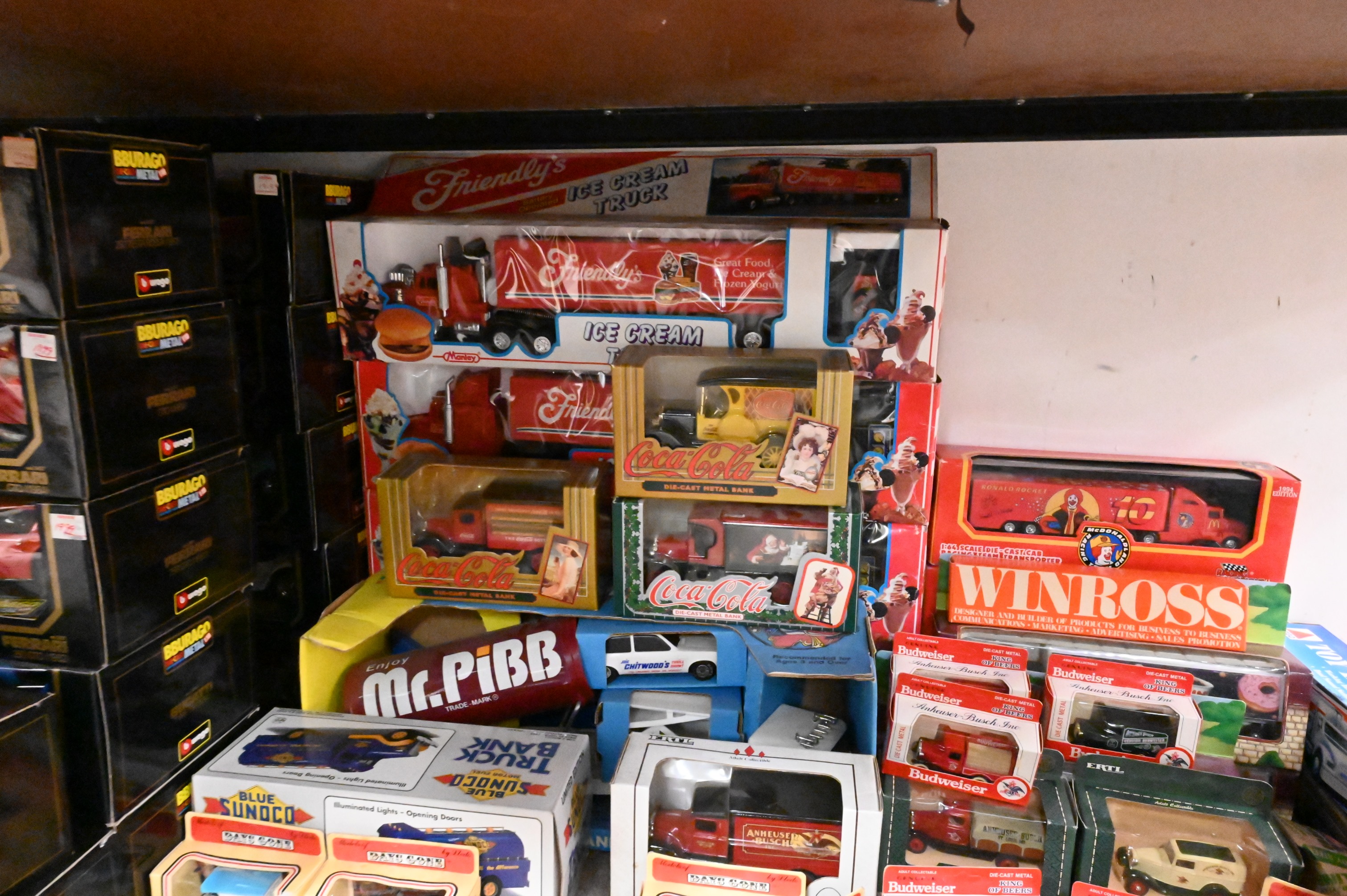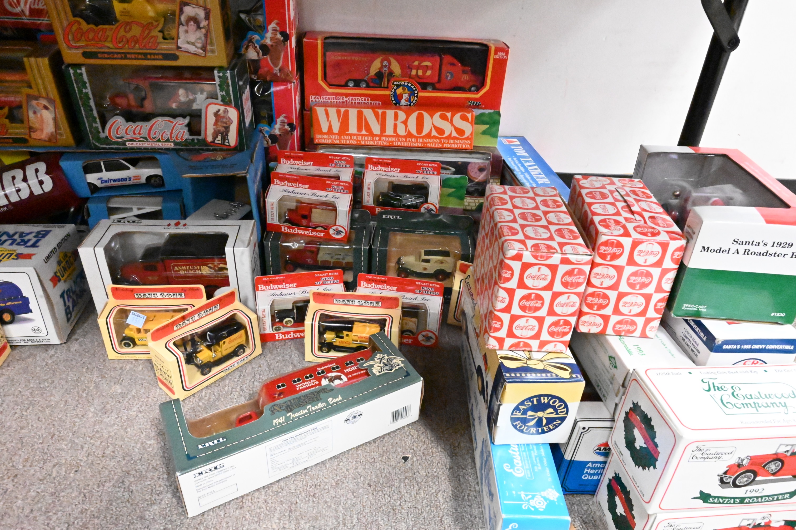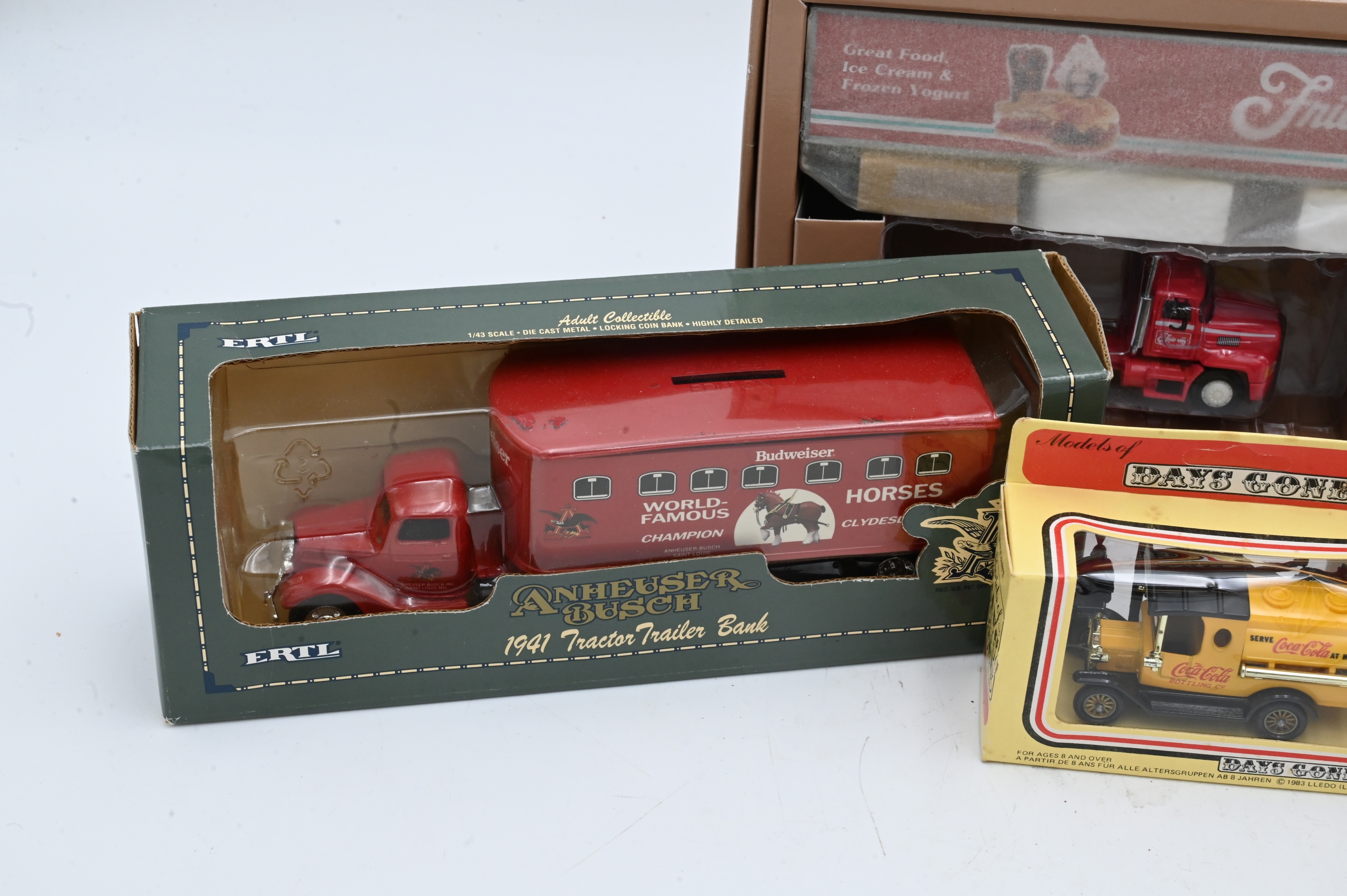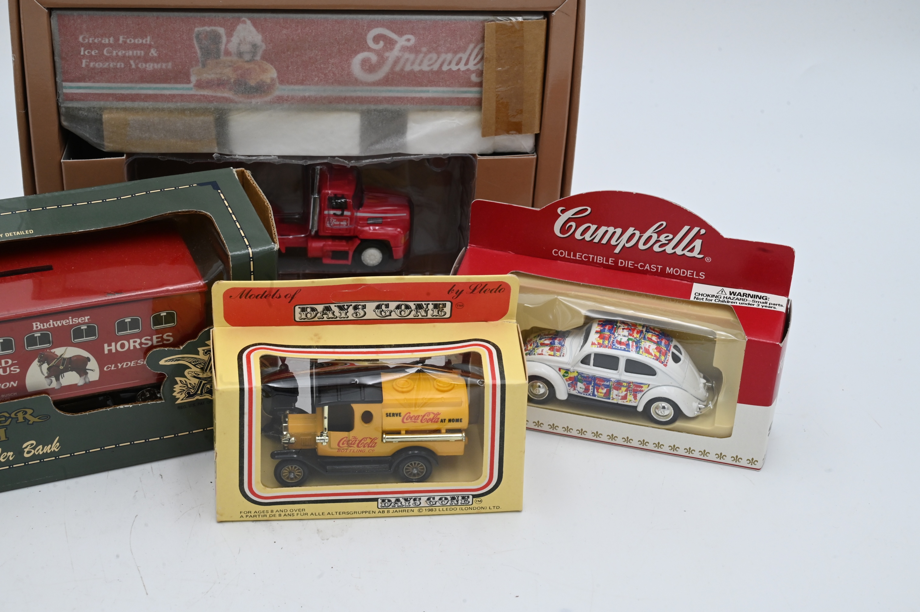 Large Grouping of Trademark Company Collectables, to include Friendly’s Ice Cream delivery truck, Coca Cola die cast metal bank and McDonald’s diecast truck etc., all in original packaging, (as is).
