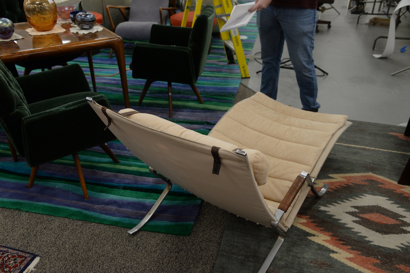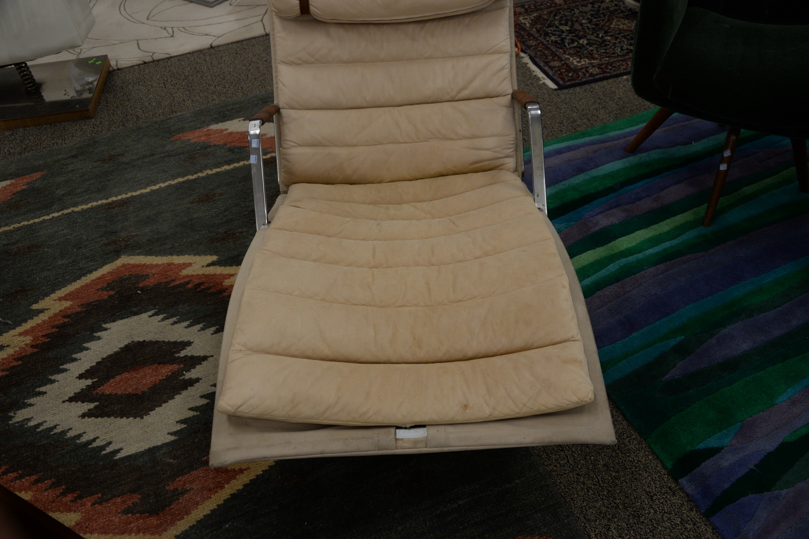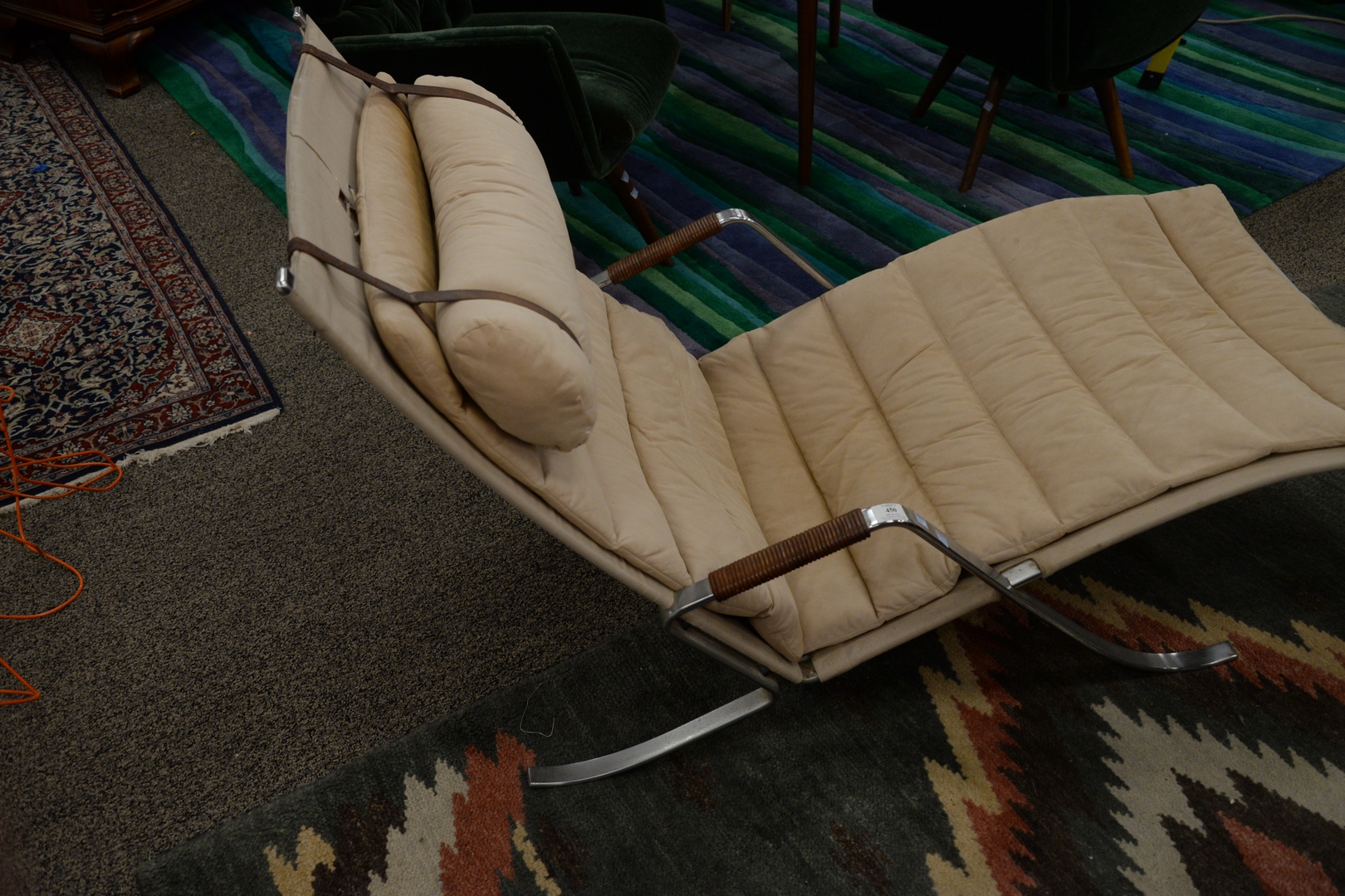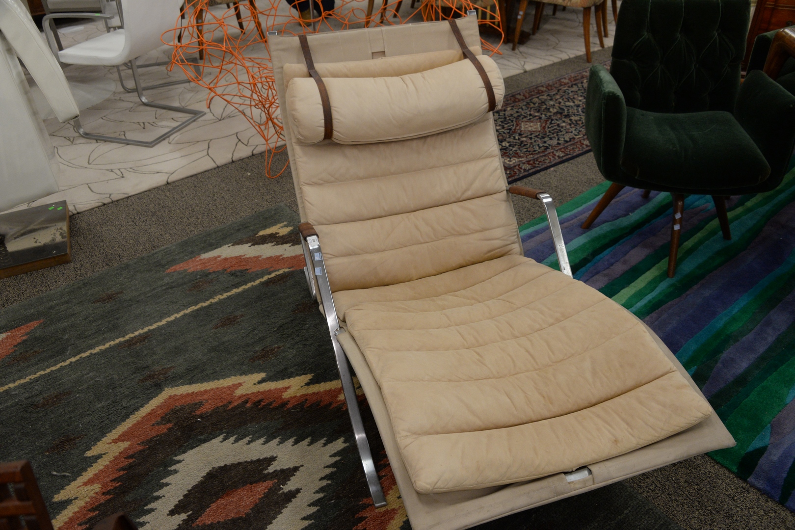 Lot 450: Probber Fabricius & Jorgen Kastholm Grasshopper Chaise Lounge, Alfred Kill, Denmark/Germany, 1968; having chrome plated steel, and canvas, height 32 1/2 inches, length 57 inches, width 28 inches. Provenance: The Estate of Alan Gans, Mulberry Point, Guilford.