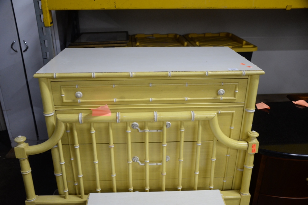Lot 450: Three Piece Faux Bamboo Bedroom Set in Yellow Paint, to include a twin sized headboard, night stand, along with a four drawer dresse…