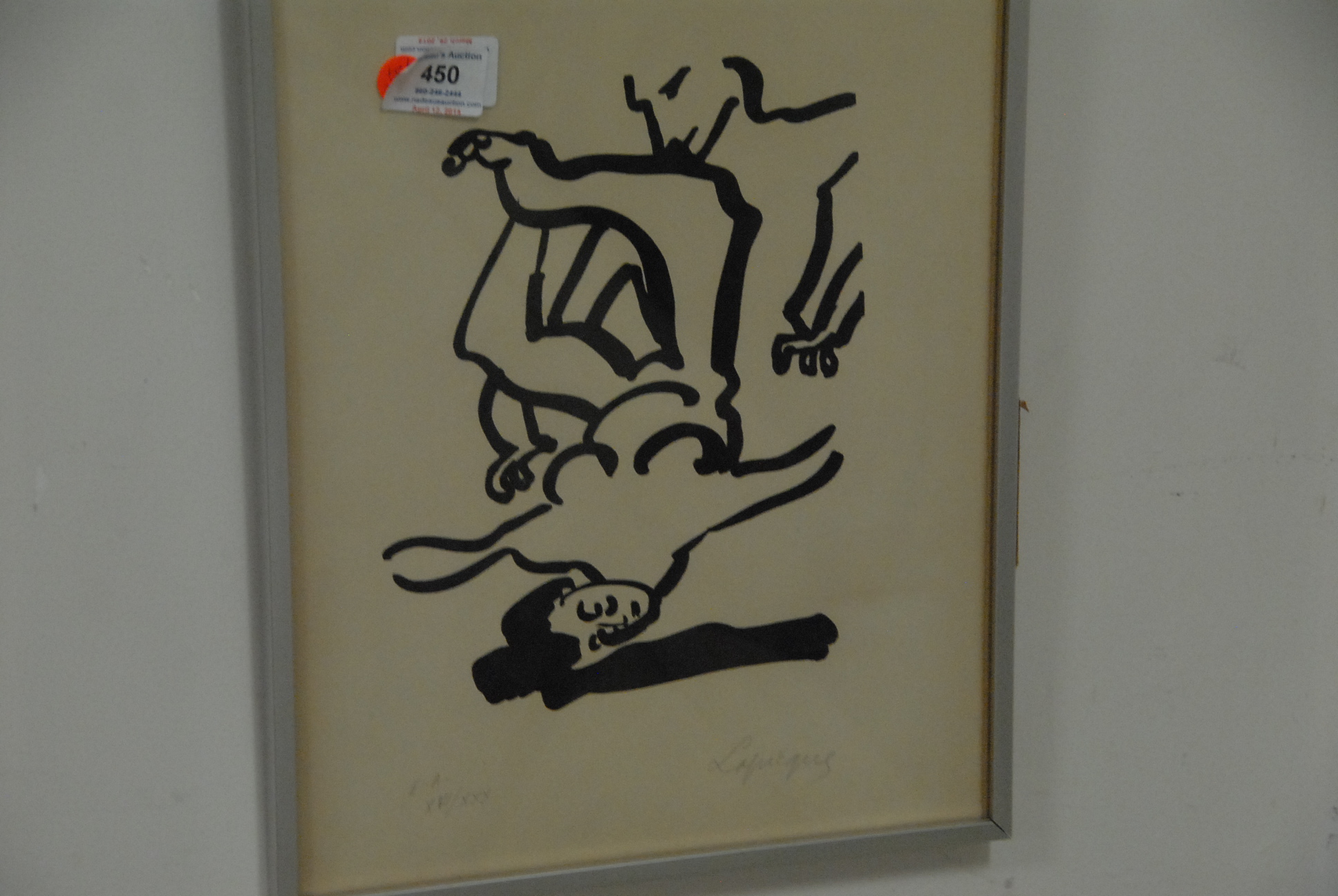 Three piece lot to include two Leon Zack 1892-1980 composition lithographs, one framed, one signed lower right Leon Zack 58 21 3/4 x 16 3/4, other signed lower right Leon Zack 76 13 3/4 x 18 3/4 Charles Lapicque 1898-1988 lithograph of nudes signed lower right Lapicque and marked lower left E. A. XVI/XXX 14 3/4 x 11.