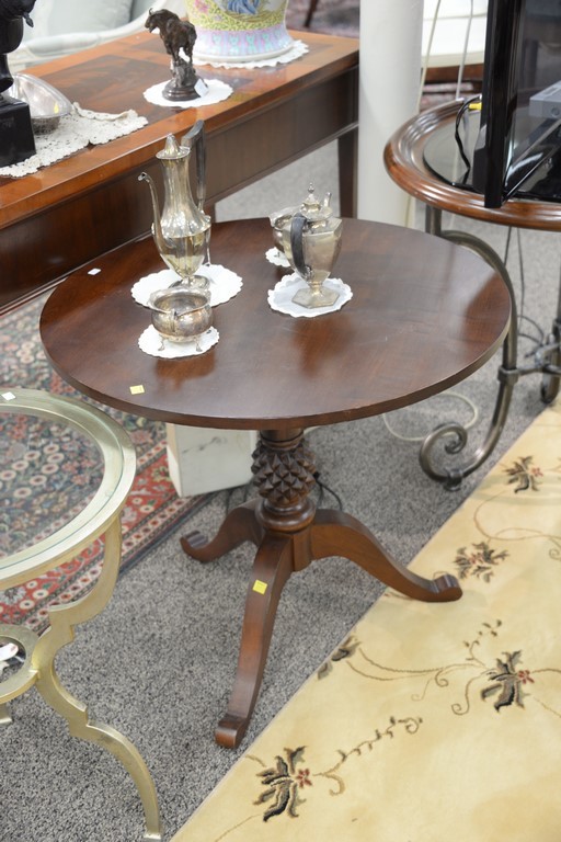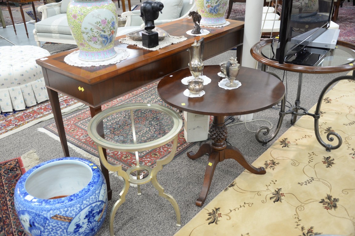 Lot 450: Three tables including Ethan Allen and two glass top. ht. 24in., dia. 17in., ht. 29in., dia. 30in., and ht. 26in., dia. 28in.
