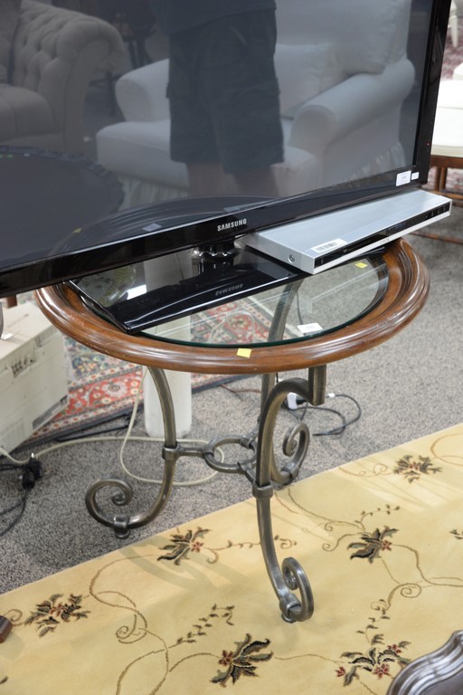 Three tables including Ethan Allen and two glass top. ht. 24in., dia. 17in., ht. 29in., dia. 30in., and ht. 26in., dia. 28in.