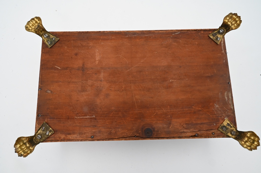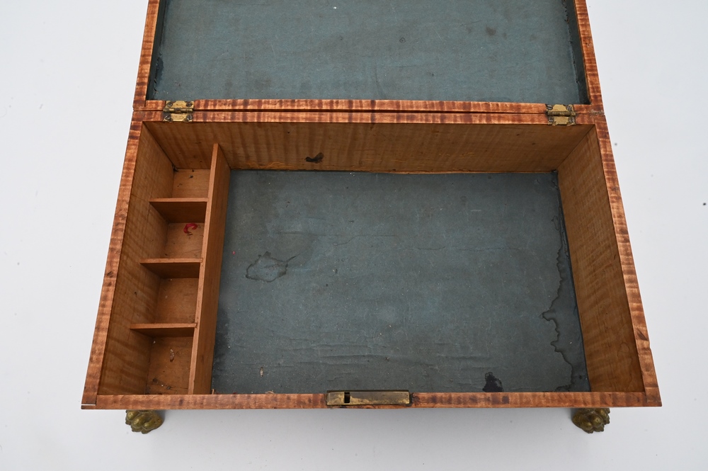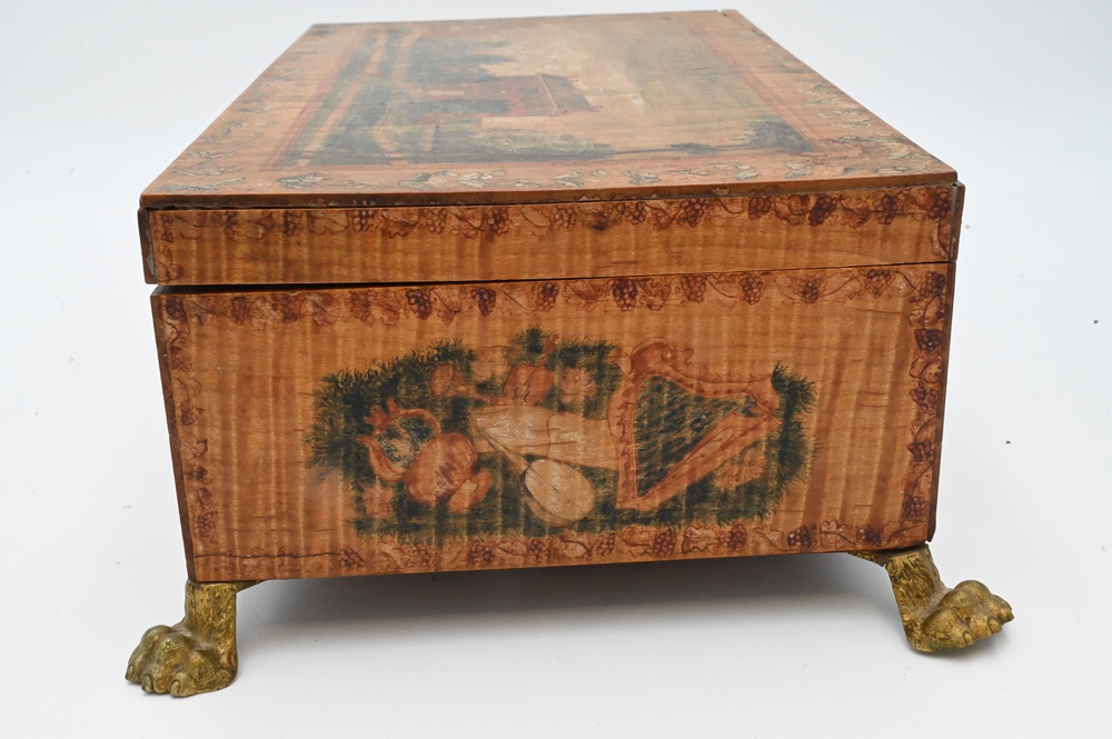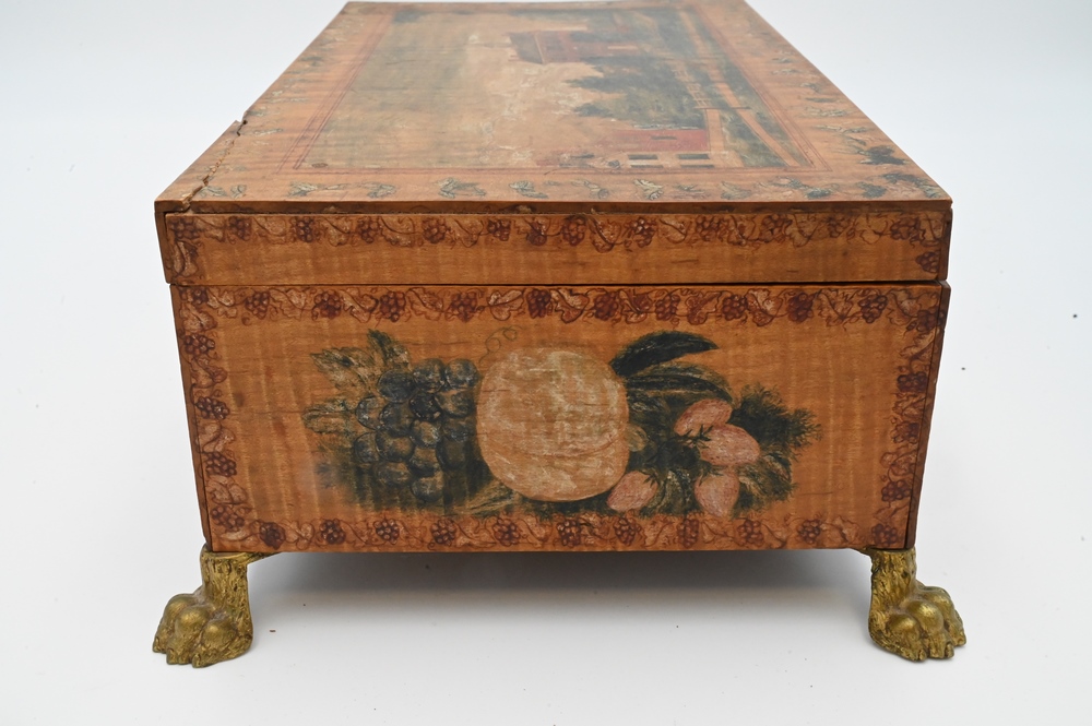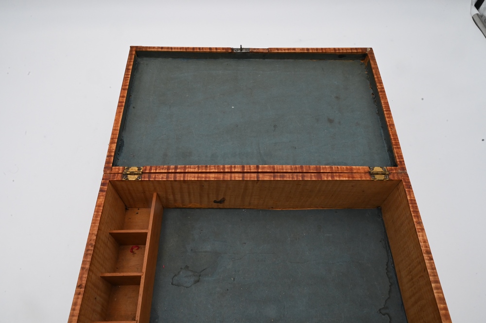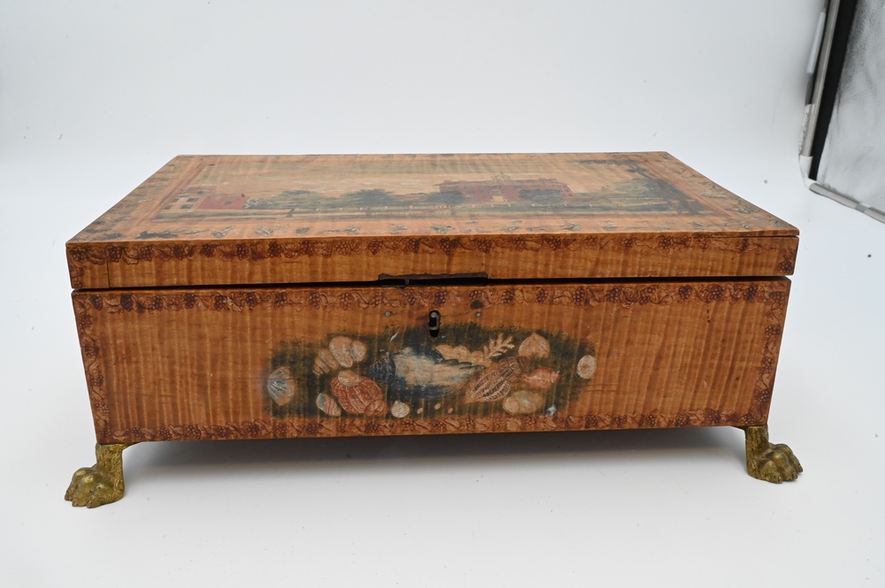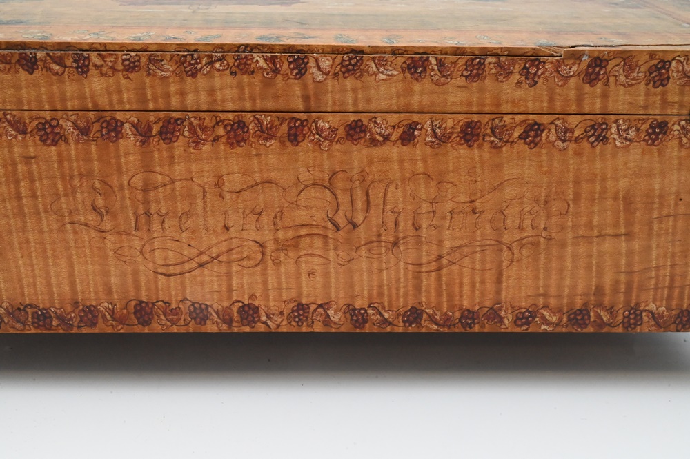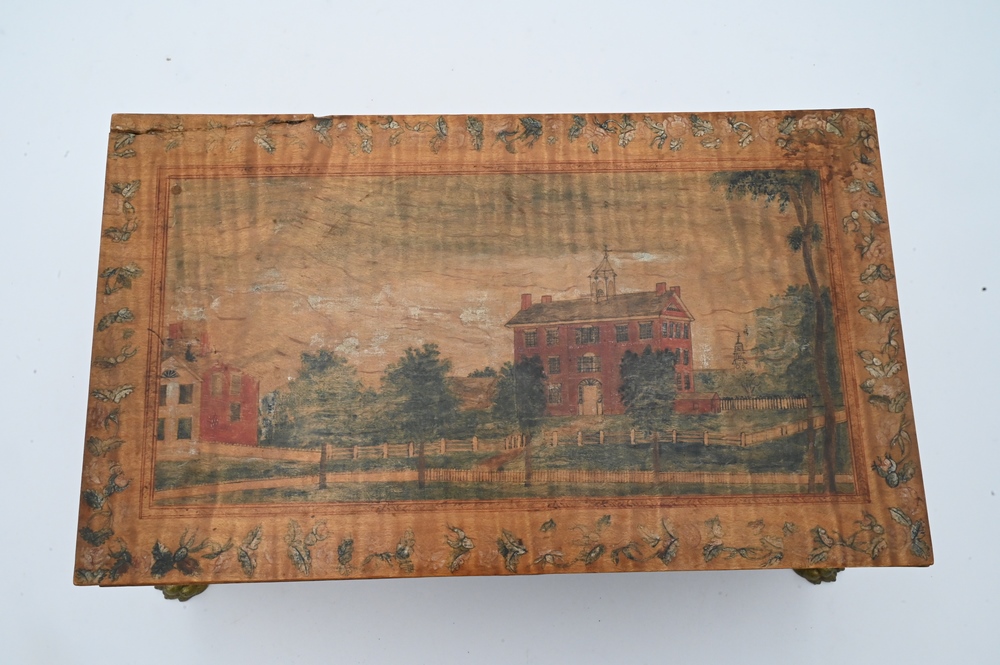 Tiger Maple Lift Top Box, having paint decorated top depicting Bacon Academy Colchester, CT and Emeline Whitman on reverse, literature, height 5 inches, top 7 7/8″ x 13 1/2″. Note: Myron Newton Morris (November 19, 1810 – July 9, 1885) was an American minister and politician. Morris, the youngest child of Newton J. and Eunice (Newton) Morris, was born on one of the Yale College farms in Warren, Litchfield County, Connecticut, November 19, 1810. After his father’s death, in 1830, he took charge of the farm for a year or two, and was then at length able to begin his preparation for Yale, where he graduated in 1837. After graduation he was principal of Bacon Academy, in Colchester, Conn., until the summer of 1838, and again from March, 1840, until the summer of 1843; in the interval he was instructor in the Teachers’ Academy, Andover, Mass. He began theological studies while in Andover, and was licensed to preach shortly after his final withdrawal from Bacon Academy. He had married, January 10, 1838, Julia S., daughter of Elisha Avery, of Colchester, and he retained his residence there—engaged in farming, private teaching, and preaching—until January, 1845, when he removed to Norwich, Conn, where he served as teacher in the academy for two terms. While living there he accepted a call to the Congregational Church in North Stonington, Connecticut, over which he was ordained, April 15, 1846. After a pleasant pastorate of six years, he was induced, chiefly for the sake of educational advantages to his children, to accept a thrice-repeated call to the Congregational Church in West Hartford, Conn, where he was installed, July 1, 1852 His service there was terminated by his resignation, April 27, 1875, but his home continued among his people. While still a pastor in July, 1867, he was elected a Fellow of Yale College, and this office he retained until his death. He was twice a Representative (in 1872 and 1875) from West Hartford to the Connecticut Legislature, and for many years one of the school-visitors for the town. He died in West Hartford, after four days’ illness, from pleurisy, July 9, 1885, in his 75th year. His wife died March 26, 1854 and he next married, May 8, 1855, Emeline, youngest daughter of Samuel Whitman, of West Hartford, who survived him, as did a daughter and two sons by his first marriage, and a son by his second marriage; two sons died in infancy, and a third in early manhood. He published three historical discourses. In a Memorial volume which has been issued by the church in West Haitford, a tribute is paid to his character and services.