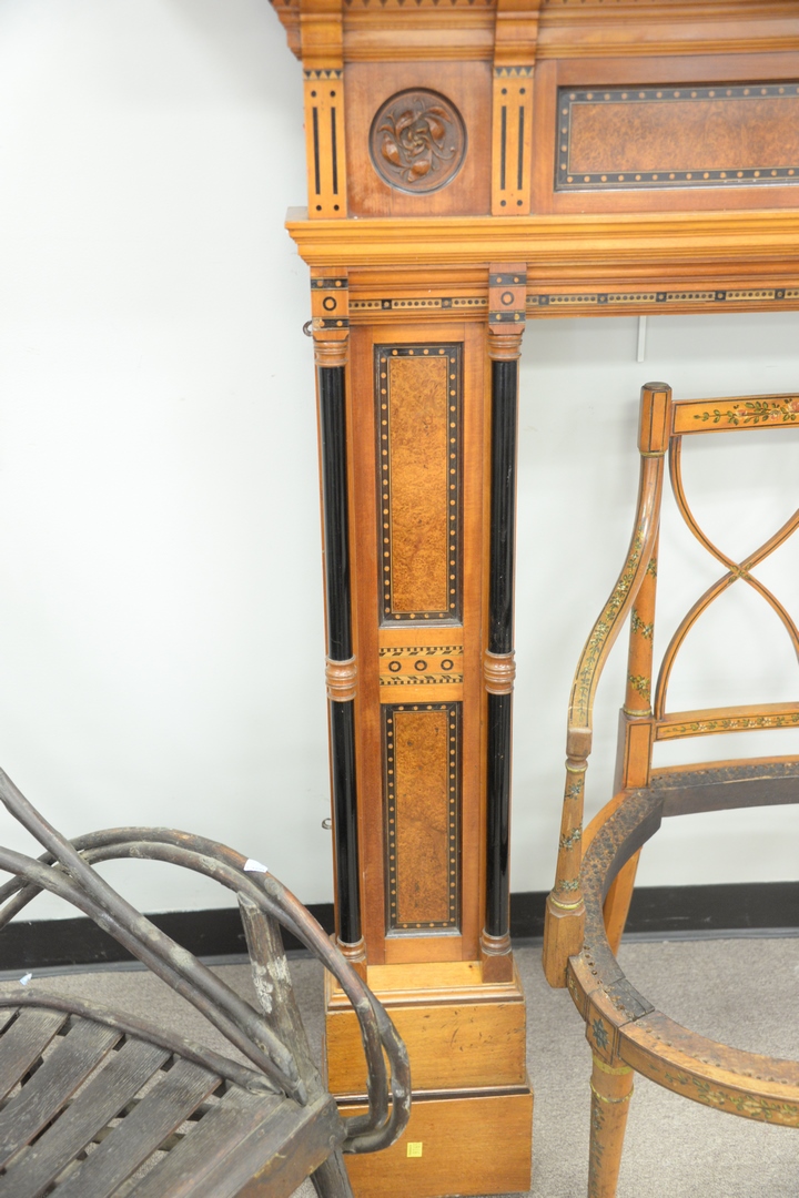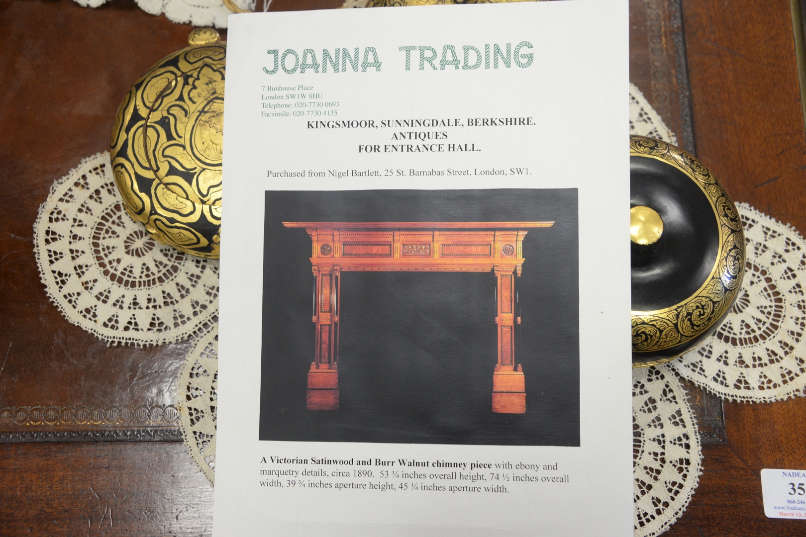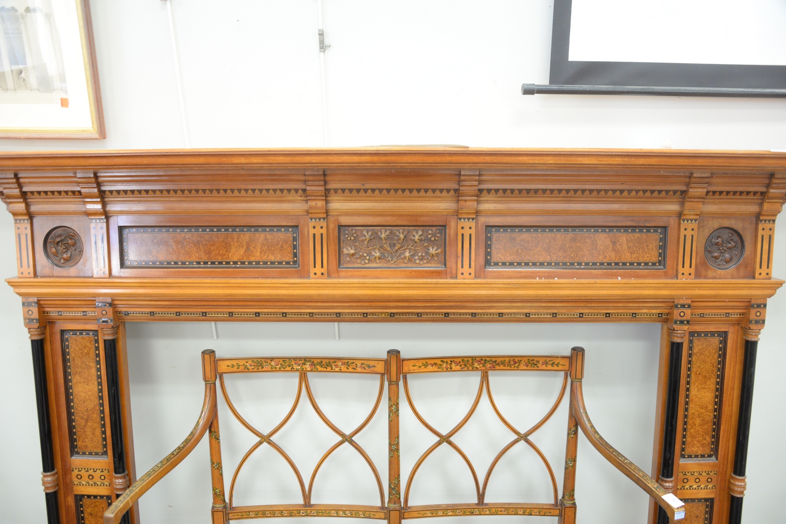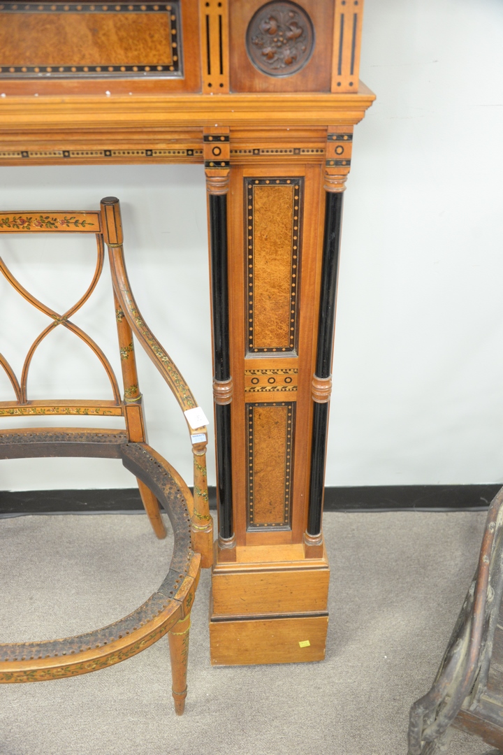 Lot 450: Victorian Satinwood and Burl Walnut Fire Mantle, with ebony and marquetry, circa 1890, height 54 inches, width 75 inches, opening he…