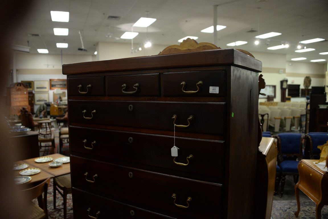 Lot 451: Chippendale mahogany chest on frame having replaced top molding over three short drawers over five drawers all set on frame with fan…