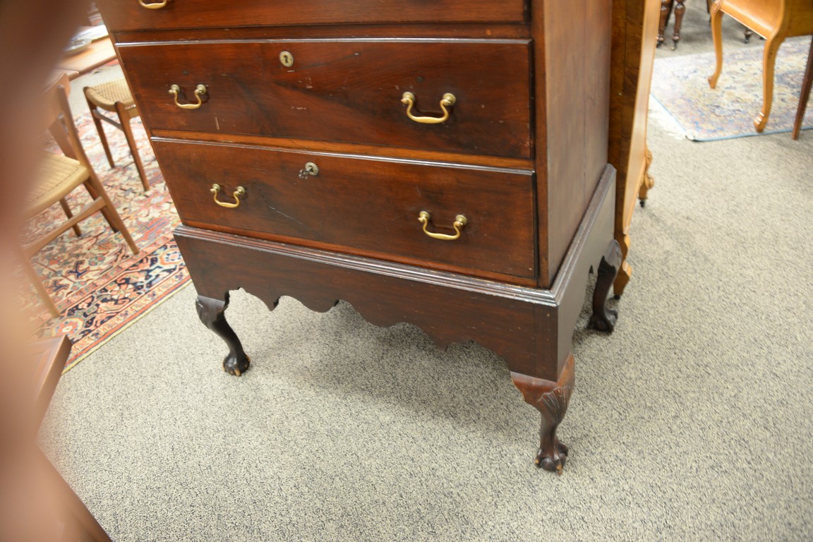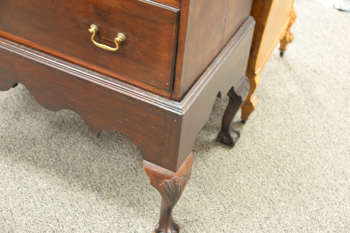 Chippendale mahogany chest on frame having replaced top molding over three short drawers over five drawers all set on frame with fan carved cabriole legs ending in ball and claw feet, 18th century.