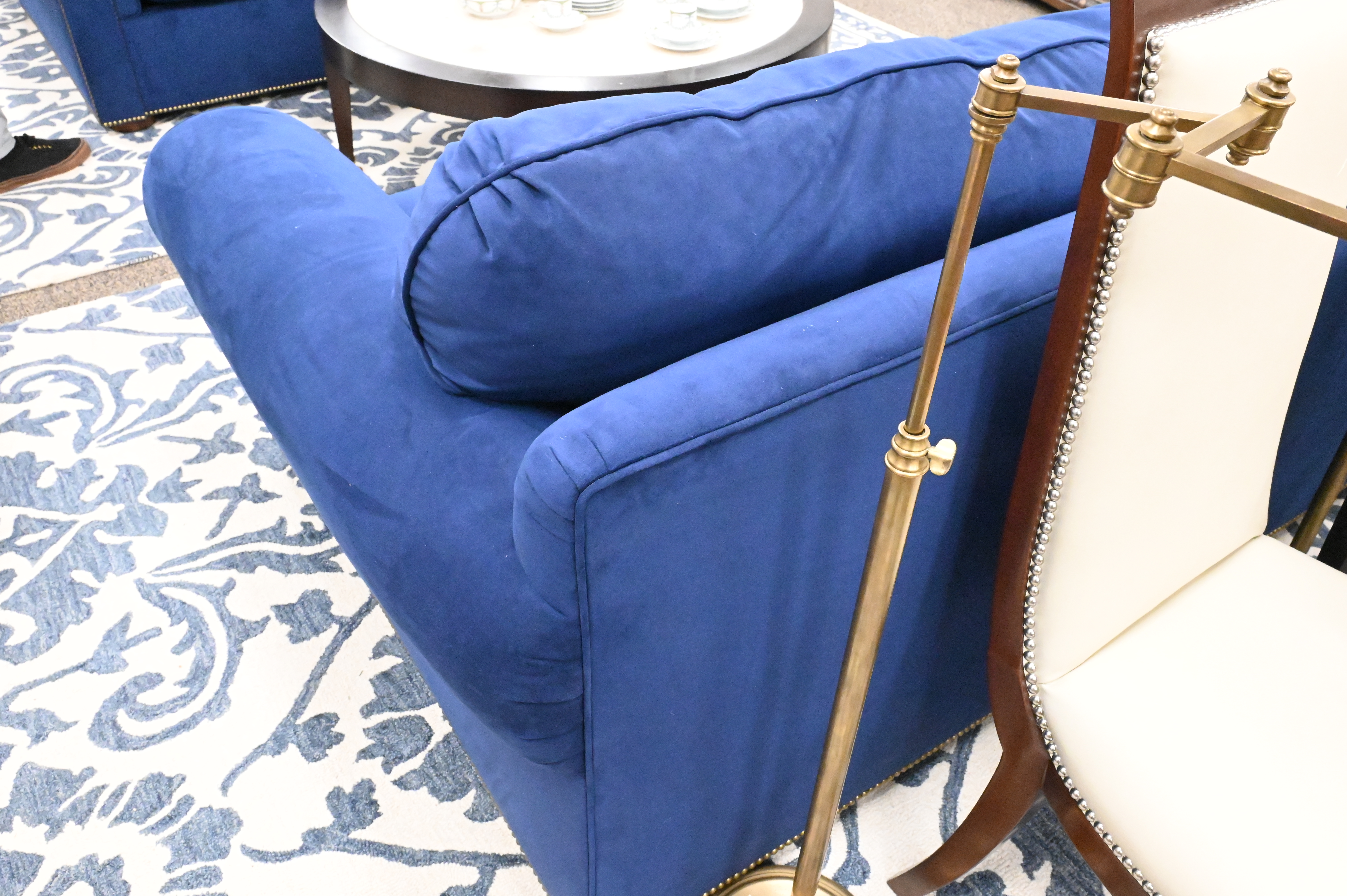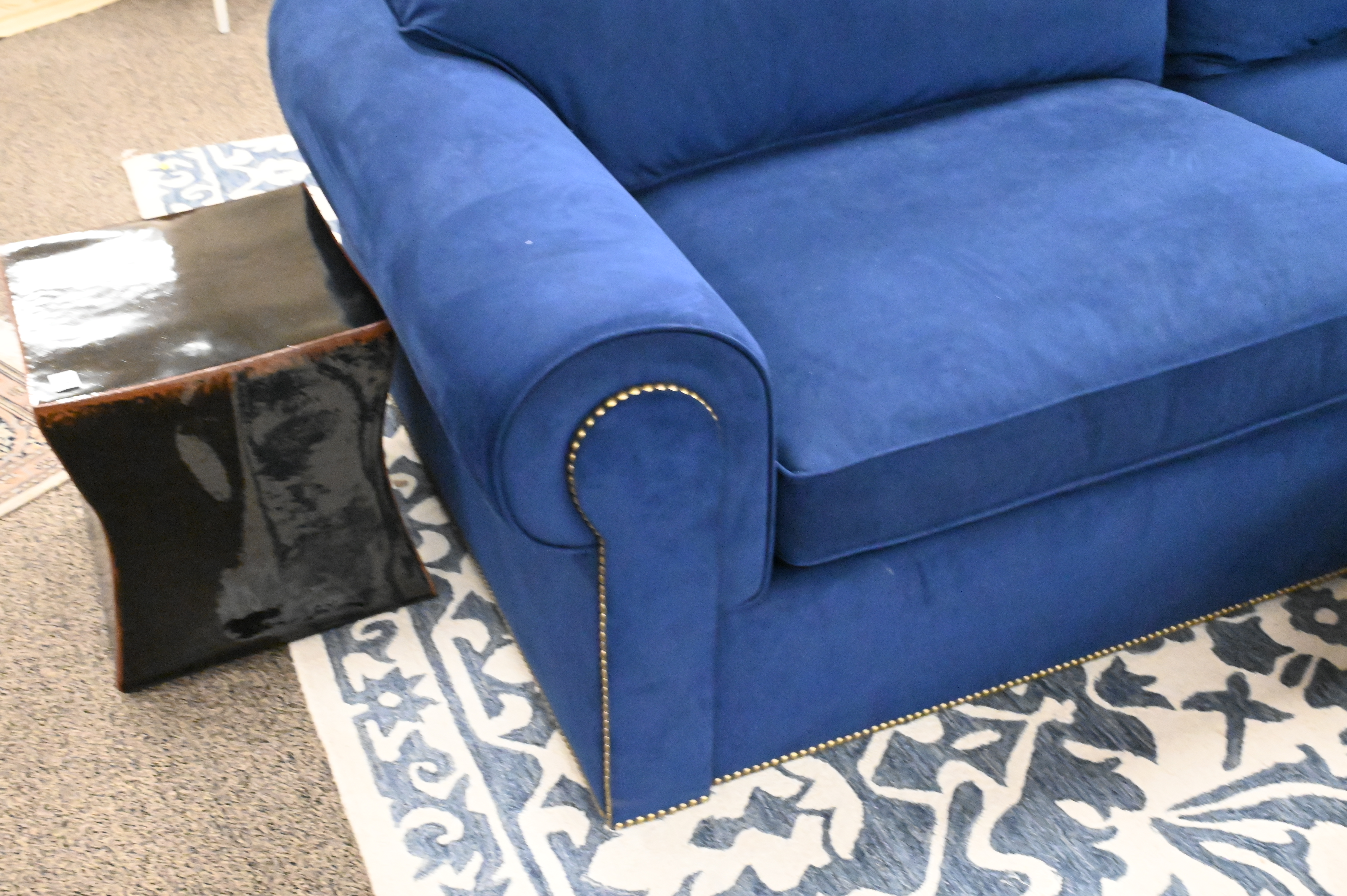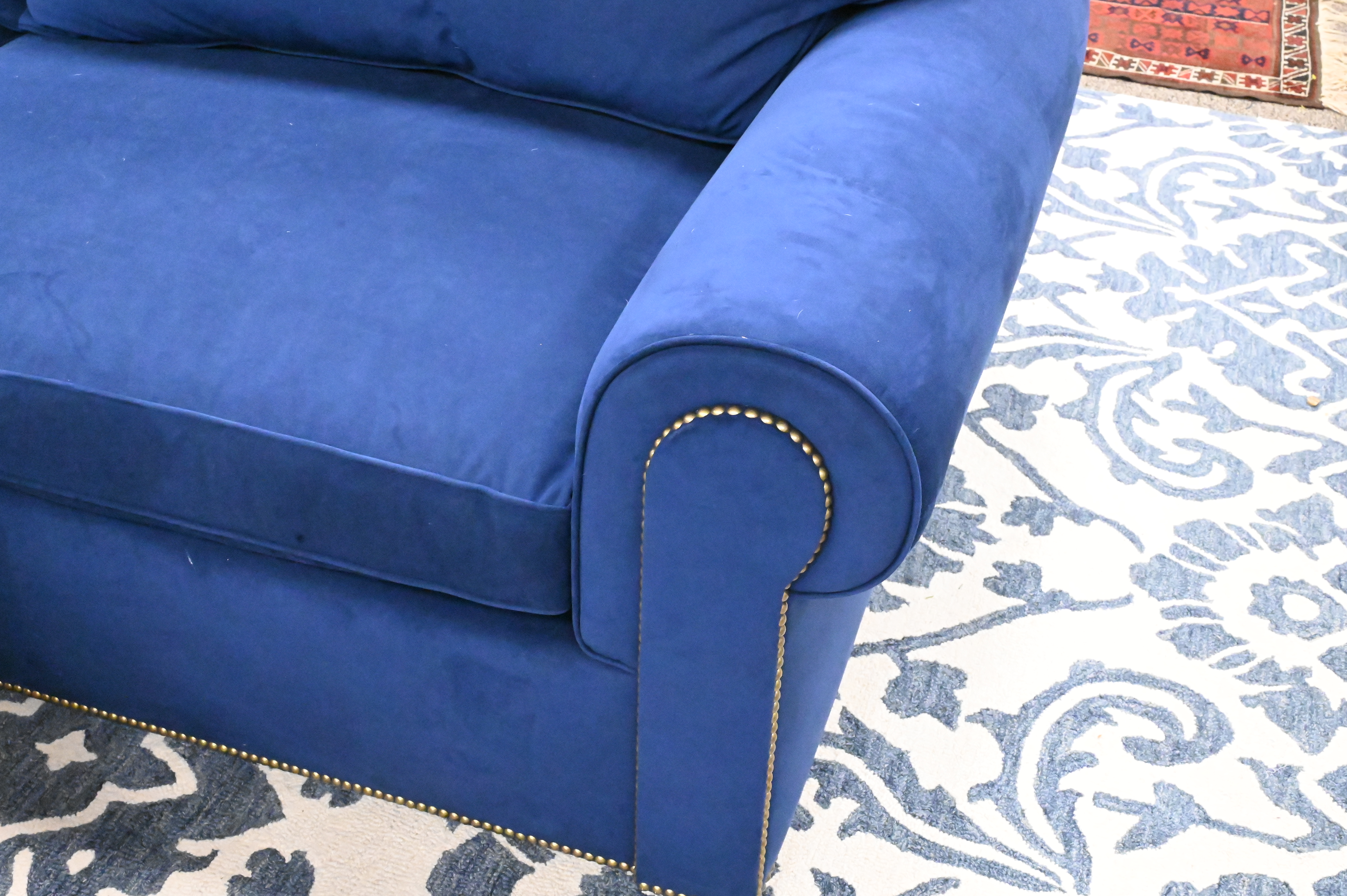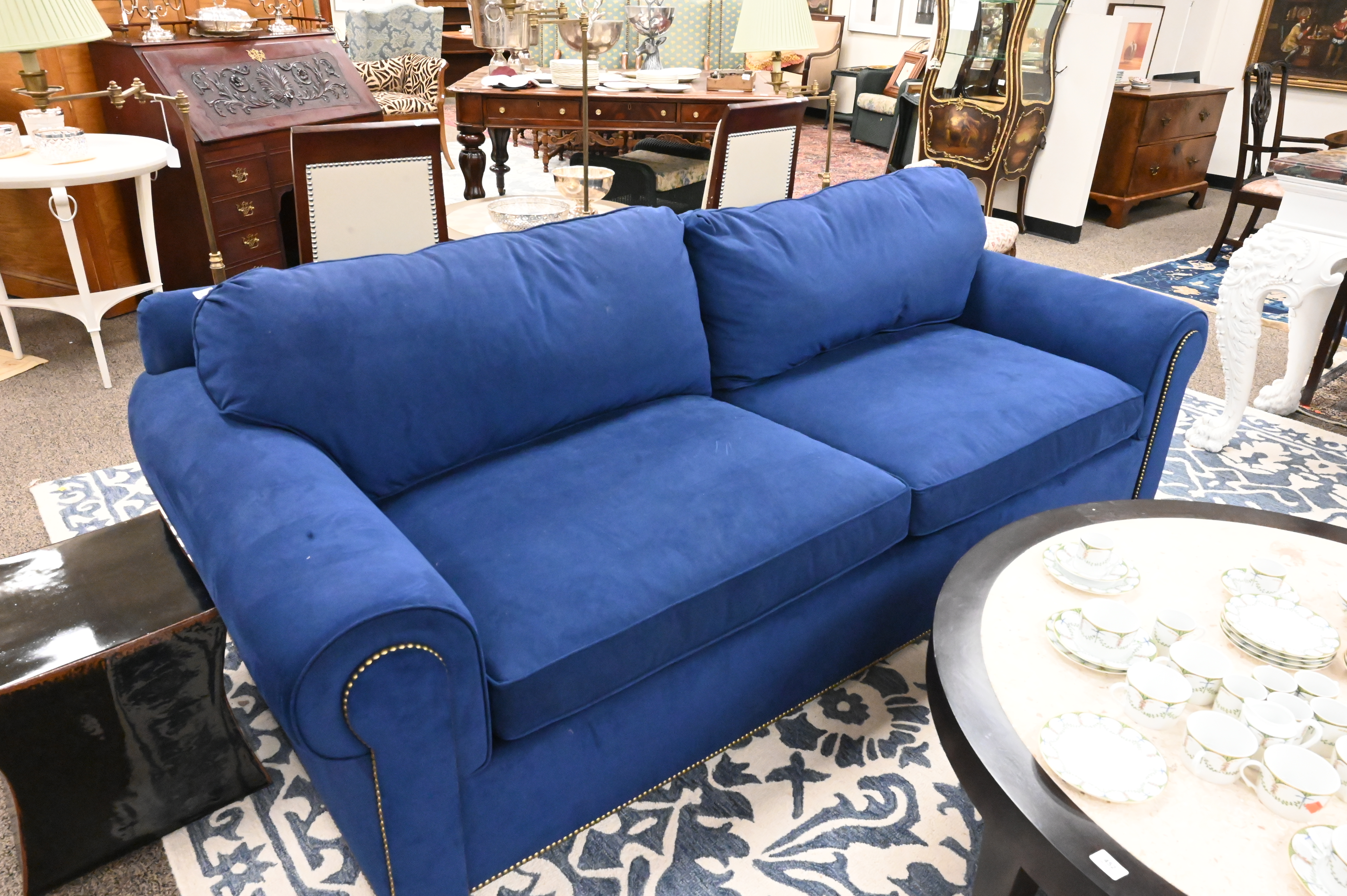 Custom Upholstered Sofa, having royal blue upholstery, tac edging, rolled arms, along with goose and down feather cushions, height 30 inches, seat height 18 inches, overall length 94 inches, seat length 74 inches, overall depth 42 inches, seat depth 26 inches.