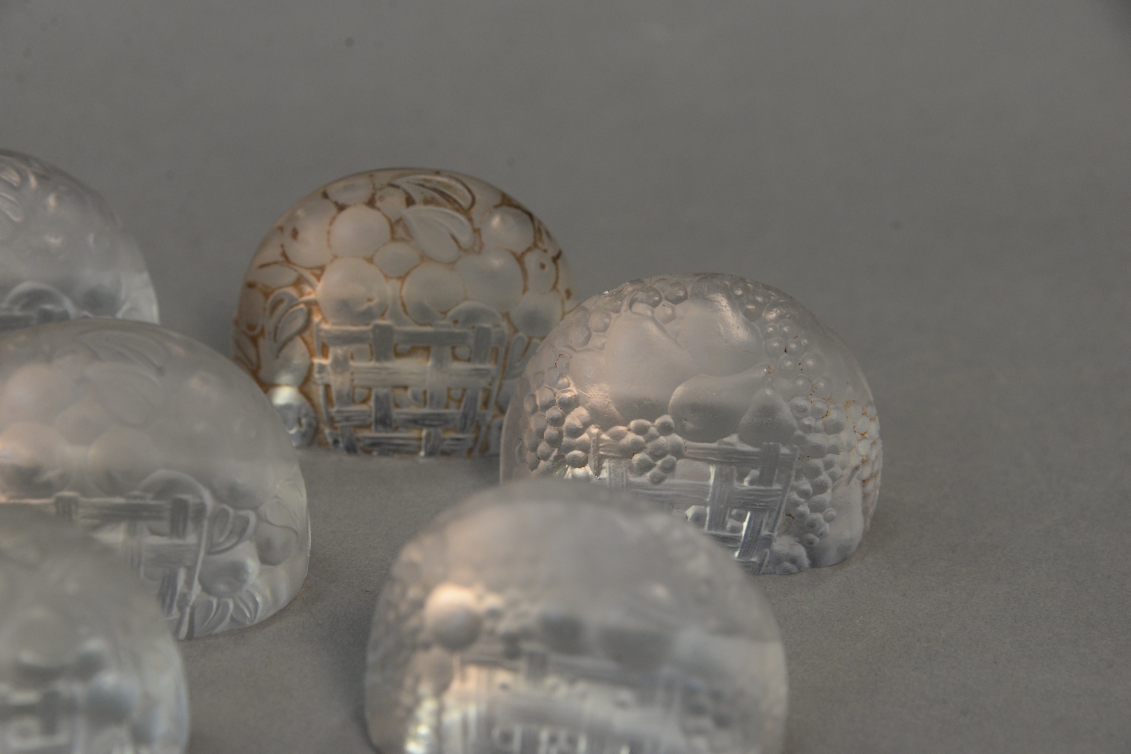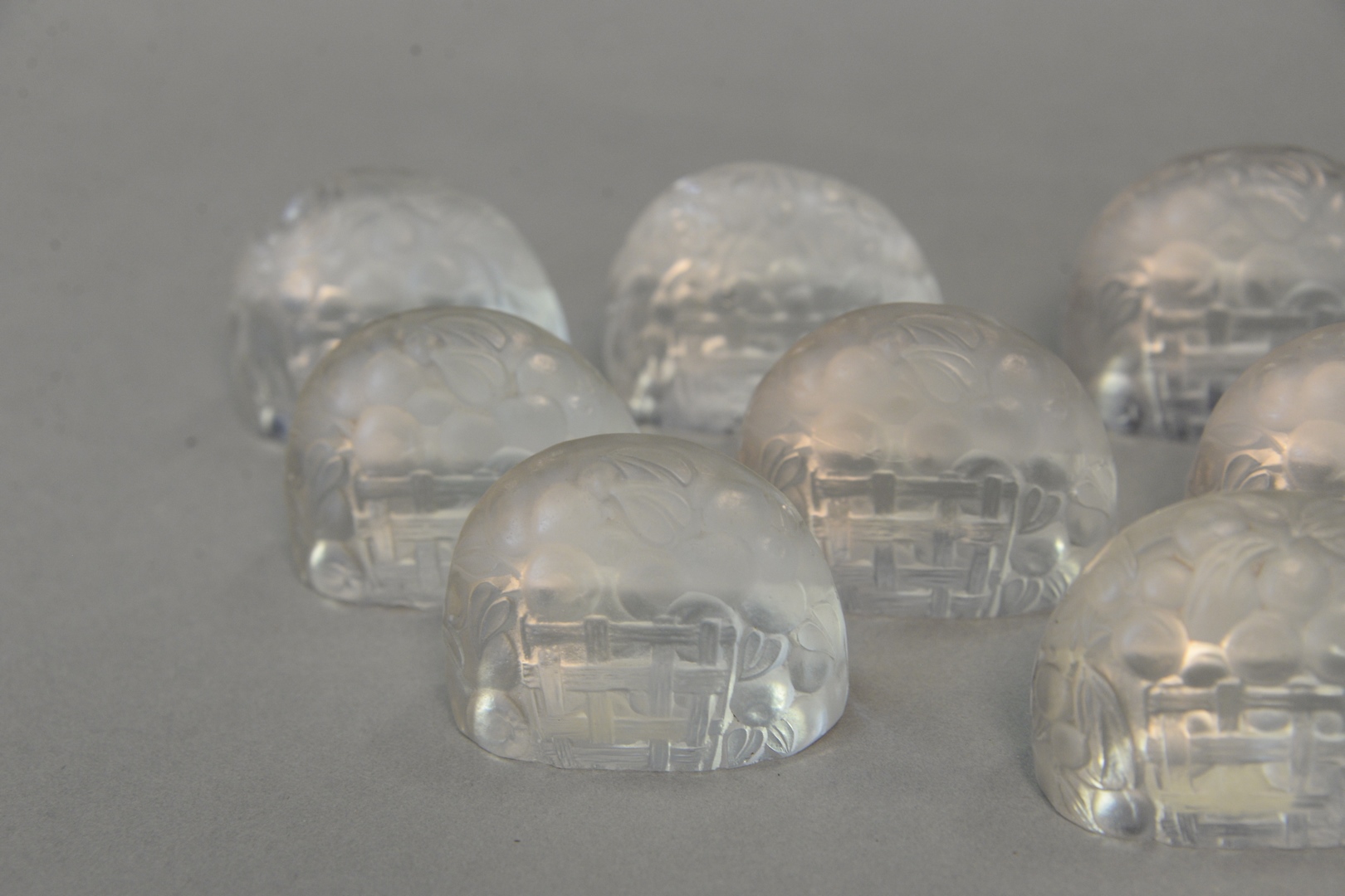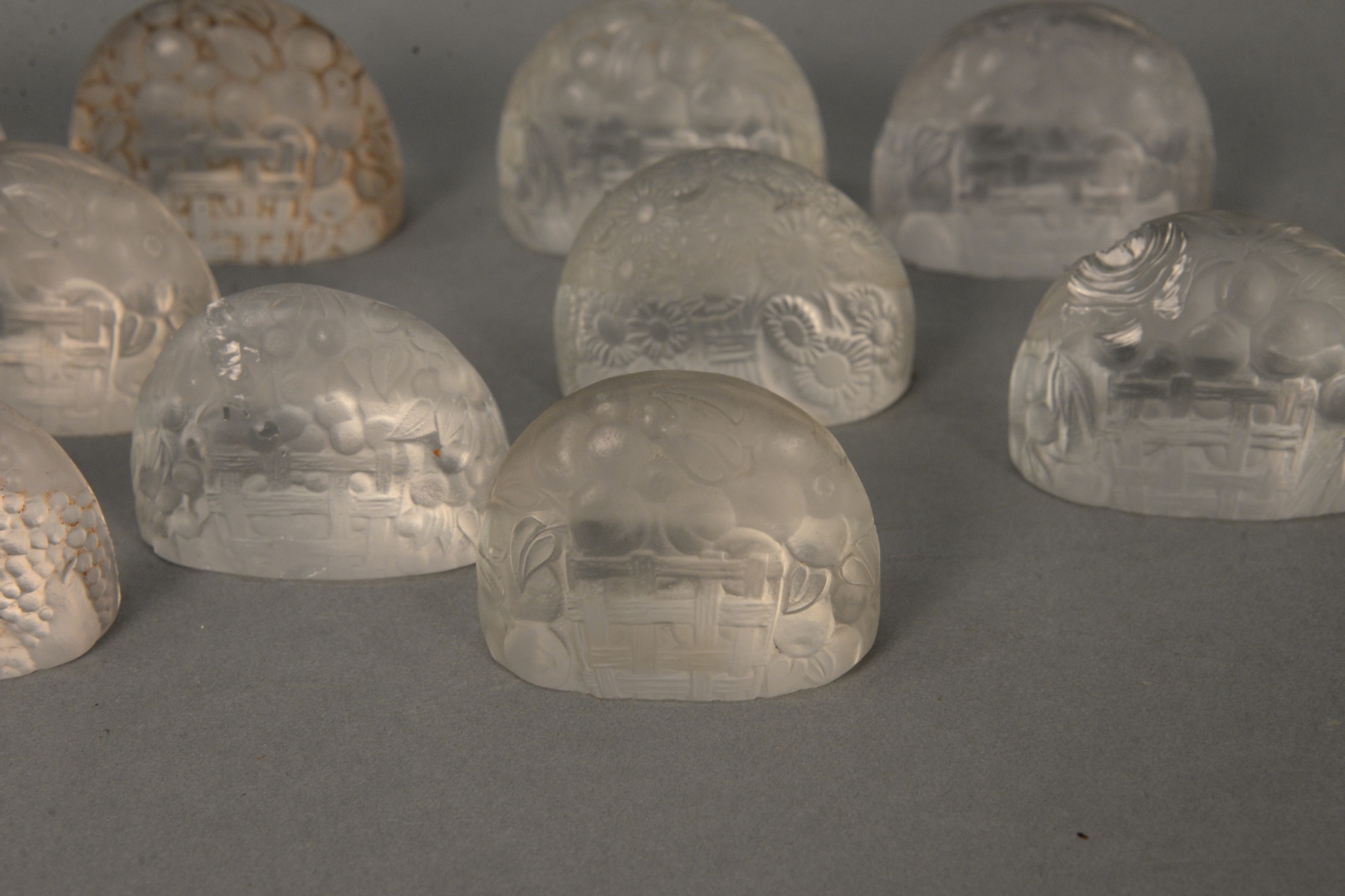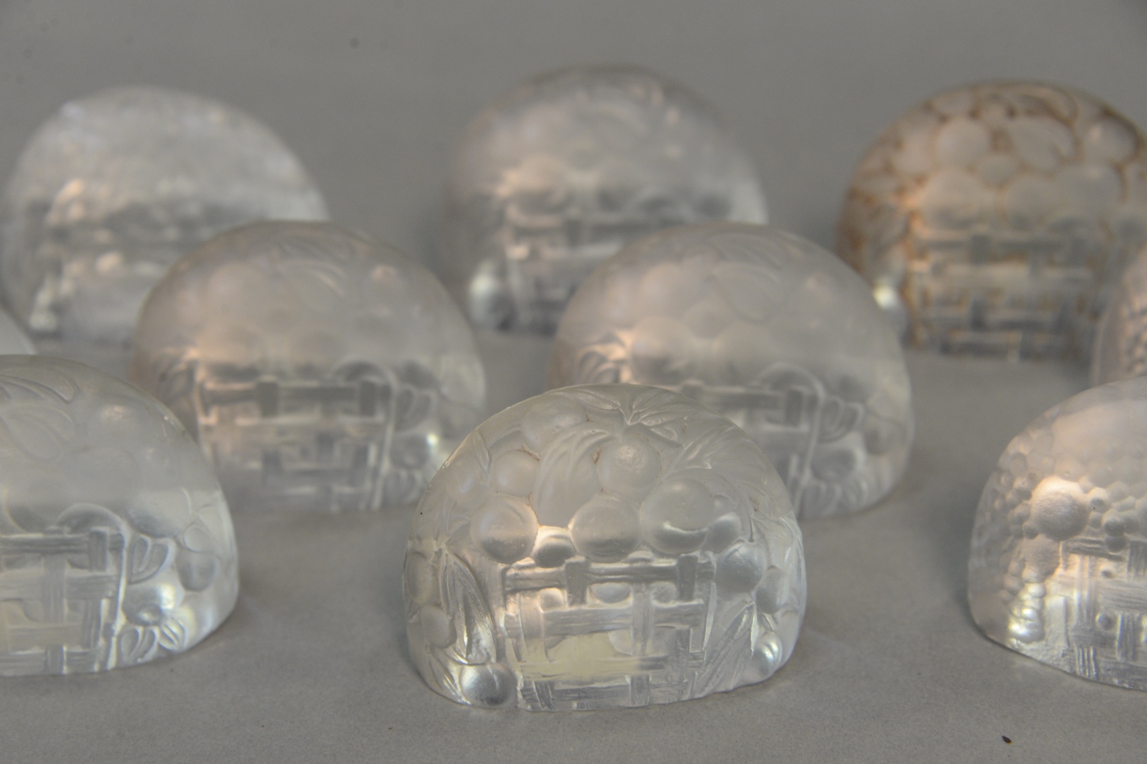 Lot 451: Eleven Lalique Panier De Fruits Place Cards or Menu Holders etched and frosted glass in the form of a basket of fruit marked R…