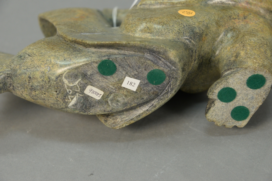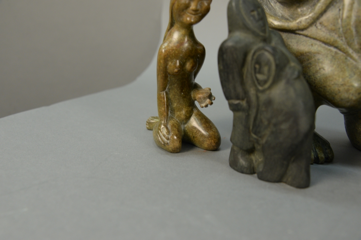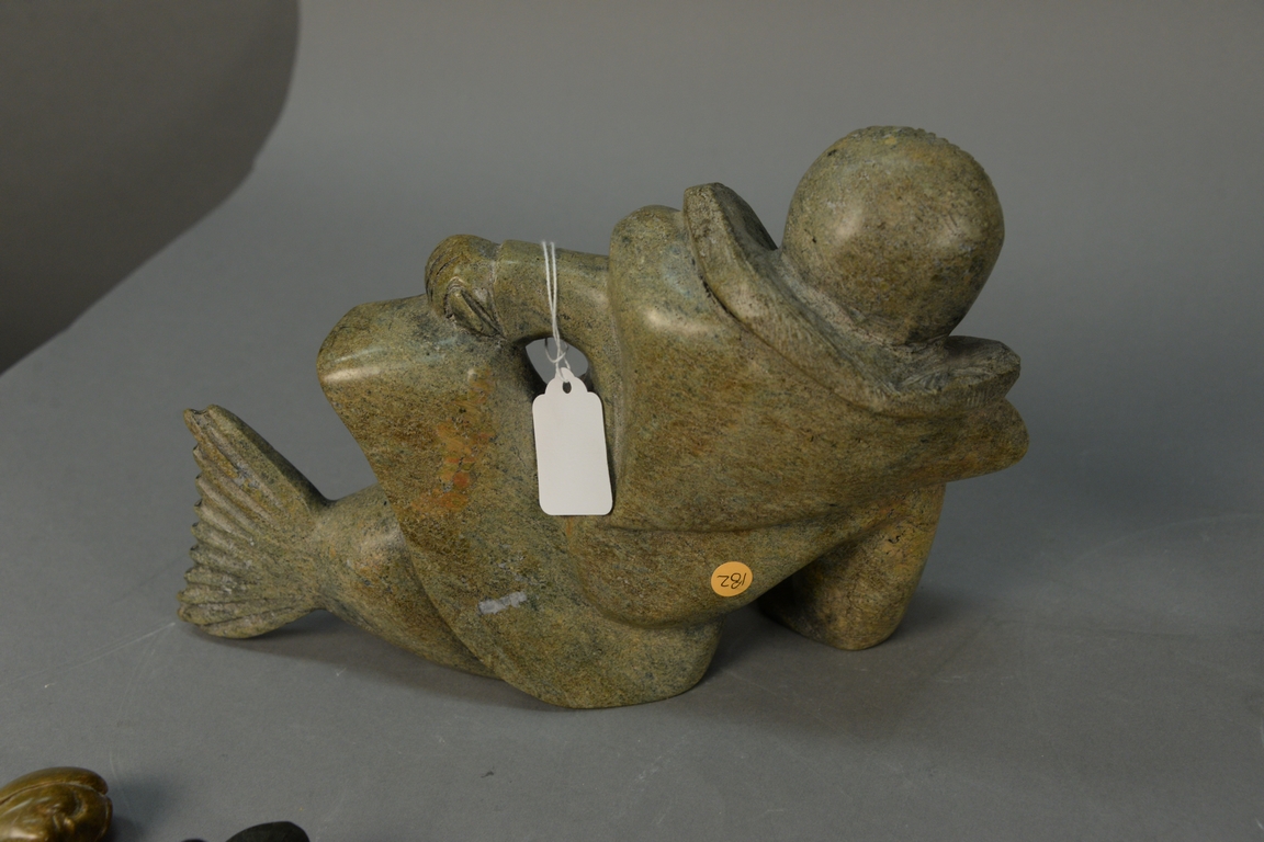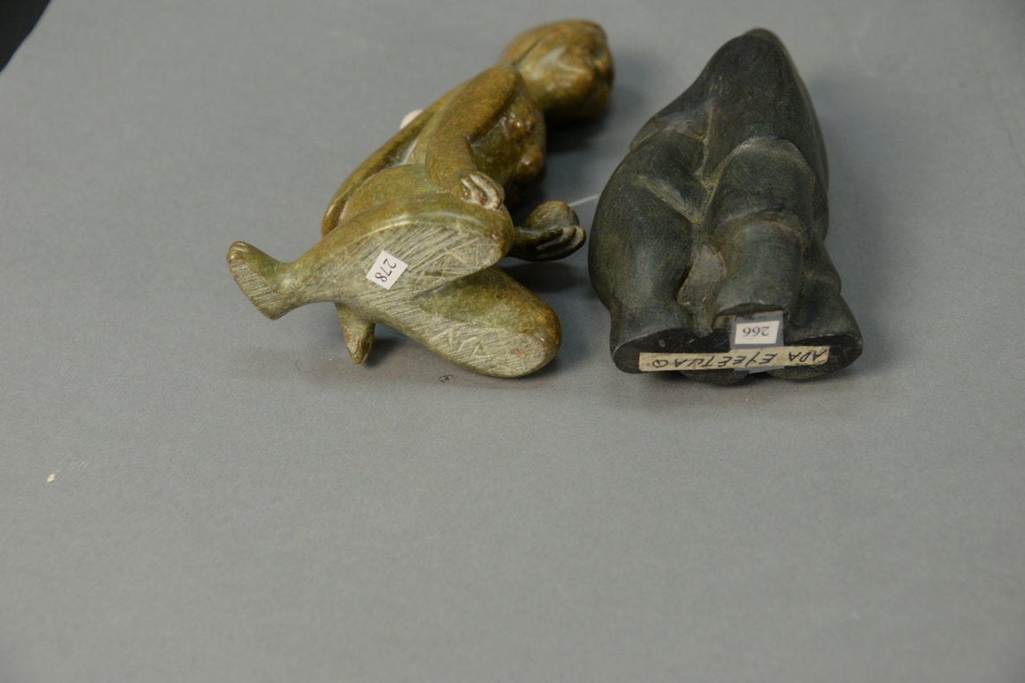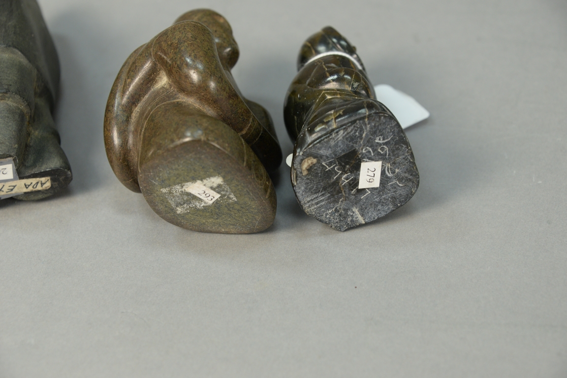 Five Inuit Eskimo figural carvings to include Conlucy Nayoumealook 1891-1958 Inukjuak dark green soapstone Kneeling Woman circa 1950 Provenance: Waddington’s Toronto Canada, 3 1/4, Lake Harbour 1965 Seated Woman Provenance: Gallerie Elca London Montreal, Canada, Ada Eyetoaq 1934 Baker Lake basalt Two Inuks Embracing 4 1/2in., Pudlat serpentine sedna ht. 7in., lg. 10in., and Oopik b. 1946 Cape Dorset green soapstone Girl Washing Provenance: Waddington’s Toronto Canada, 5.