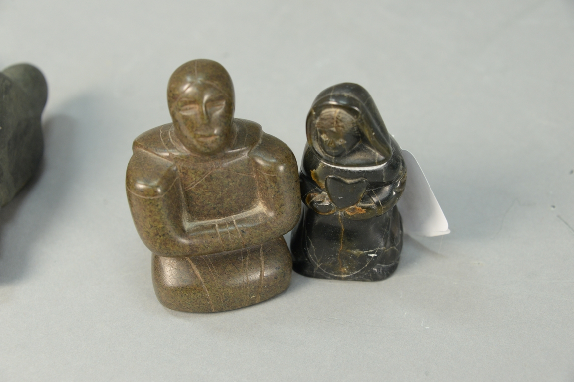 Lot 451: Five Inuit Eskimo figural carvings to include Conlucy Nayoumealook 1891-1958 Inukjuak dark green soapstone Kneeling Woman circa 19…