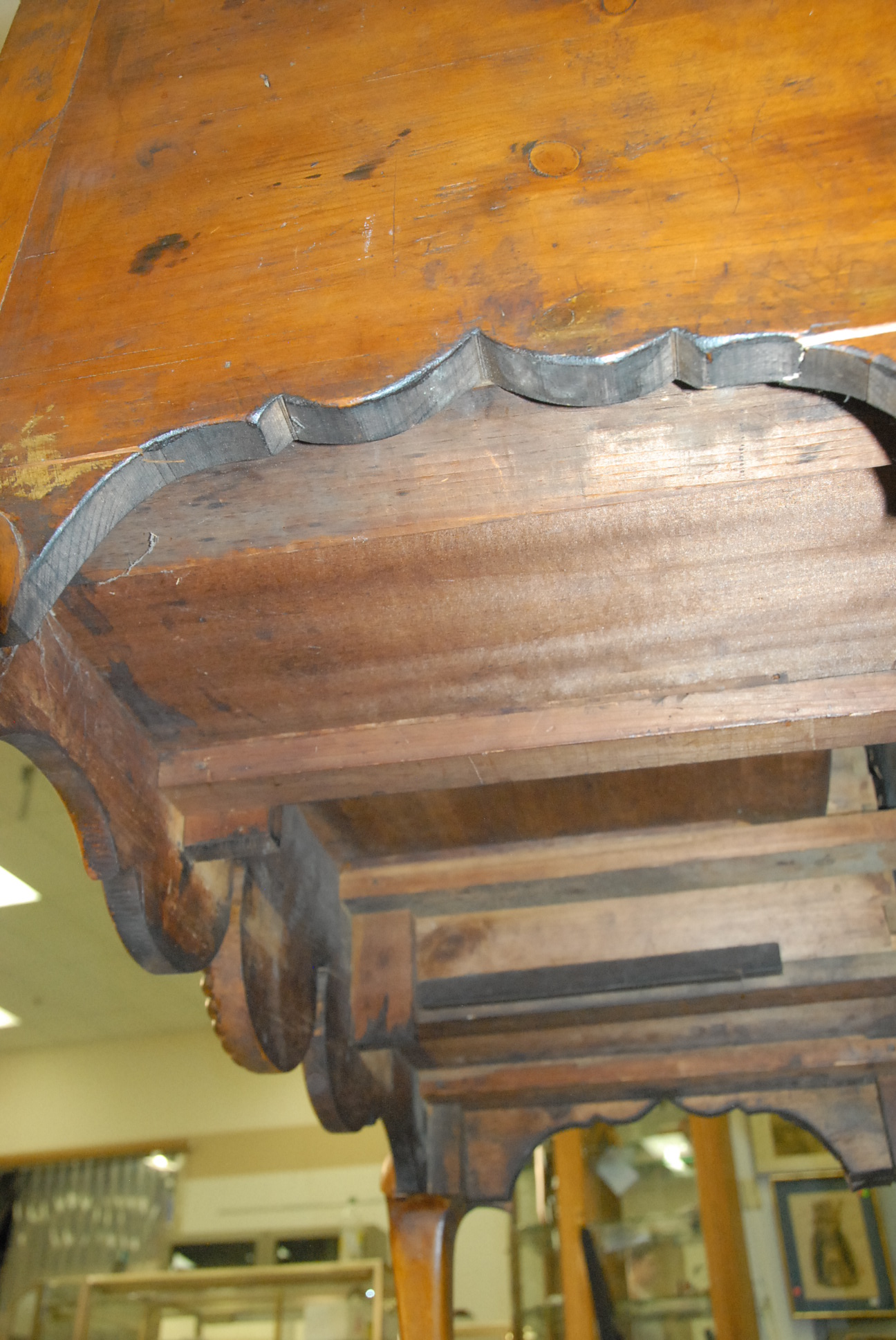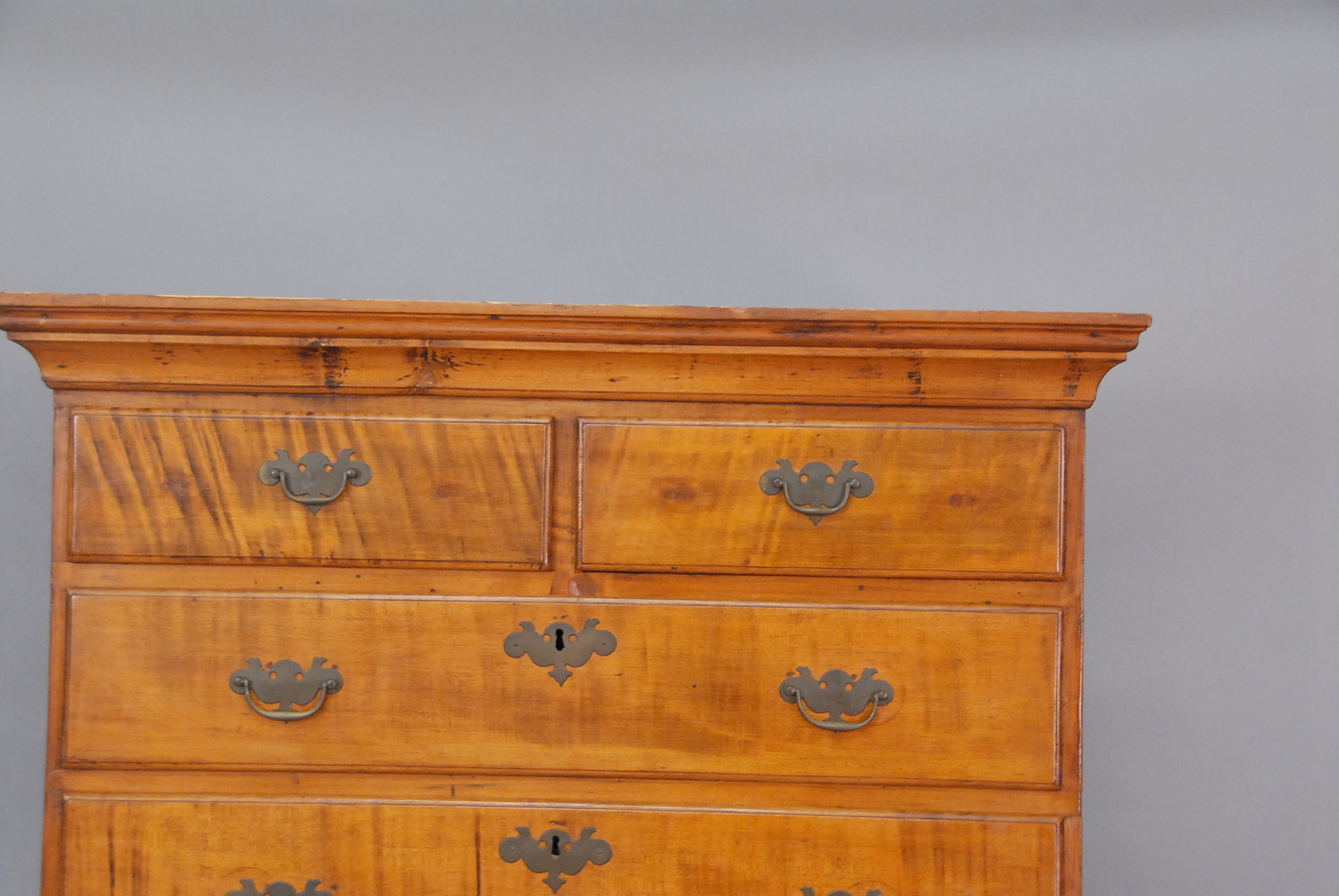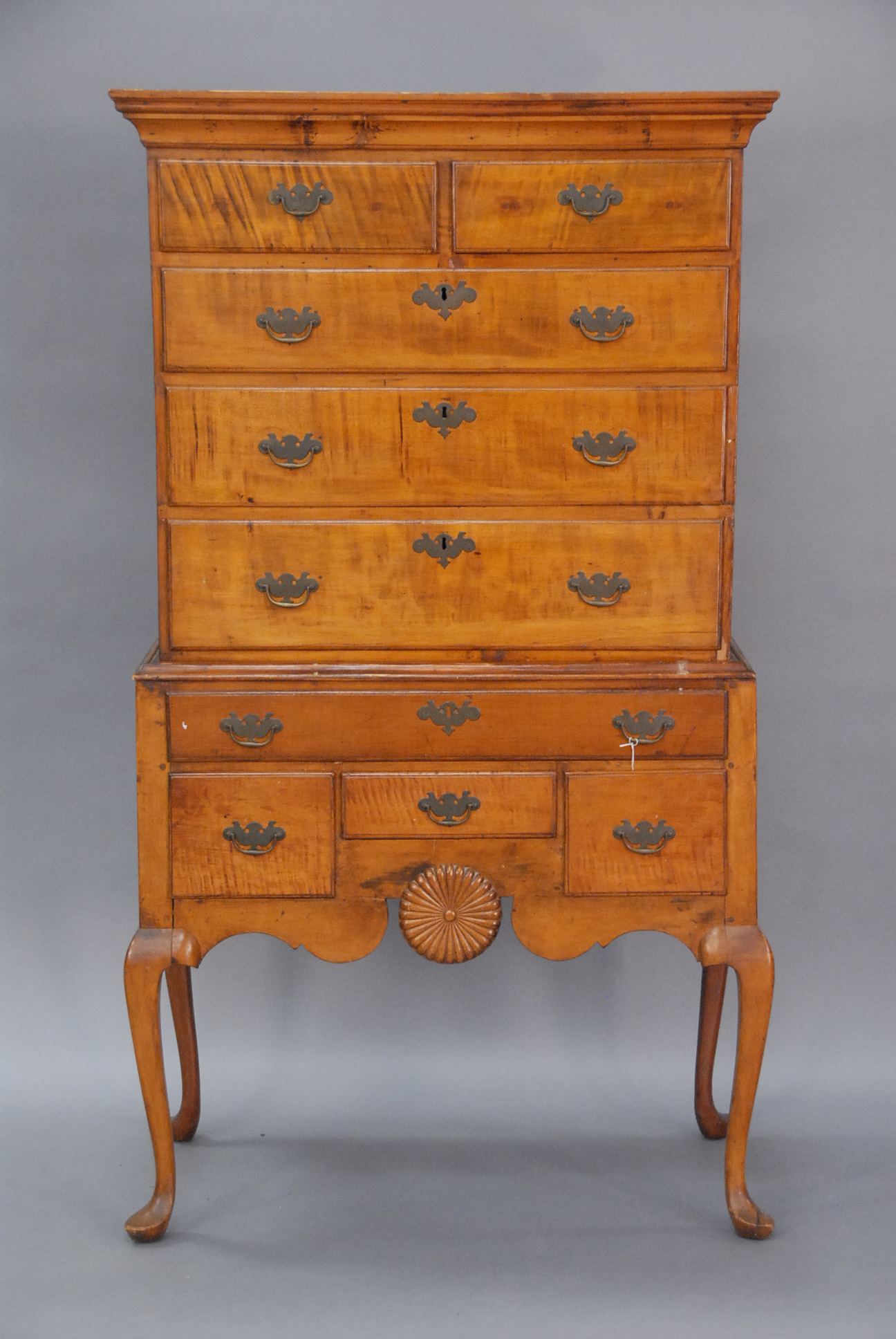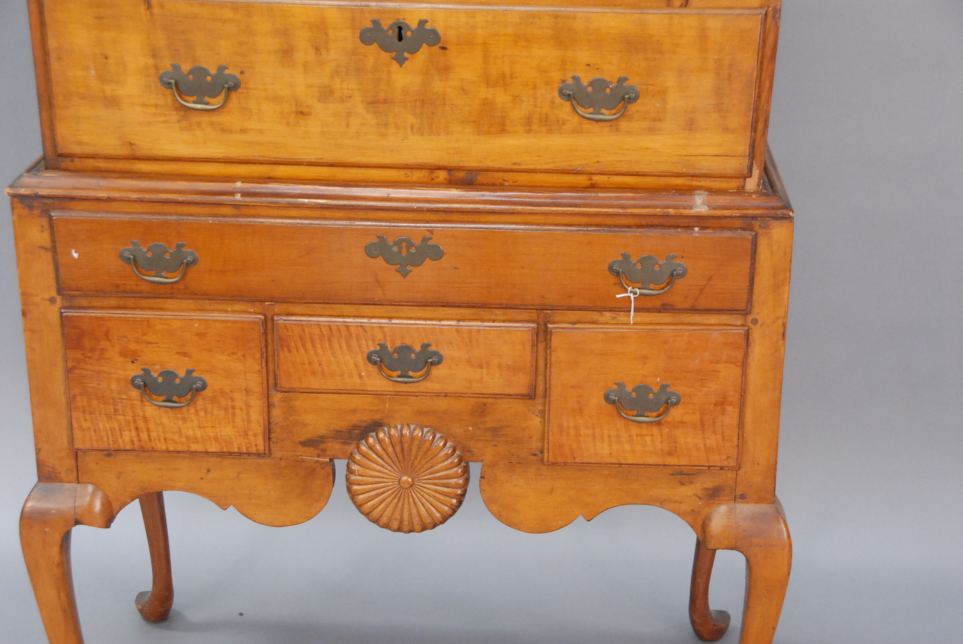 Flat top Queen Anne highboy maple and cherry with circular carved wheel in base on cabriole legs ending in pad feet, married.
