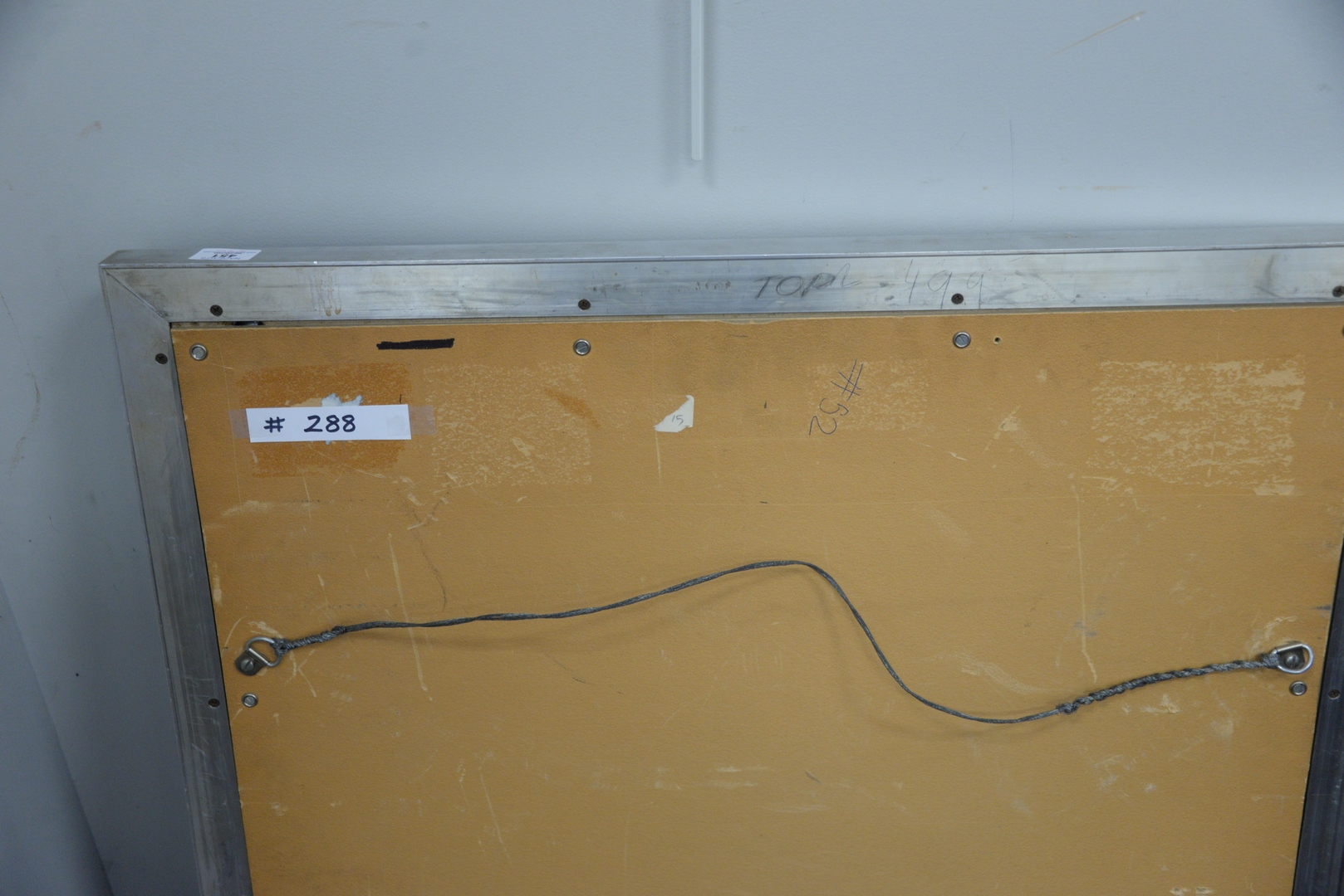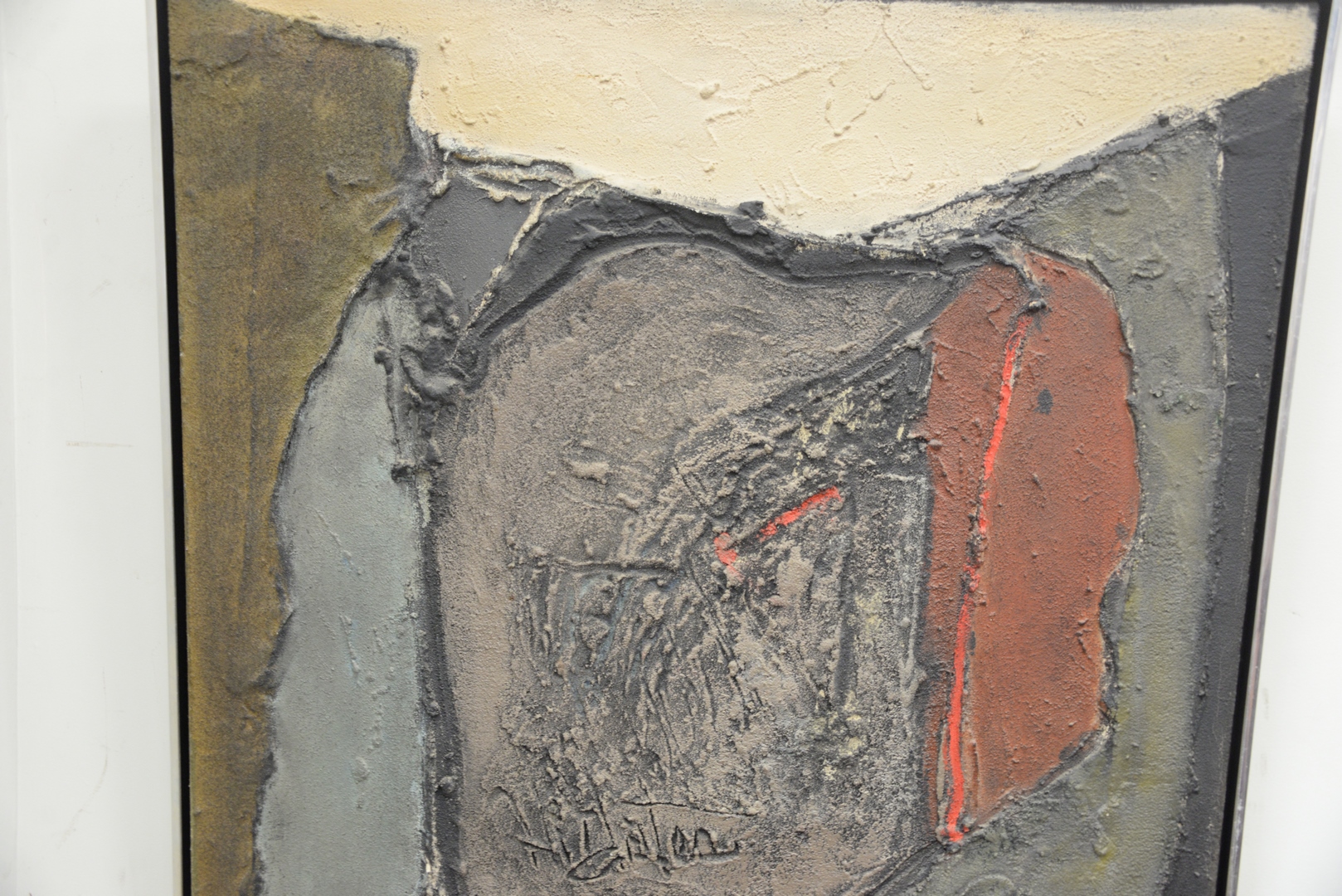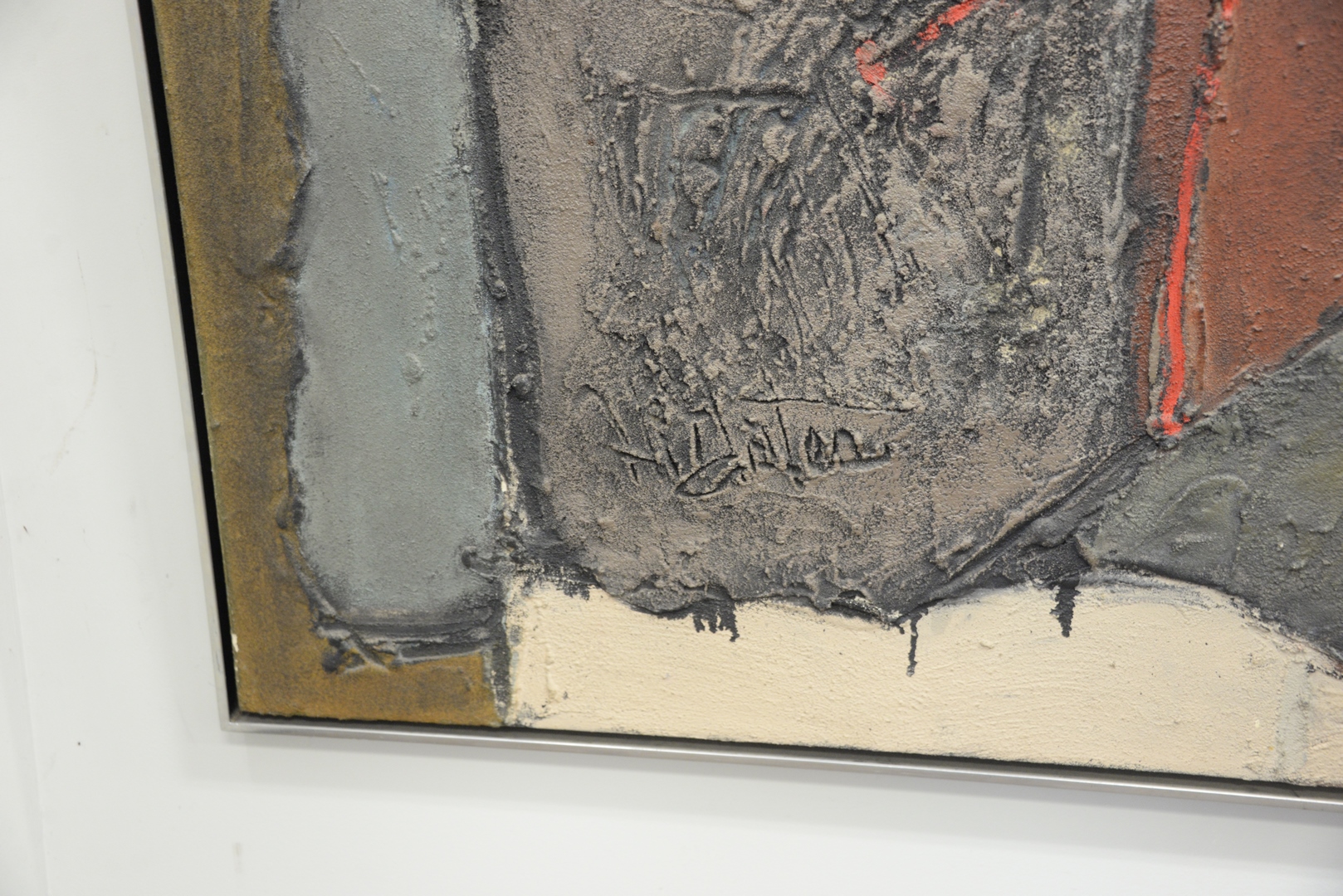 Lot 451: Harry Irving Gates (American, b. 1934), Bridge Image, mixed media with sand on canvas, signed lower center “H. Gates”, 33″ x 31″.