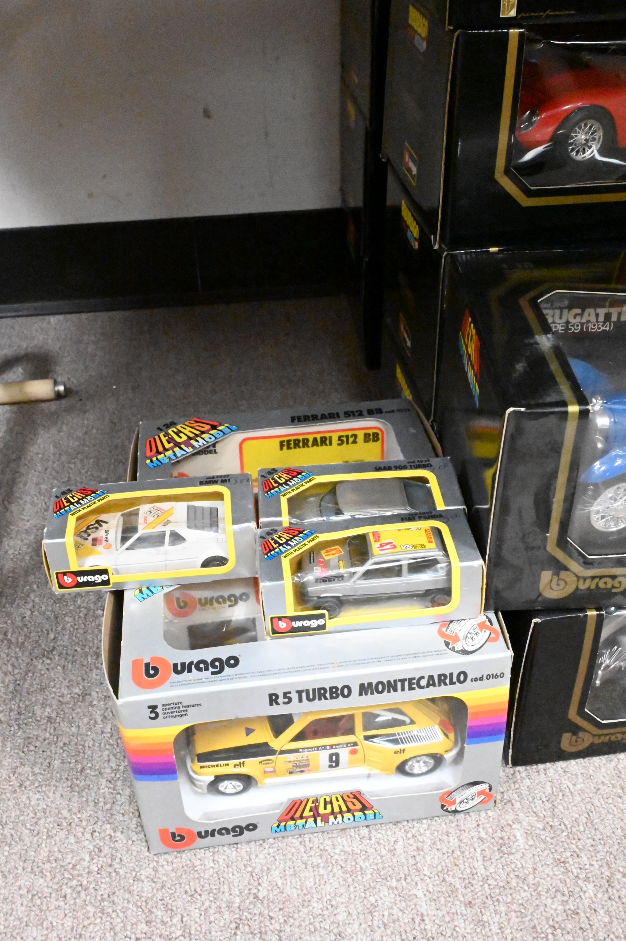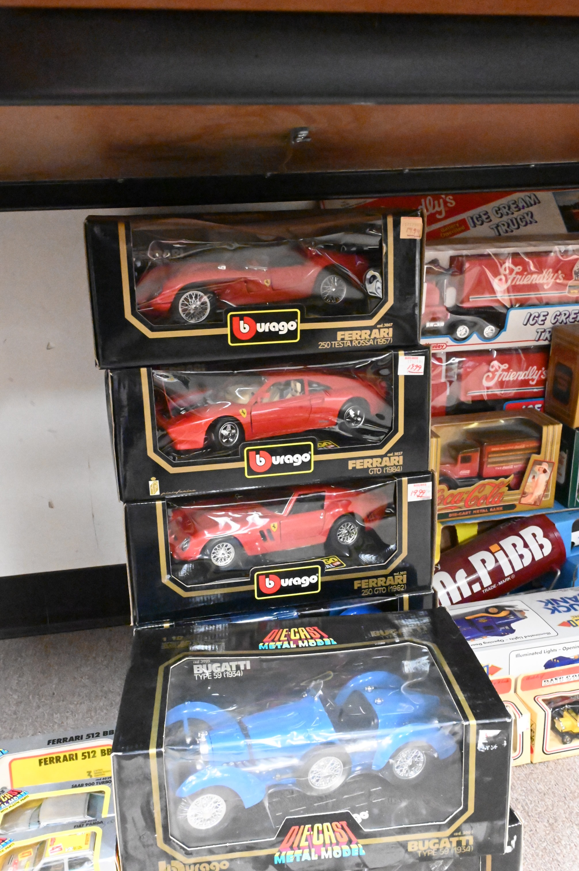 Lot of 21 Burago Diecast Metal Model Cars, to include Ferrari 250 Testa Rossa (1937), Bugatti Type 59 RS Turbo Monte Carlo, along with a Ferrari GTO (1984), etc., all in original packaging, (as is).