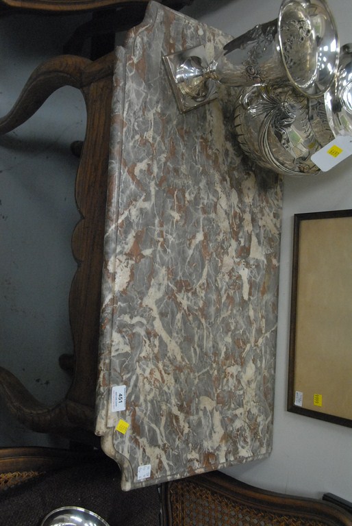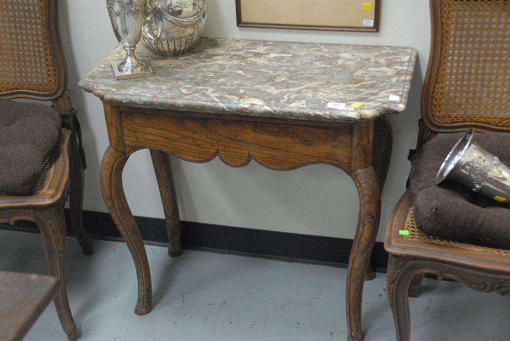 Lot 451: Louis XV provincial fruitwood low table with a rectangular scalloped grey marble top above a carved apron raised on cabriole legs, r…