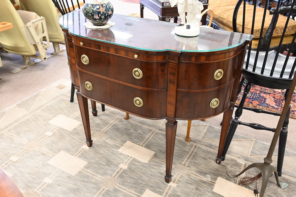 Pair of Joseph Gerte Custom Mahogany Servers, having custom glass tops and pull out slides over drawers flanked by doors, top having rosewood banding, height 34 inches, top 18″ x 34 1/4″.