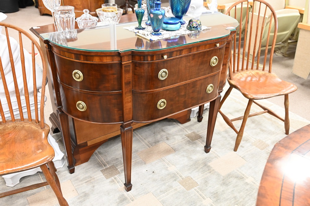 Lot 451: Pair of Joseph Gerte Custom Mahogany Servers, having custom glass tops and pull out slides over drawers flanked by doors, top having rosewood banding, height 34 inches, top 18″ x 34 1/4″.